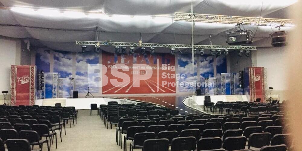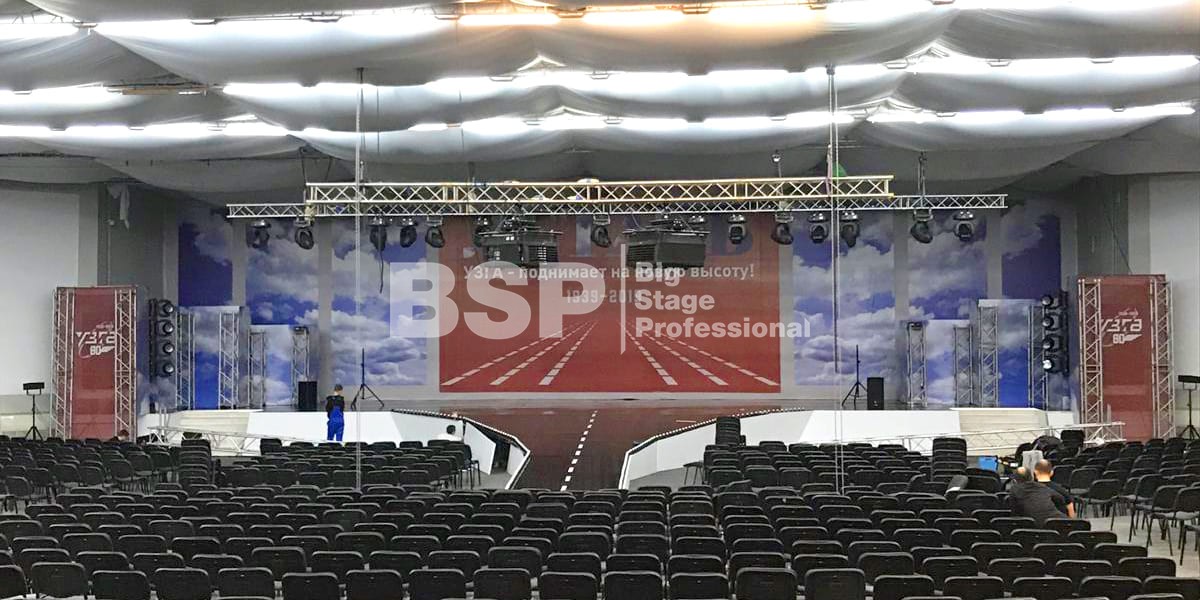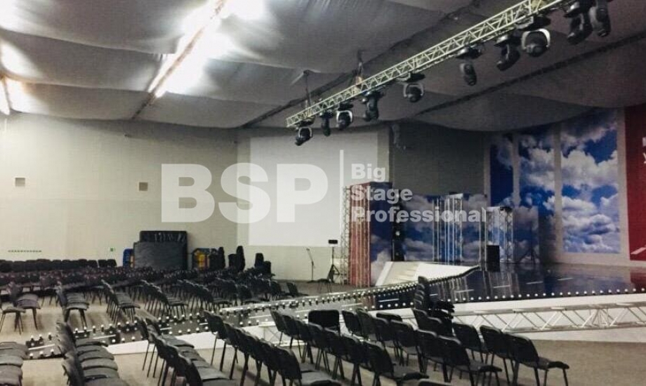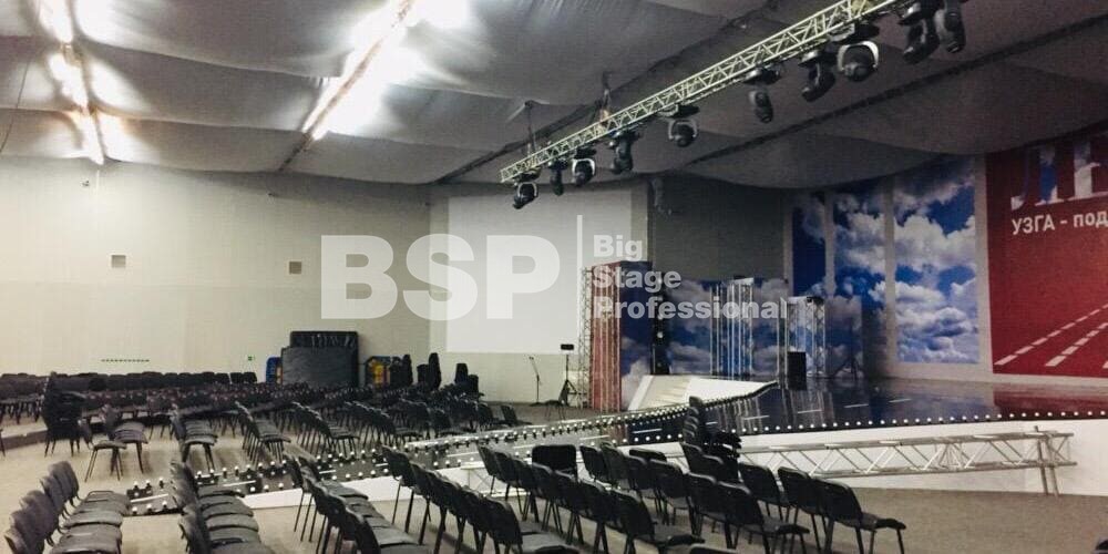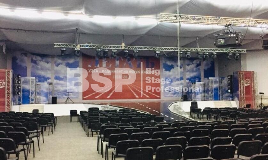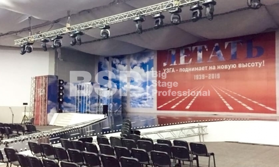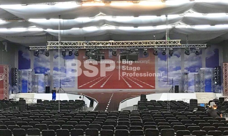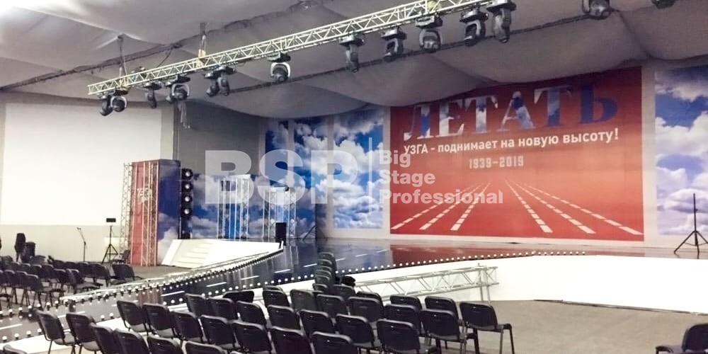 В МВЦ "Екатеринбург Экспо" мы установили сценический планшет в форме взлётной полосы с подсветкой, множество конструкций для декораций из лайера и ферм, шатёр геокупол.