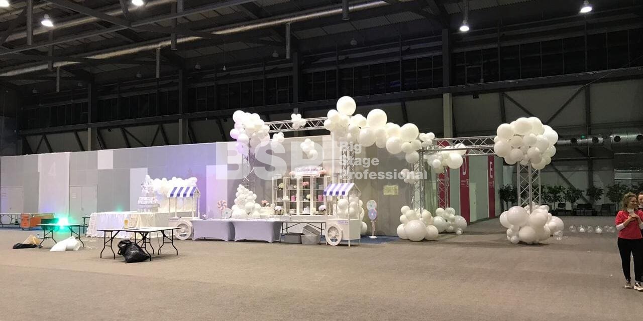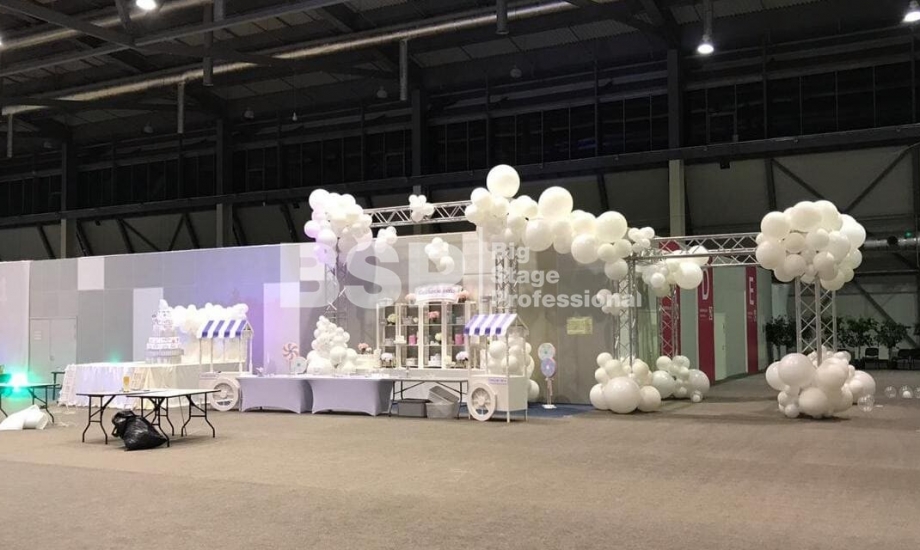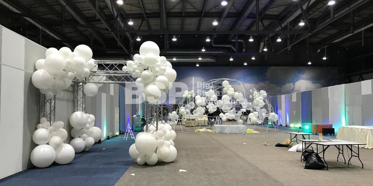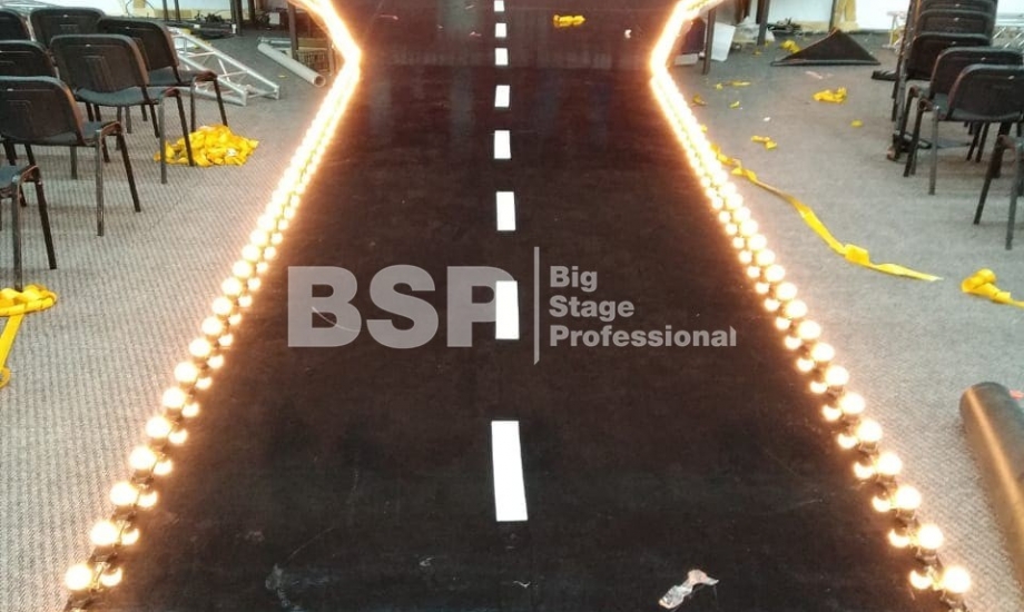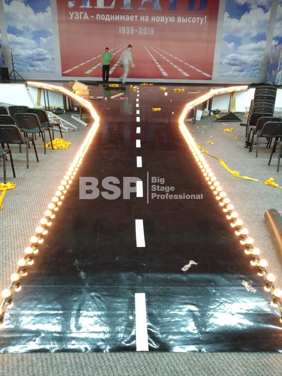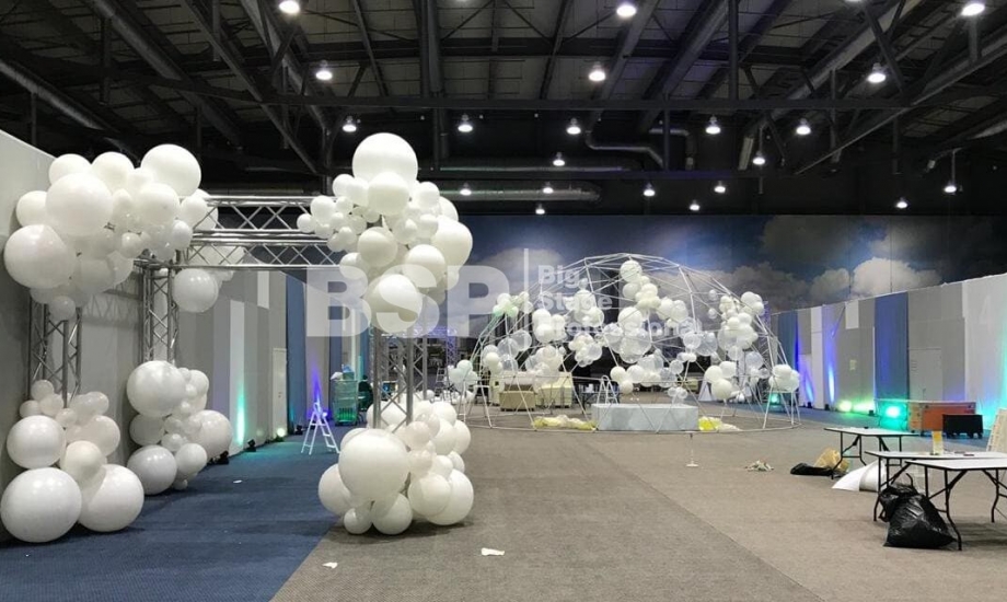 В МВЦ "Екатеринбург Экспо" мы установили сценический планшет в форме взлётной полосы с подсветкой, множество конструкций для декораций из лайера и ферм, шатёр геокупол.