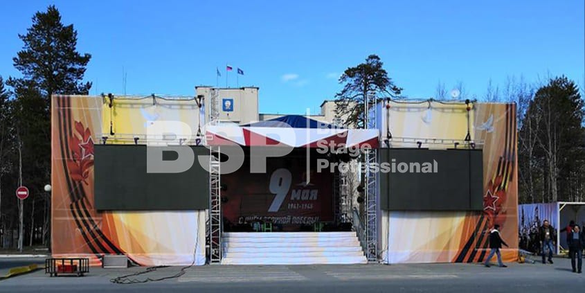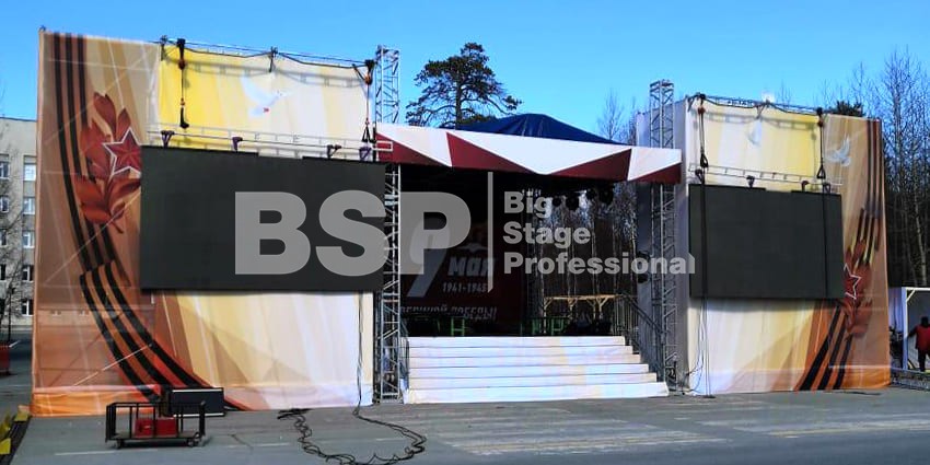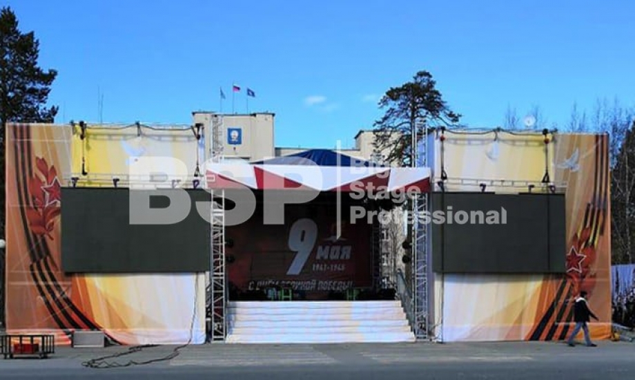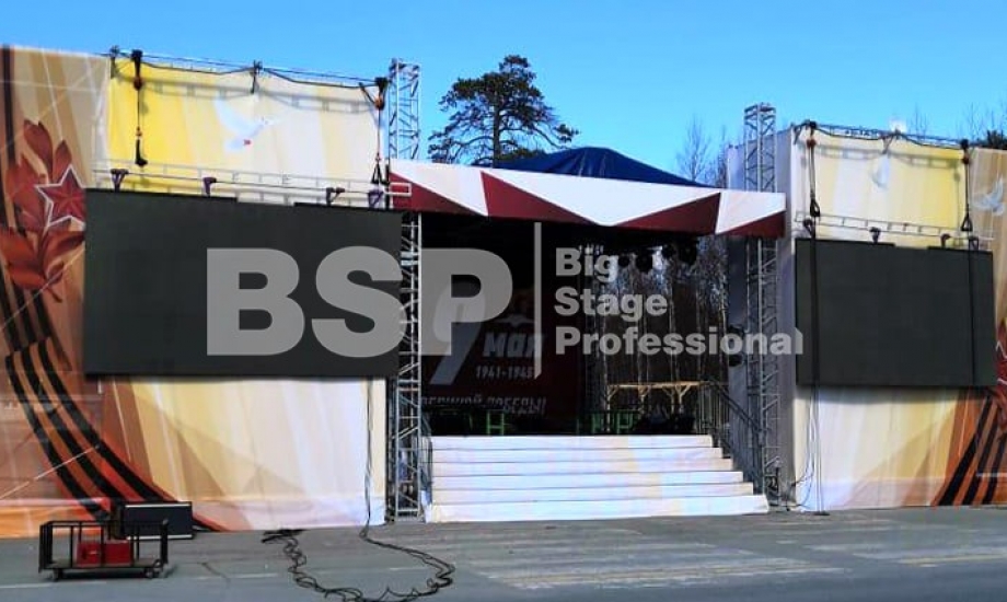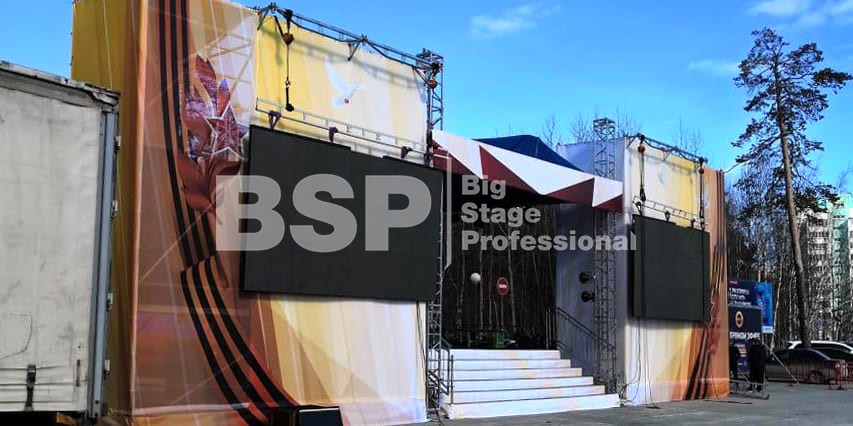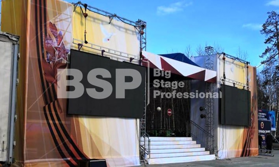 Мы установили сценический комплекс с конструктивом для двух экранов, пультовую, камерную платформу, предоставили световое и грузоподъемное оборудование, и комплект раций.