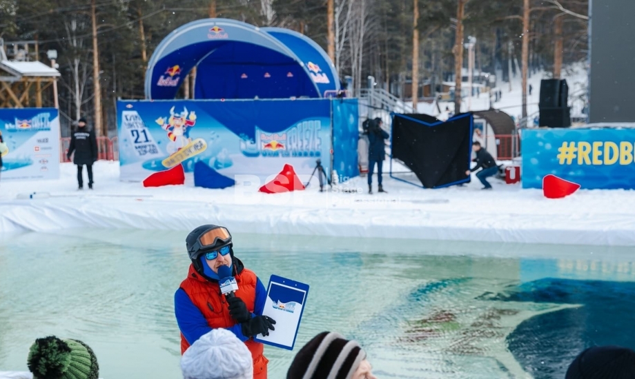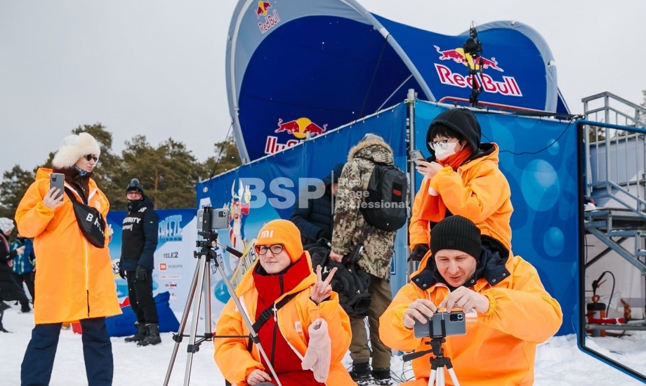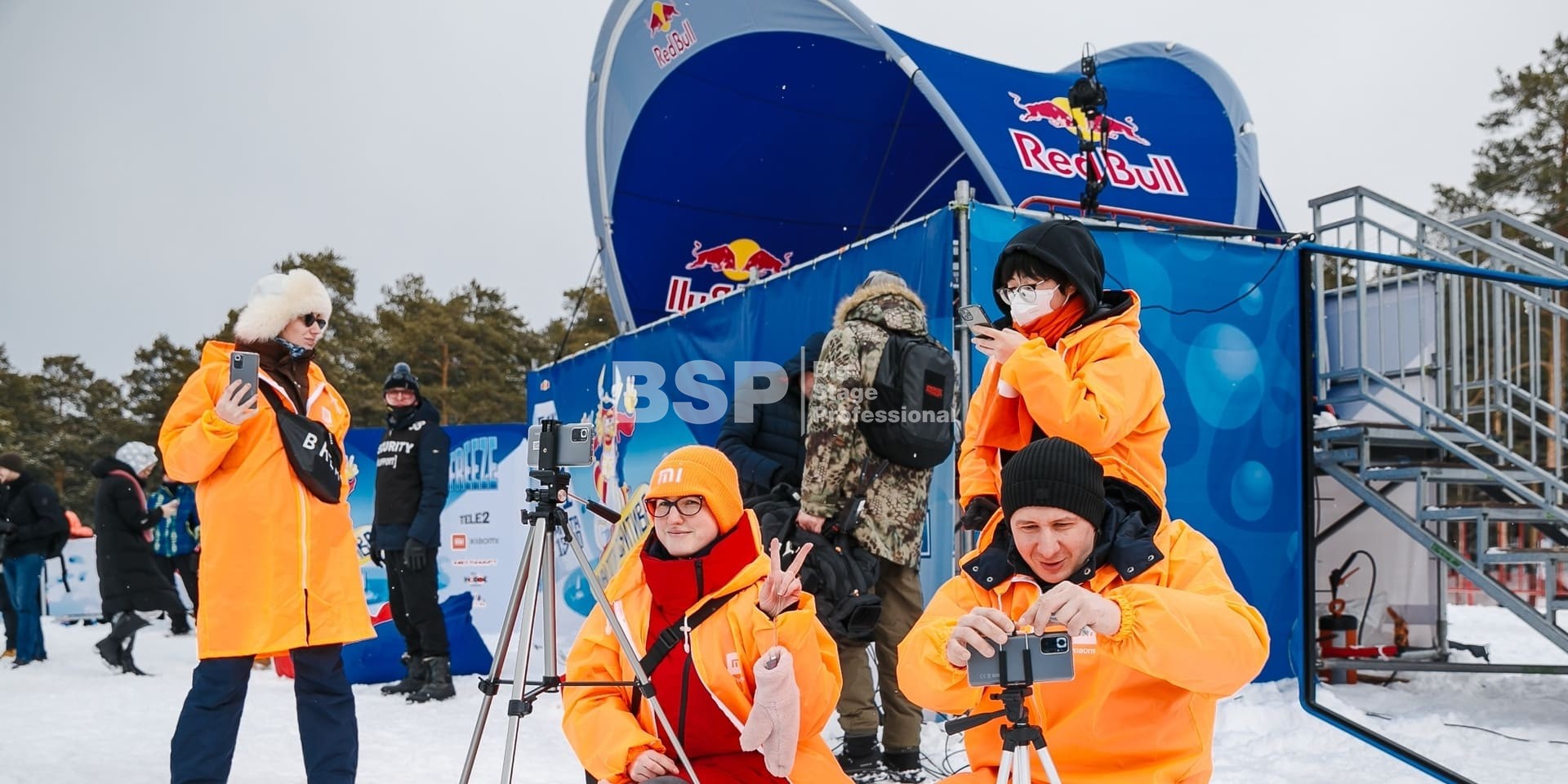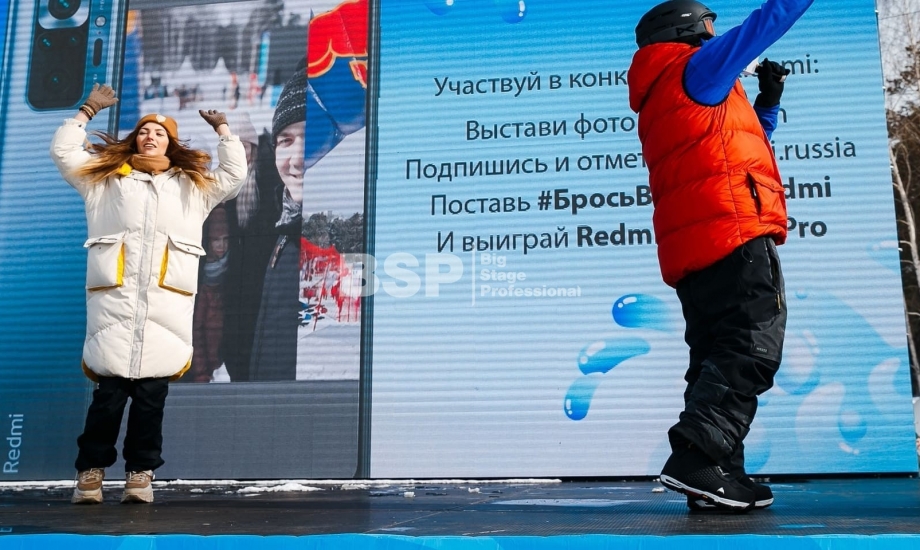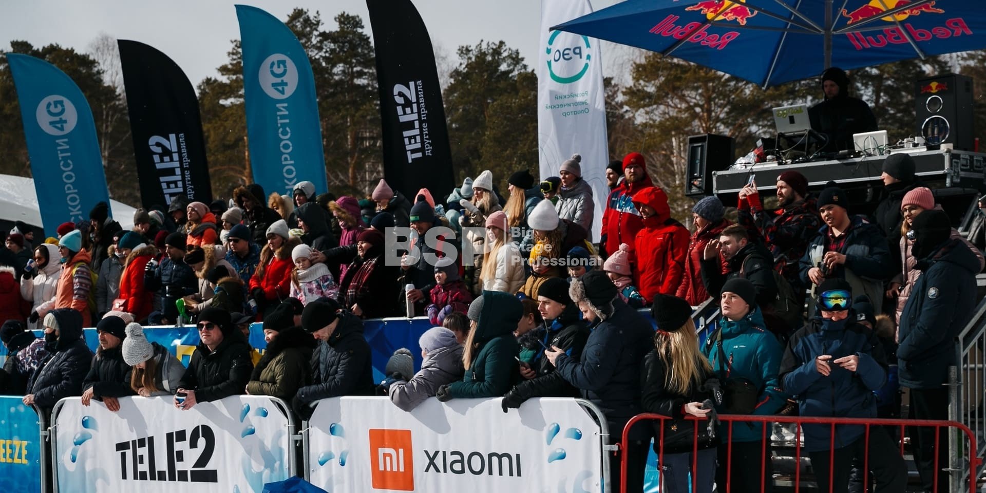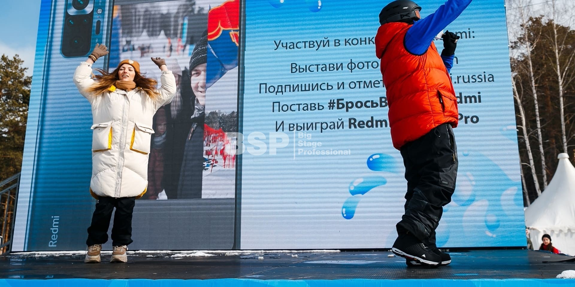 На горнолыжном курорте «Уктус» мы установили зрительскую трибуну с диджейской зоной, фотозону, два сценических подиума, один из которых для награждения и ведущего с конструктивом под экран на заднике сцены, а второй, крытый - для судей, предоставили фан-барьеры.