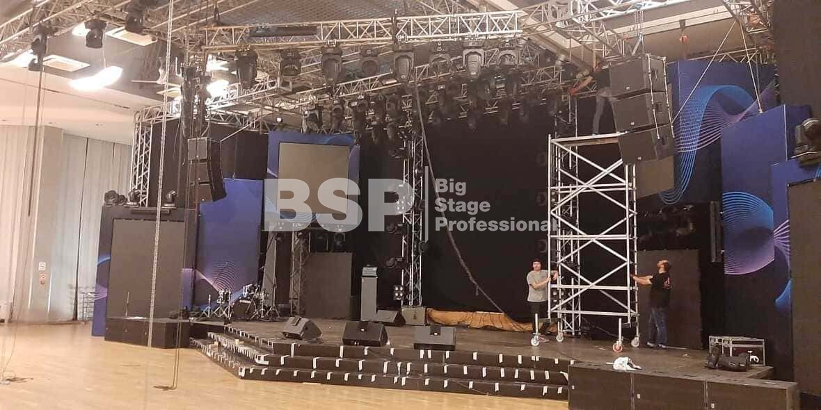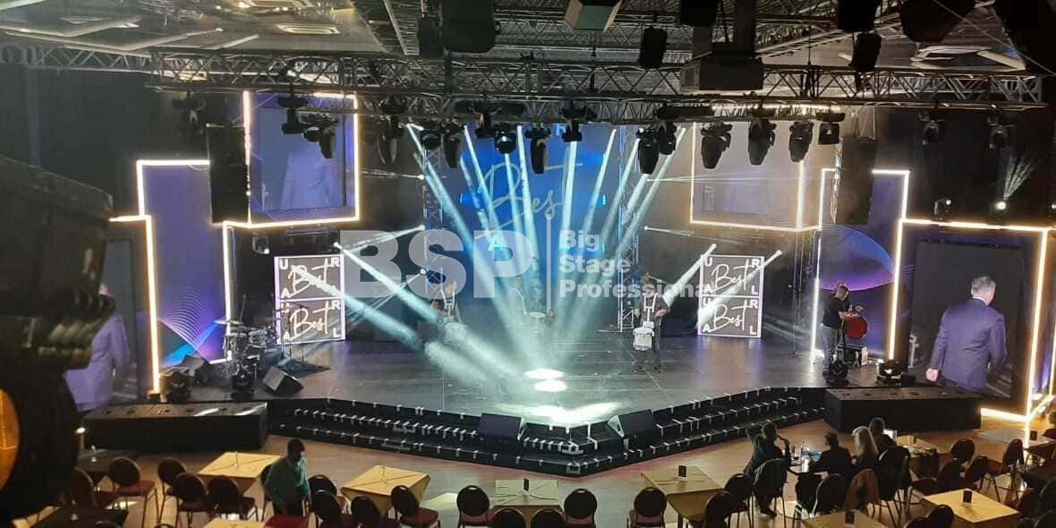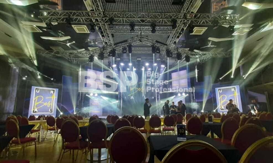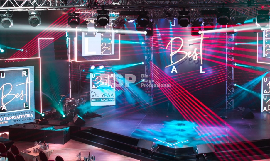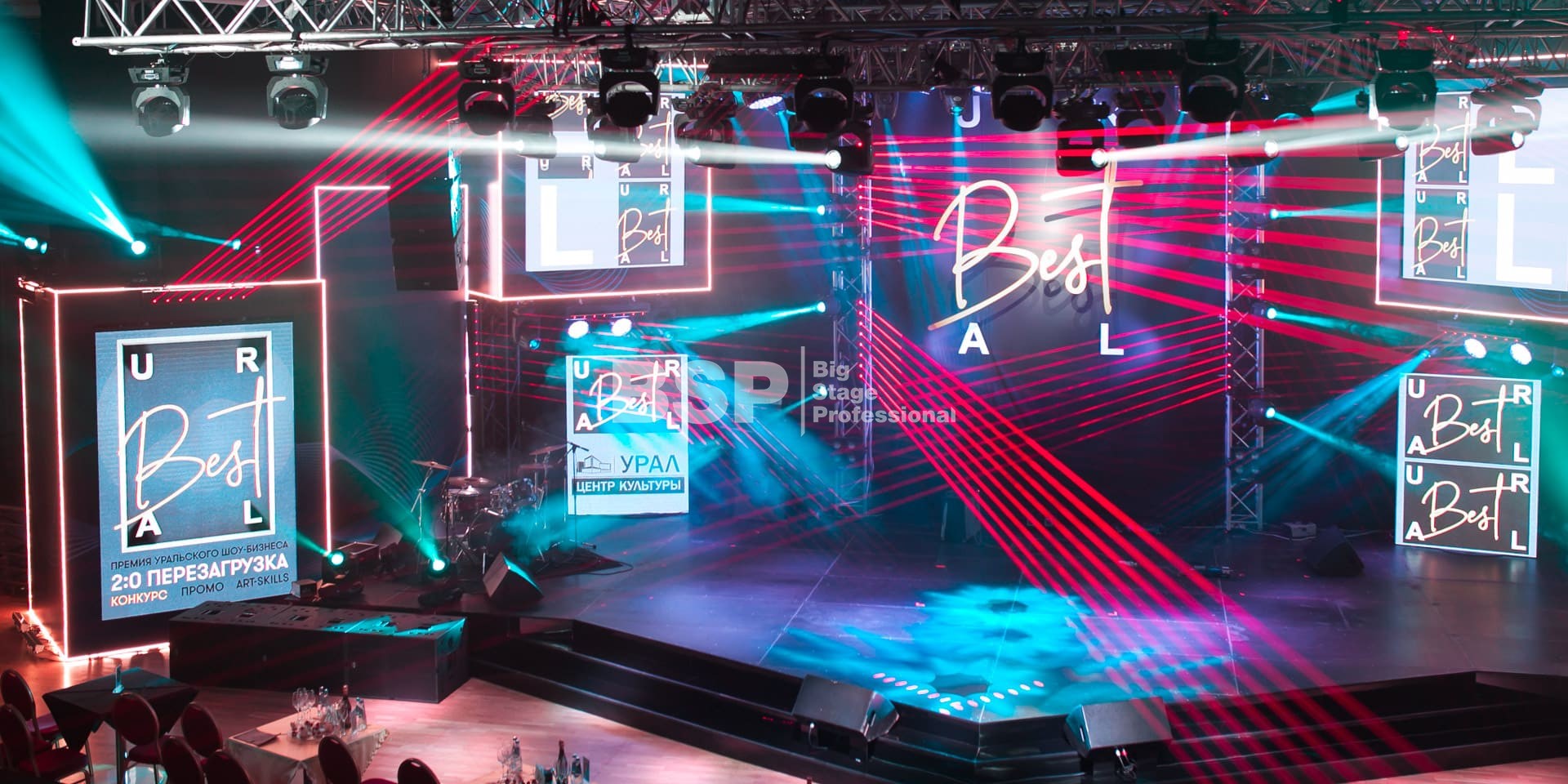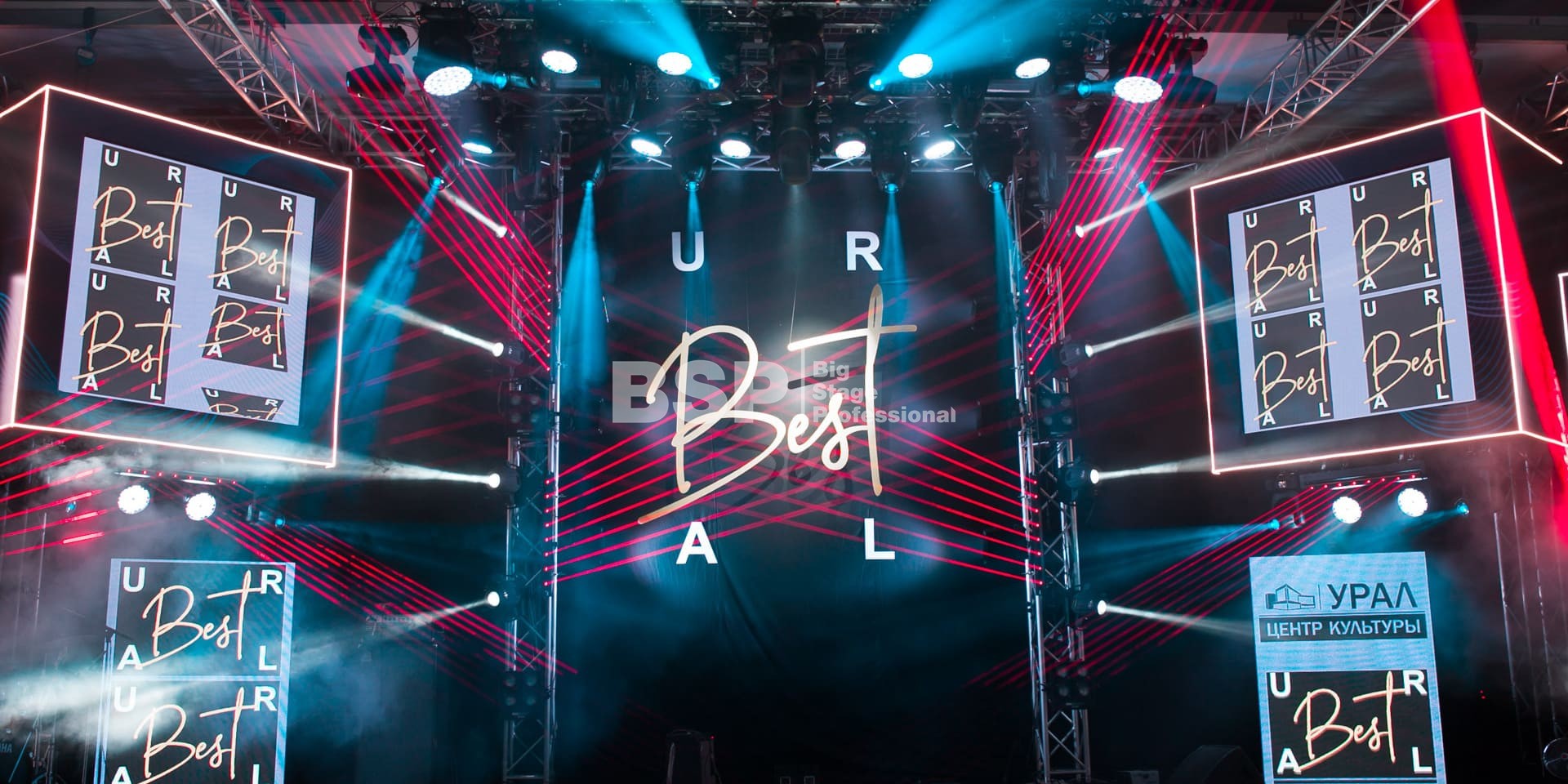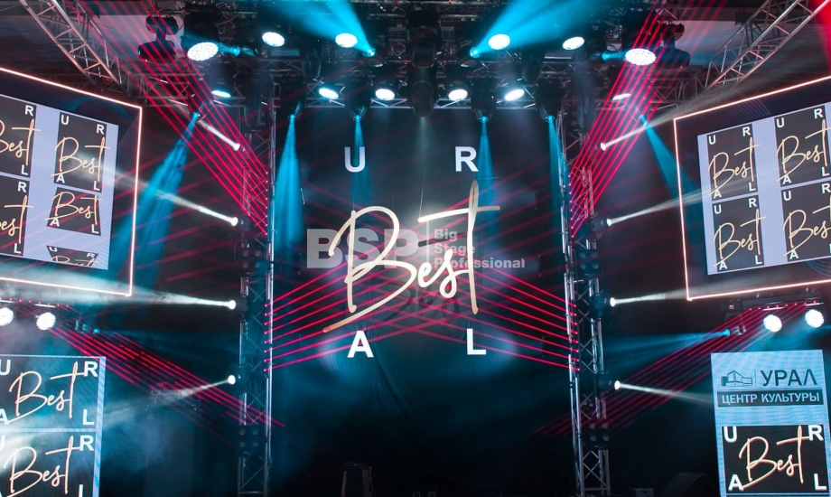 В Центре культуры «Урал» мы установили сценический планшет с необычным задником, фермовые конструкции, звуковое и световое оборудование.
