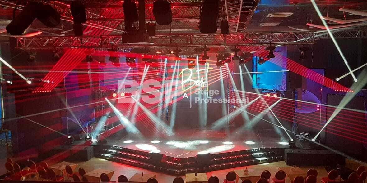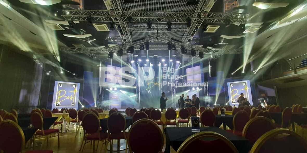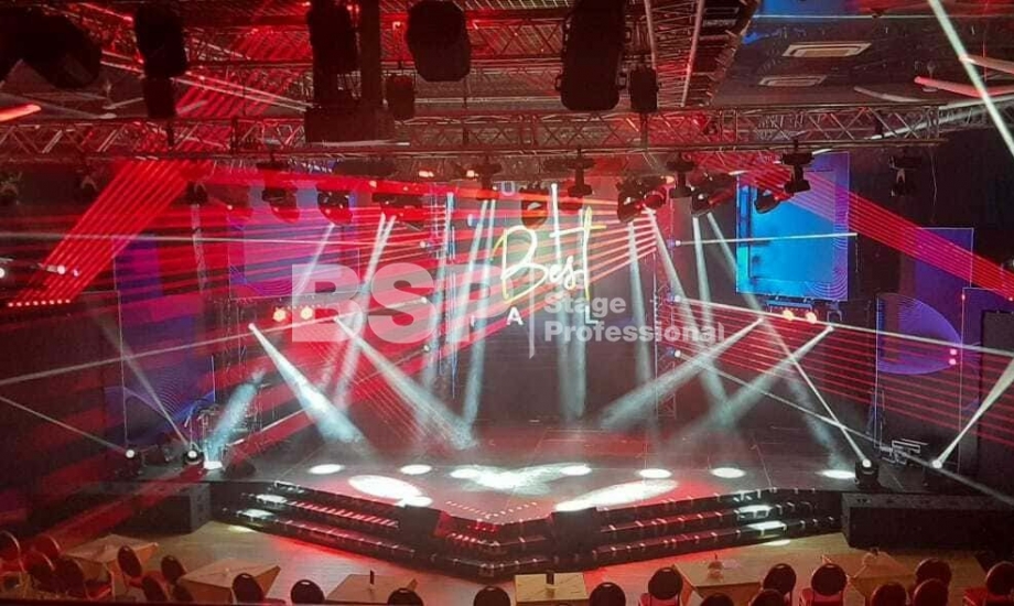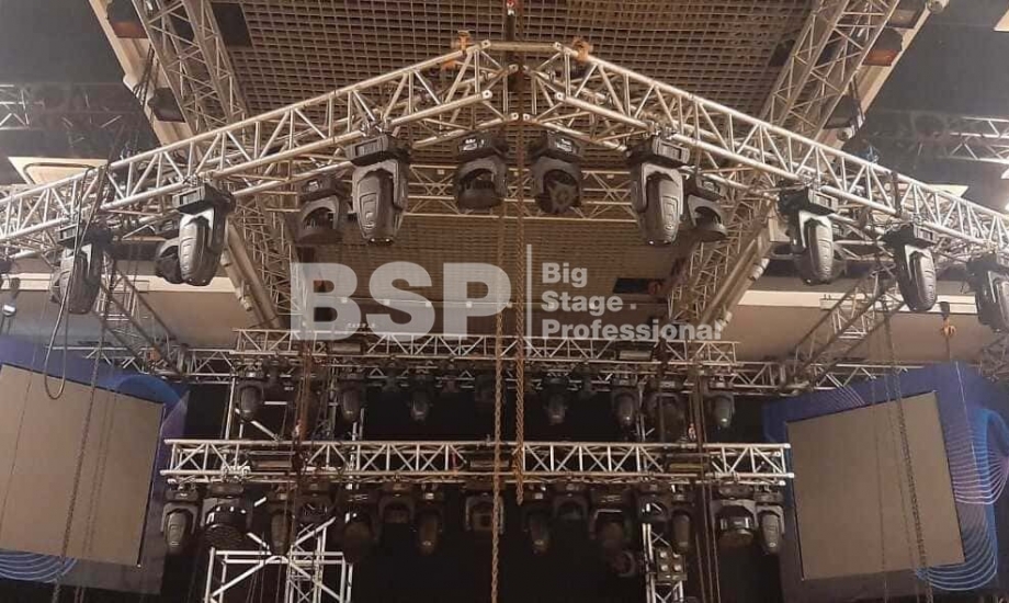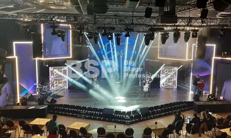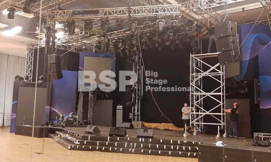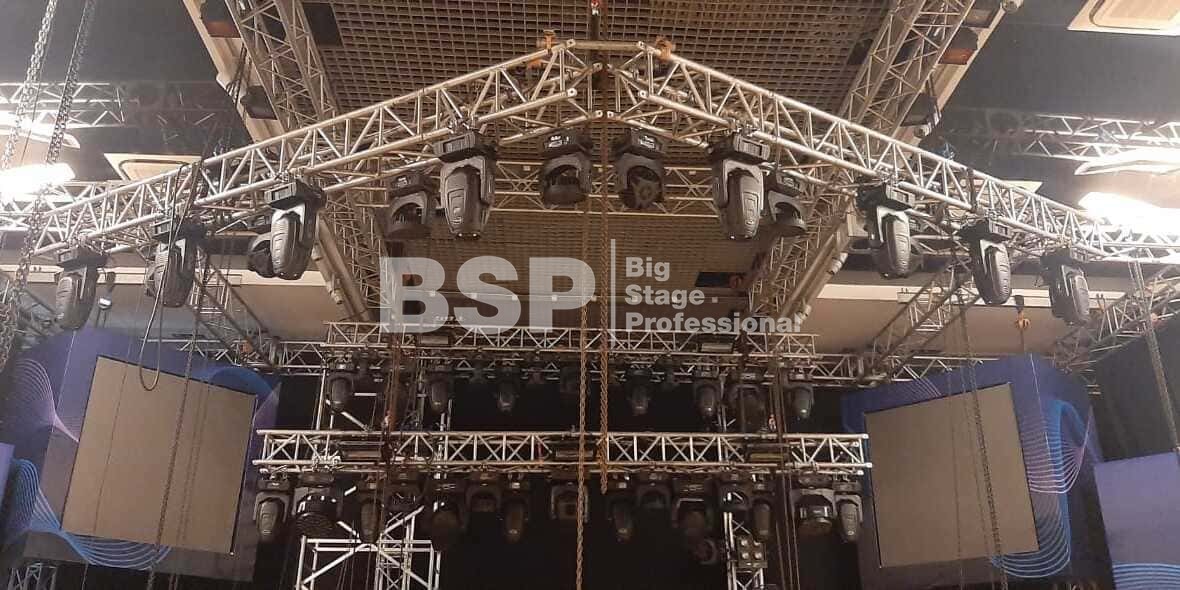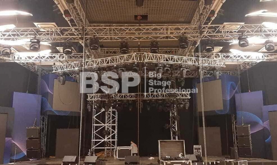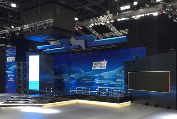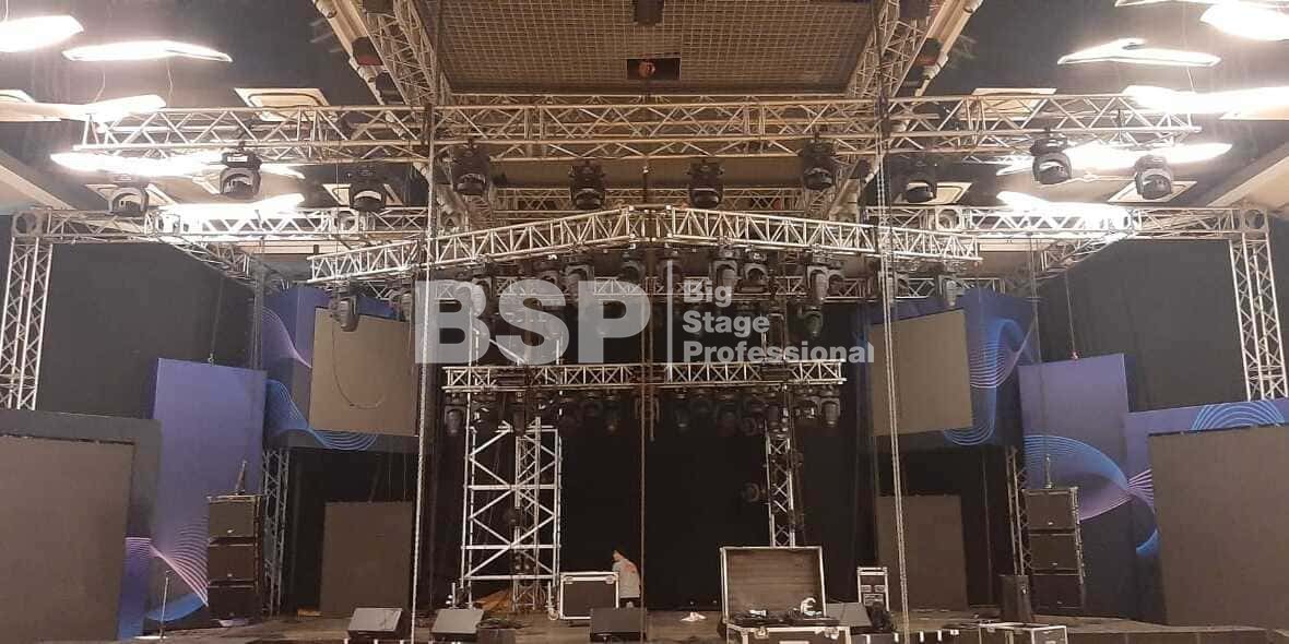 В Центре культуры «Урал» мы установили сценический планшет с необычным задником, фермовые конструкции, звуковое и световое оборудование.