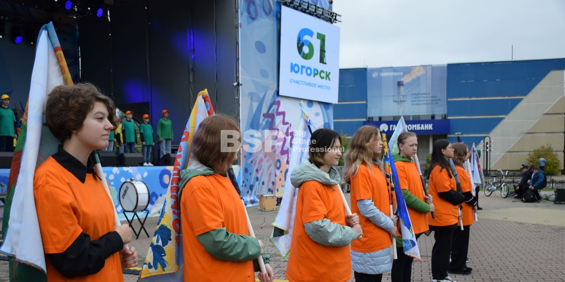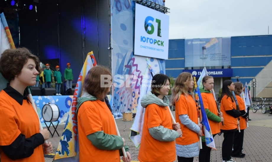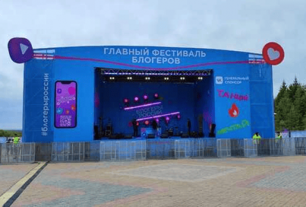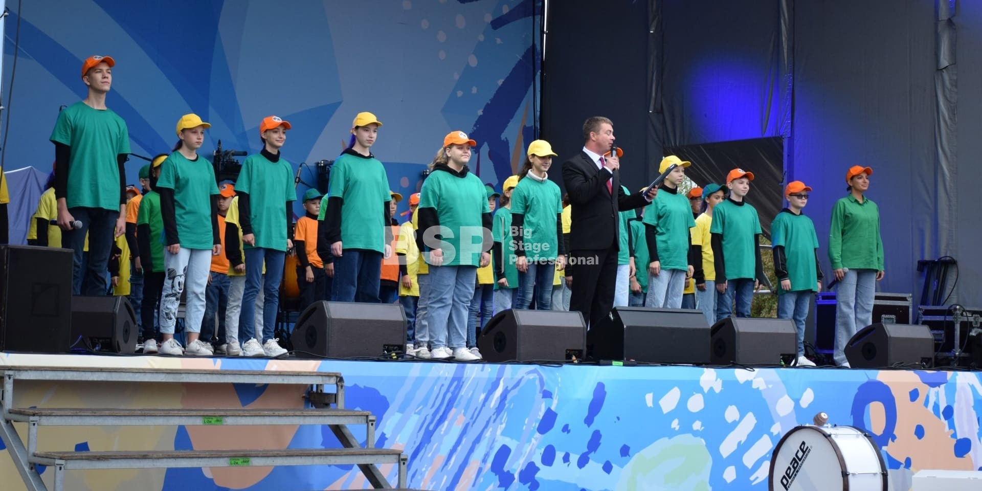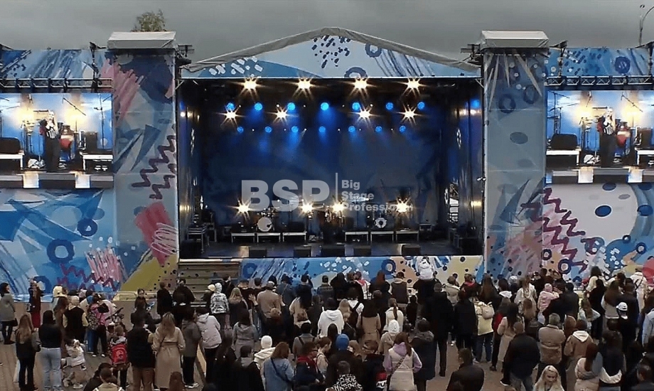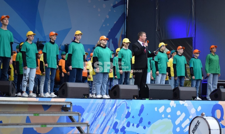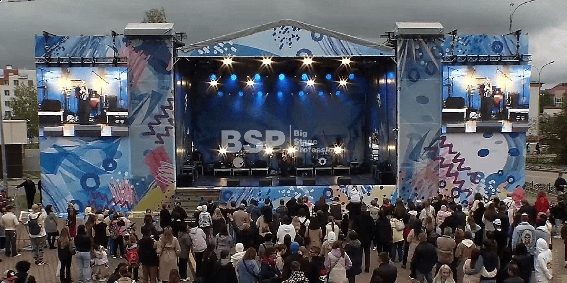 На Фонтанной площади им. Р. З. Салахова мы возвели главную сцену с конструктивом для светодиодных экранов, установили пультовую с подиумом для операторов на втором уровне, и световое и звуковое оборудование.