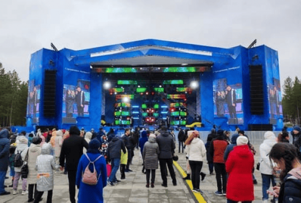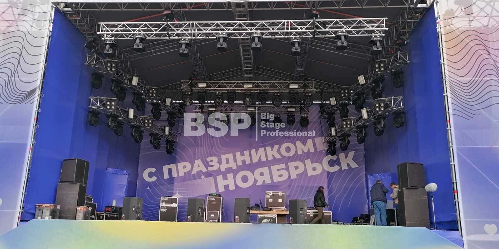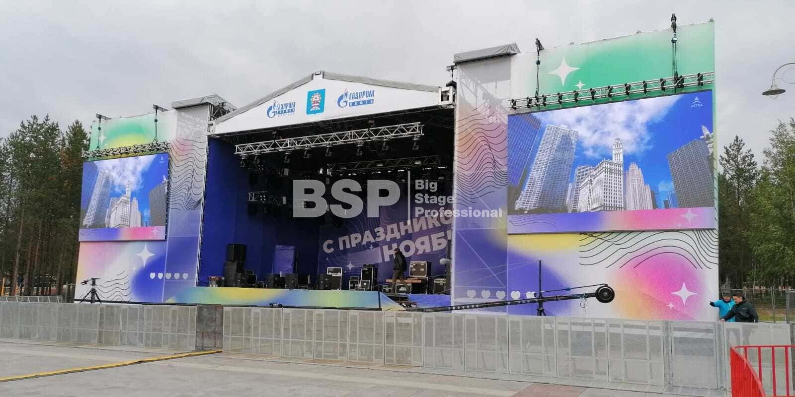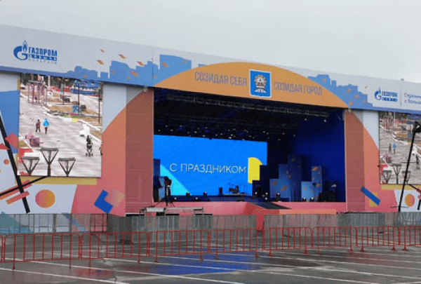 В Ноябрьск-парке мы установили главную сцену праздника, двухуровневую пультовую с конструкцией для экрана, камерные платформы, шатры, оснастили сцену световым и звуковым оборудованием, предоставили мобильные ограждения.