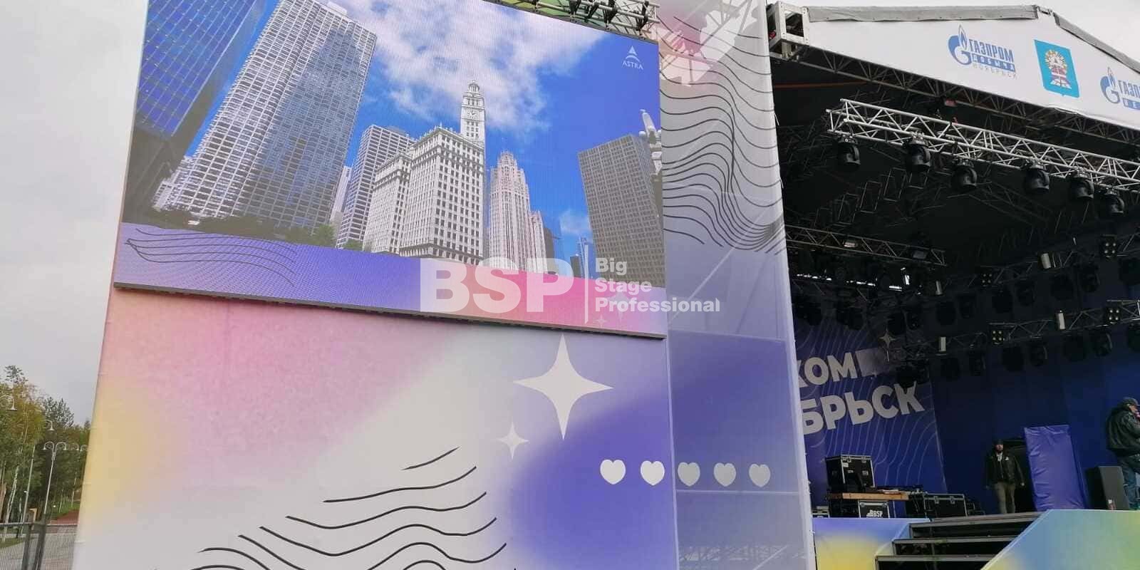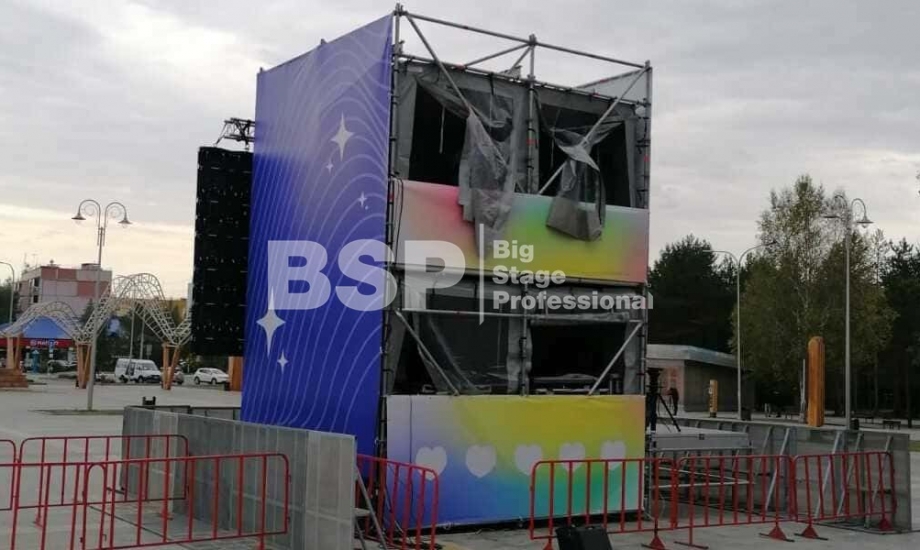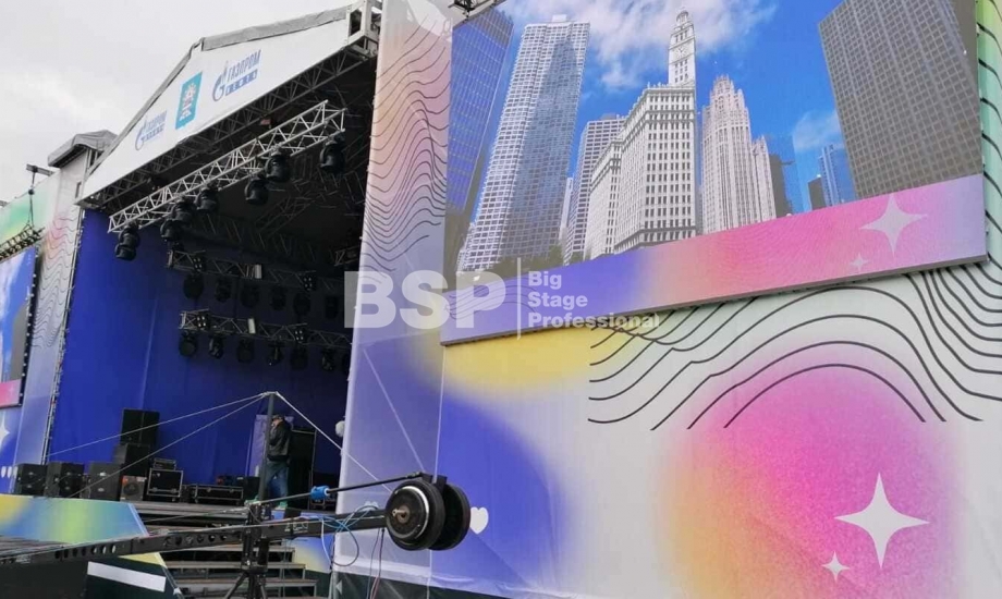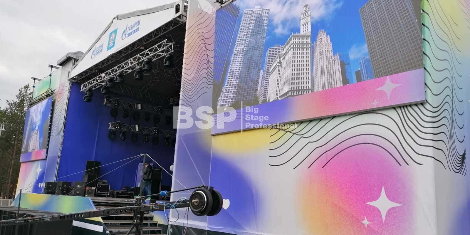 В Ноябрьск-парке мы установили главную сцену праздника, двухуровневую пультовую с конструкцией для экрана, камерные платформы, шатры, оснастили сцену световым и звуковым оборудованием, предоставили мобильные ограждения.