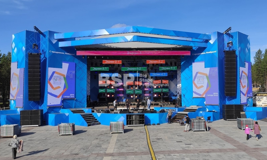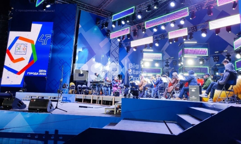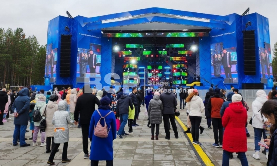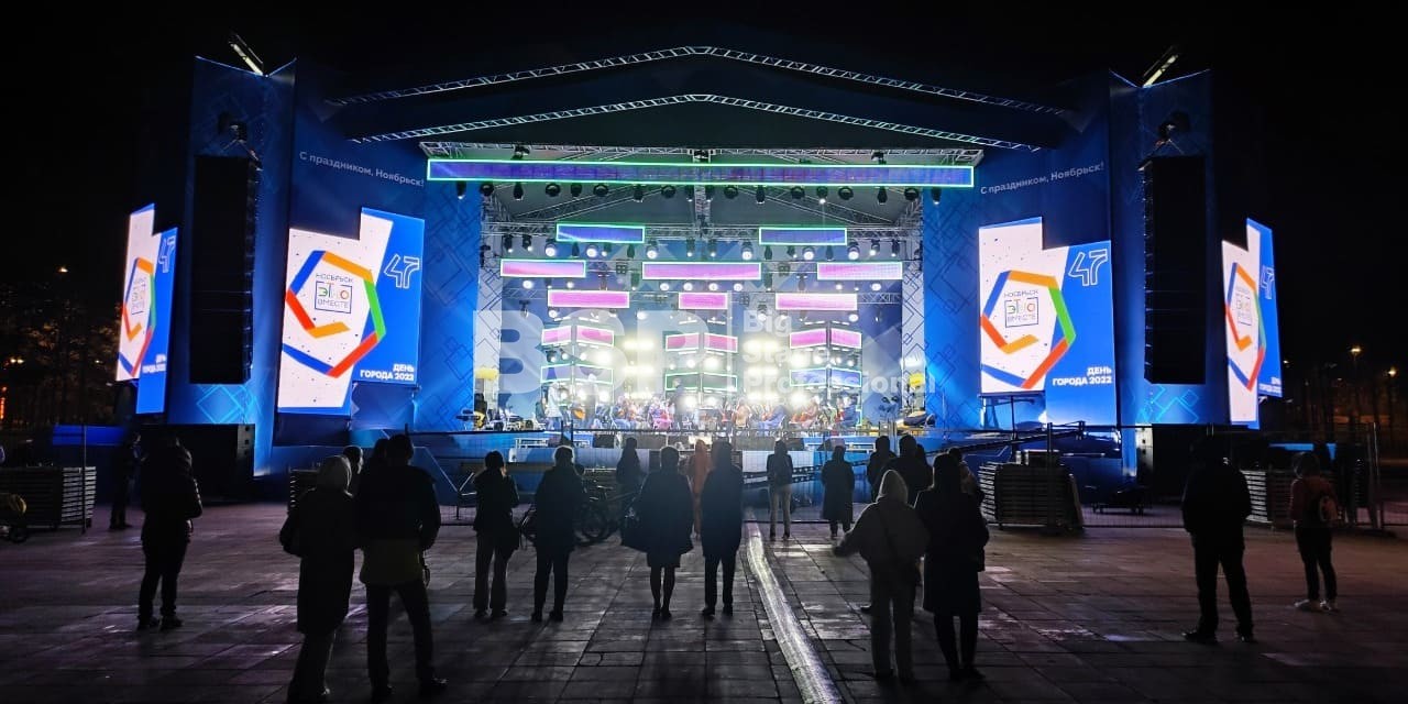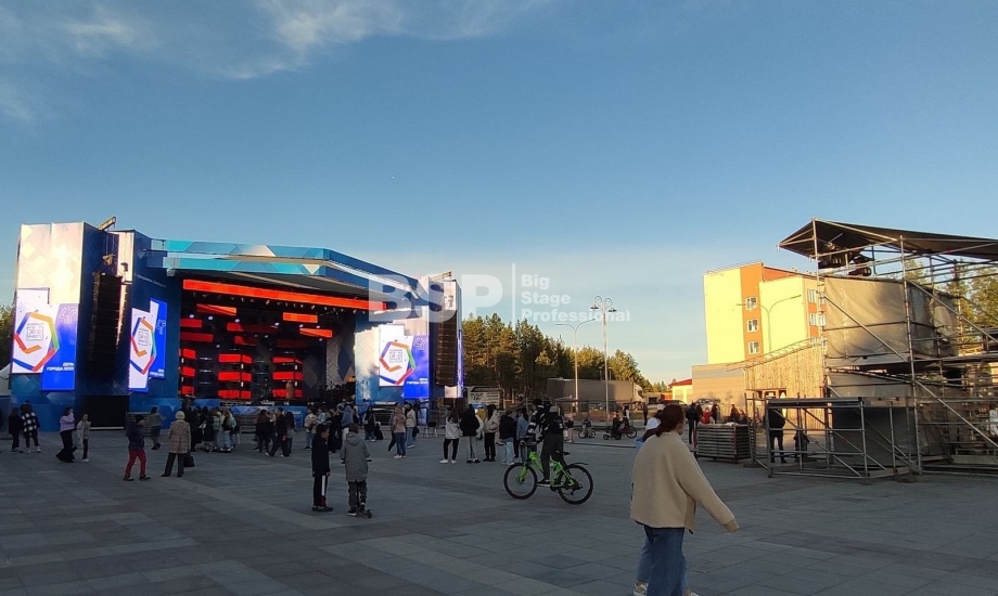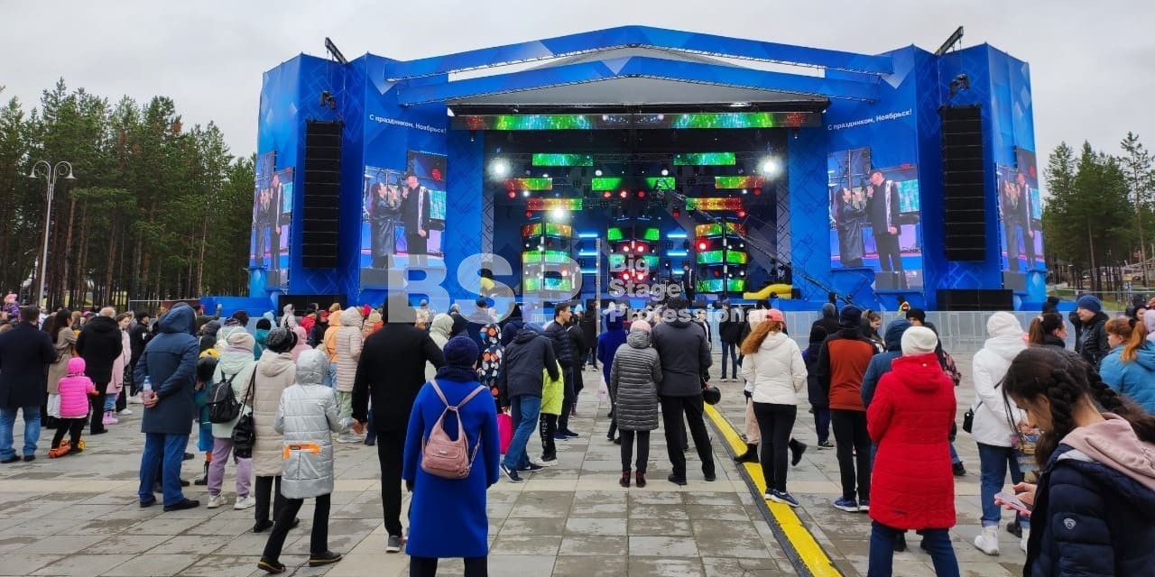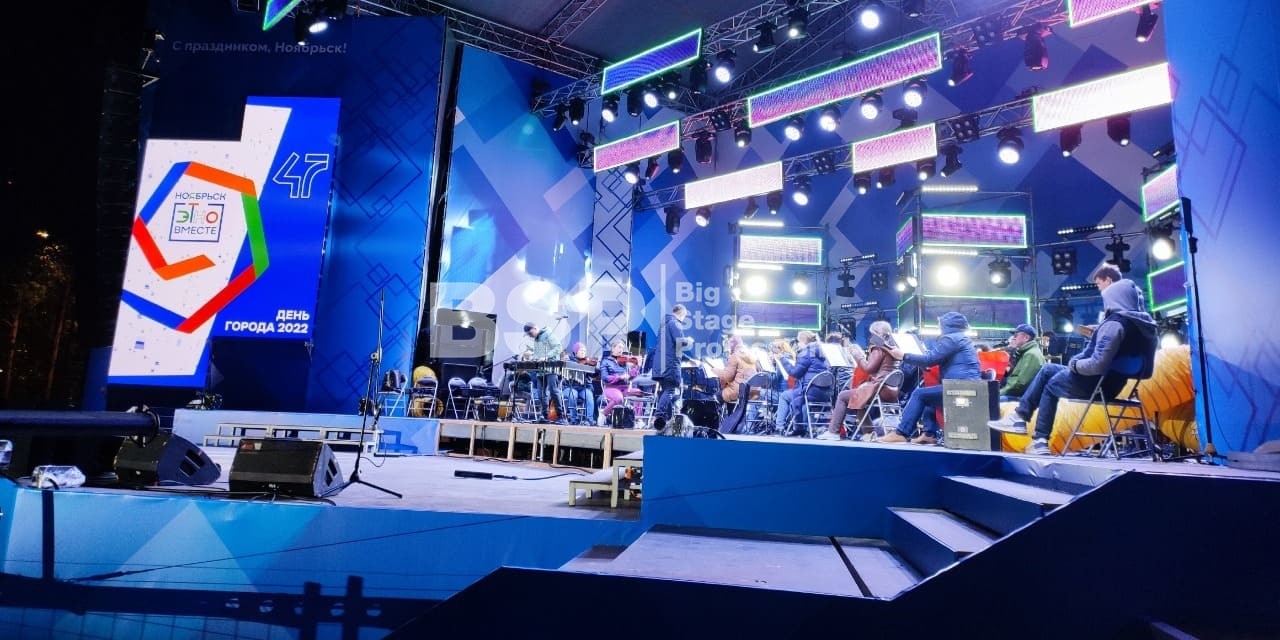 В Ноябрьск-парке мы установили нестандартный сценический комплекс с оригинальными конструкциями под экраны. Габаритные размеры сцены 36м*21м, высота более 13 м. Также мы установили 2 камерные платформы, пультовую, звуковое и световое оборудование, поставили силовые барьеры безопасности и шатры для артистов.