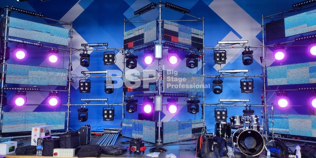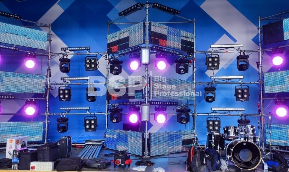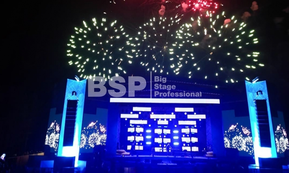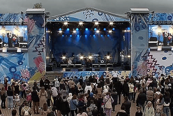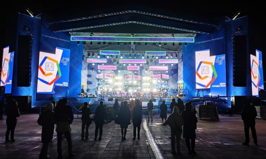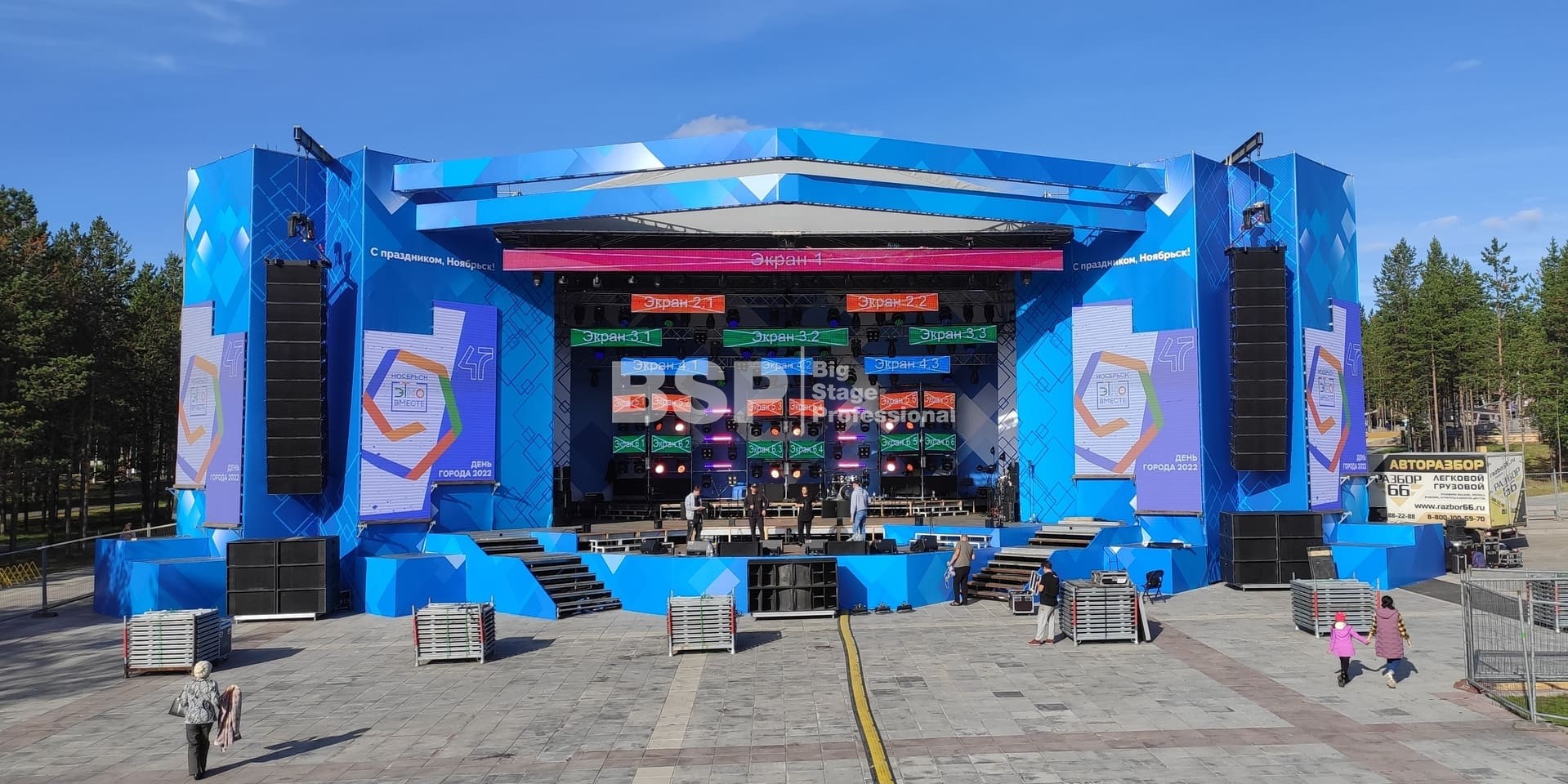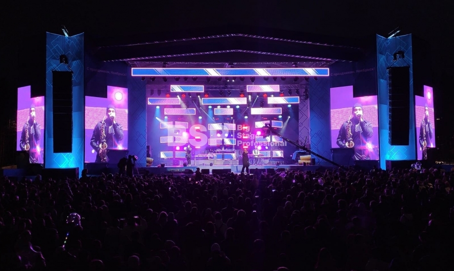 В Ноябрьск-парке мы установили нестандартный сценический комплекс с оригинальными конструкциями под экраны. Габаритные размеры сцены 36м*21м, высота более 13 м. Также мы установили 2 камерные платформы, пультовую, звуковое и световое оборудование, поставили силовые барьеры безопасности и шатры для артистов.