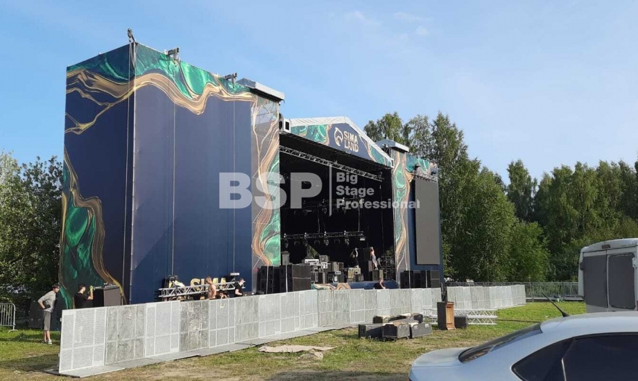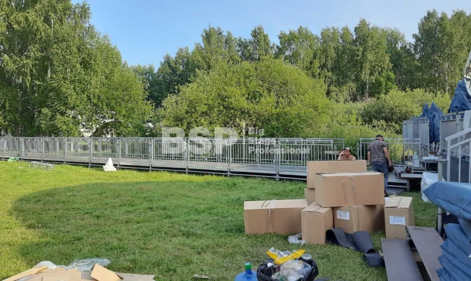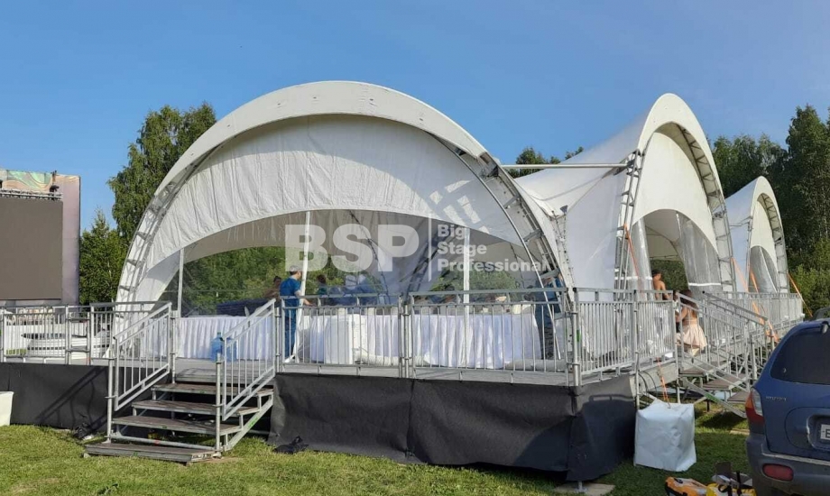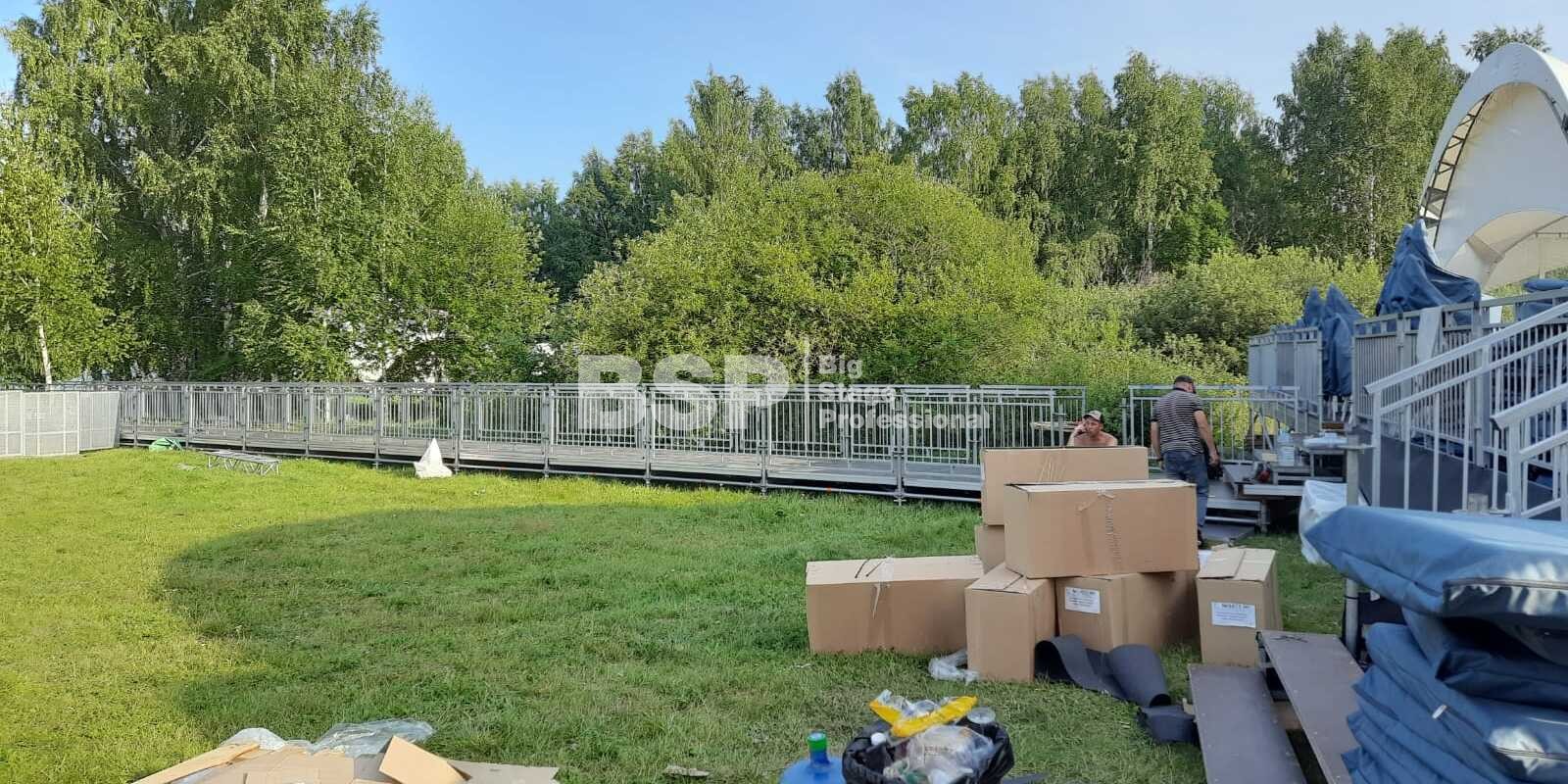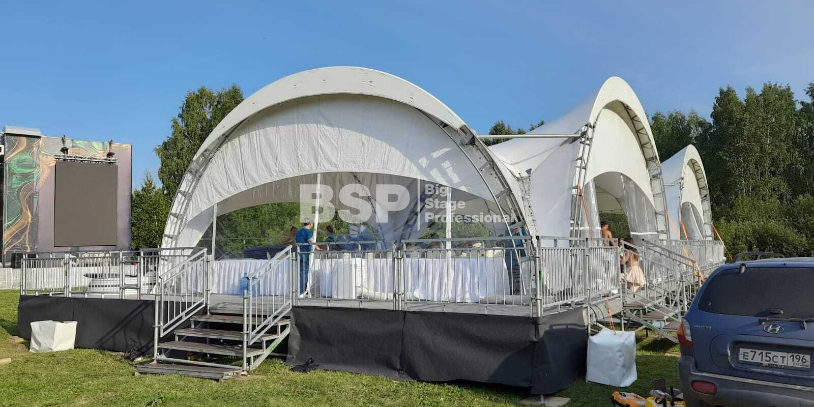 На берегу озера Балтым, на «Огонь пляже» мы установили брендированные сценический комплекс и двухуровневую пультовую, предоставили различные мобильные ограждения. Также мы возвели два необычных подиума с трапами или мостами, на которых стояли шатры.