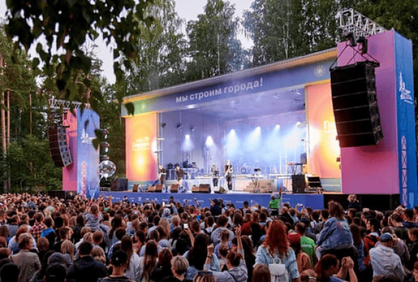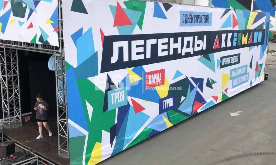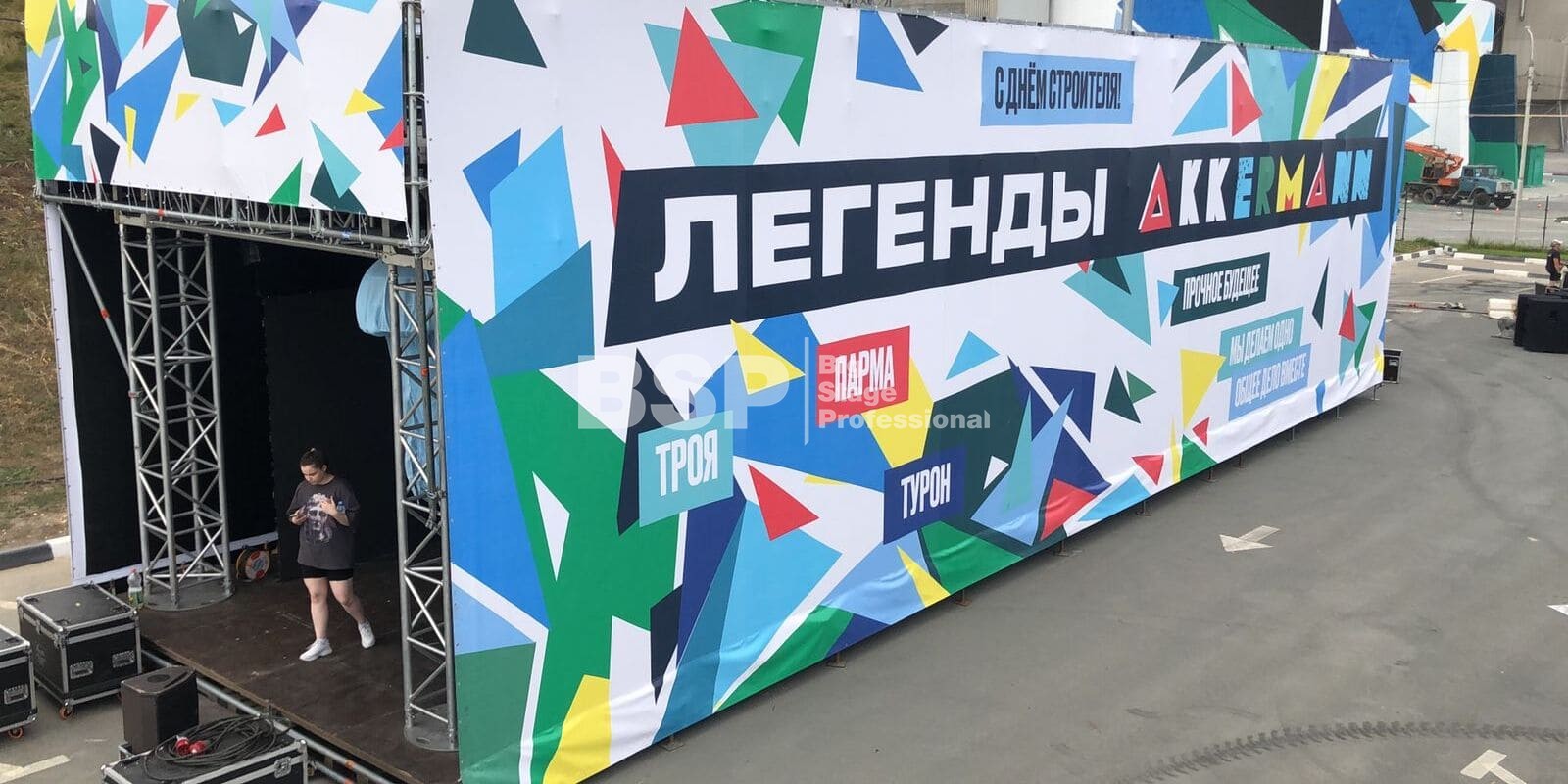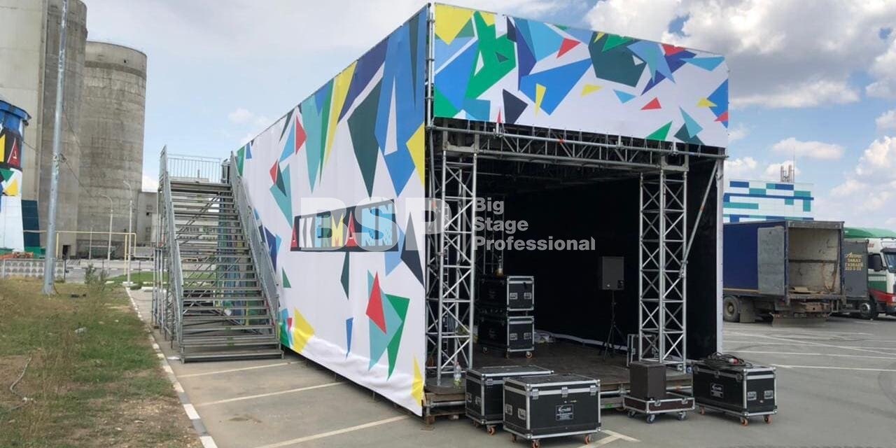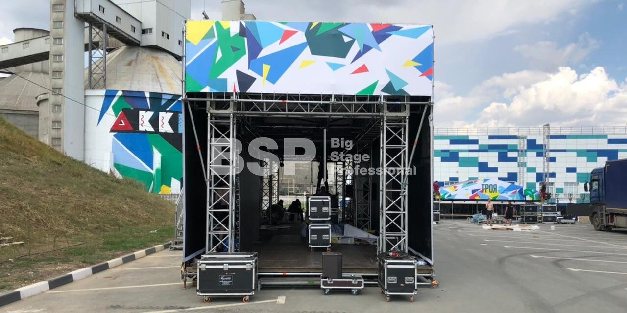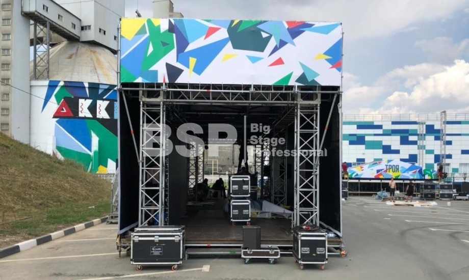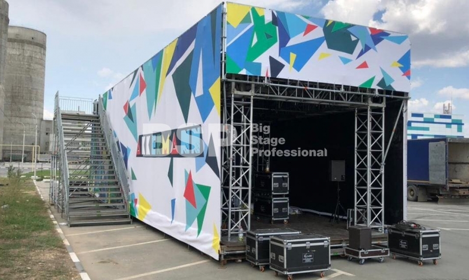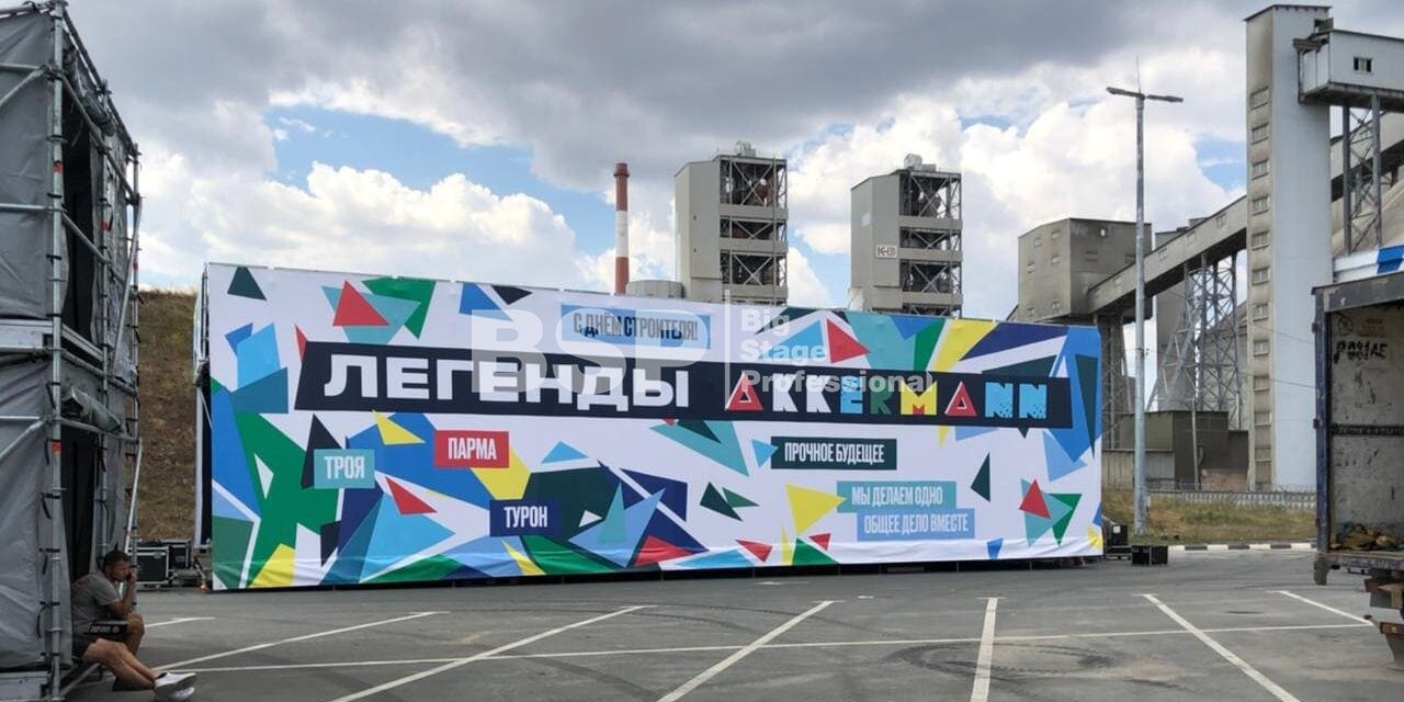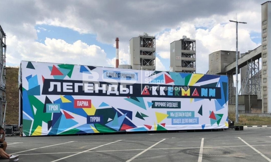 На территории завода «Аккерман» мы установили двухуровневую конструкцию 19м х 7м на сценическом планшете. Внутри конструкции проходило мероприятие для детей, на втором уровне располагалась смотровая площадка. Также мы возвели двухуровневую пультовую.