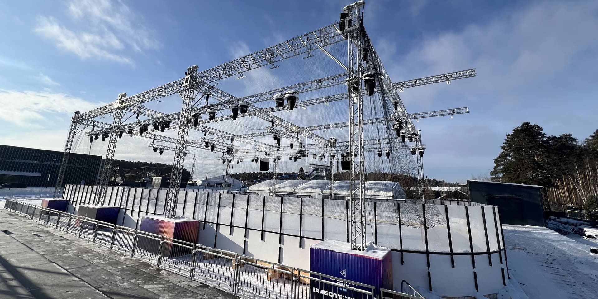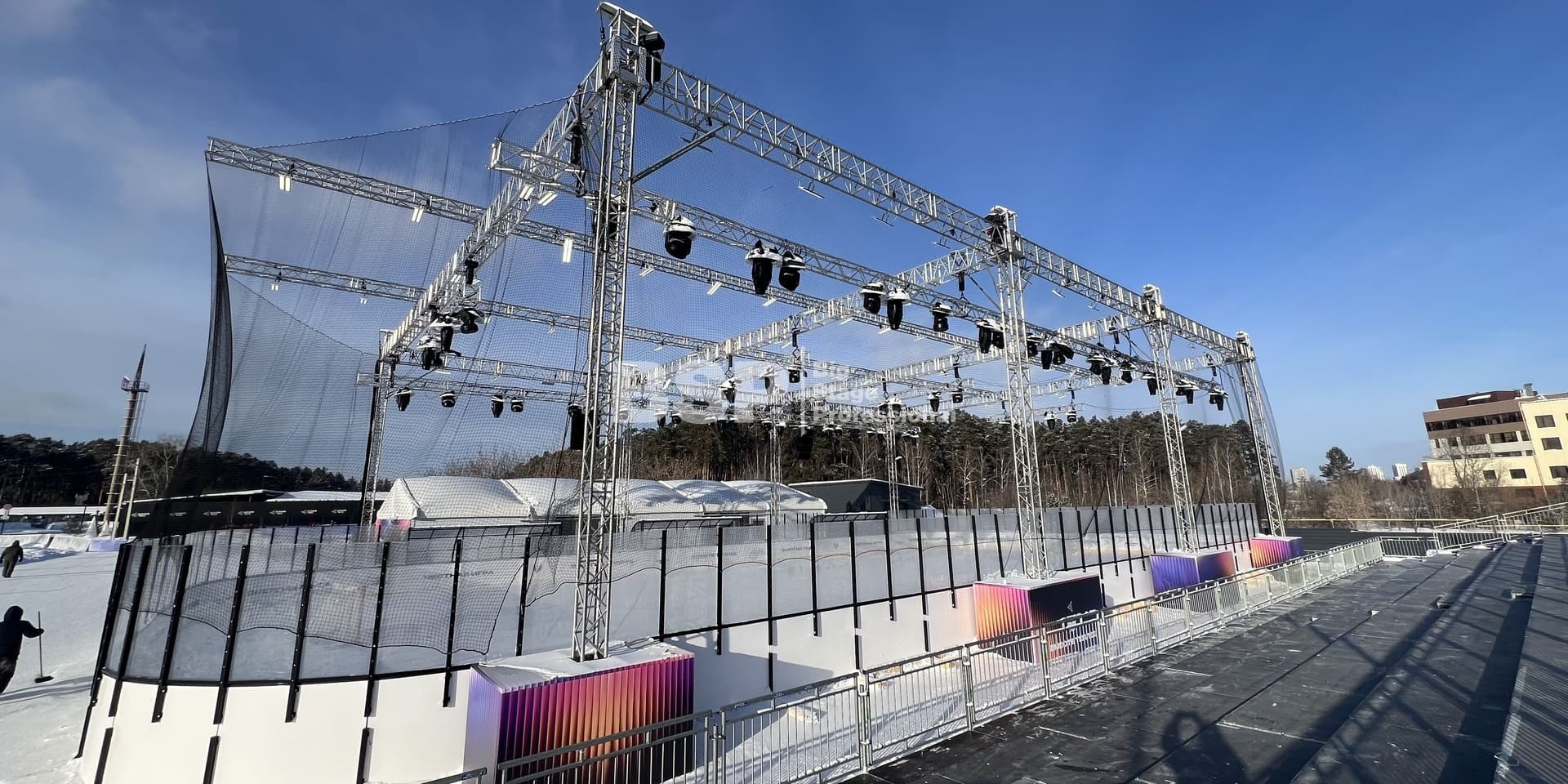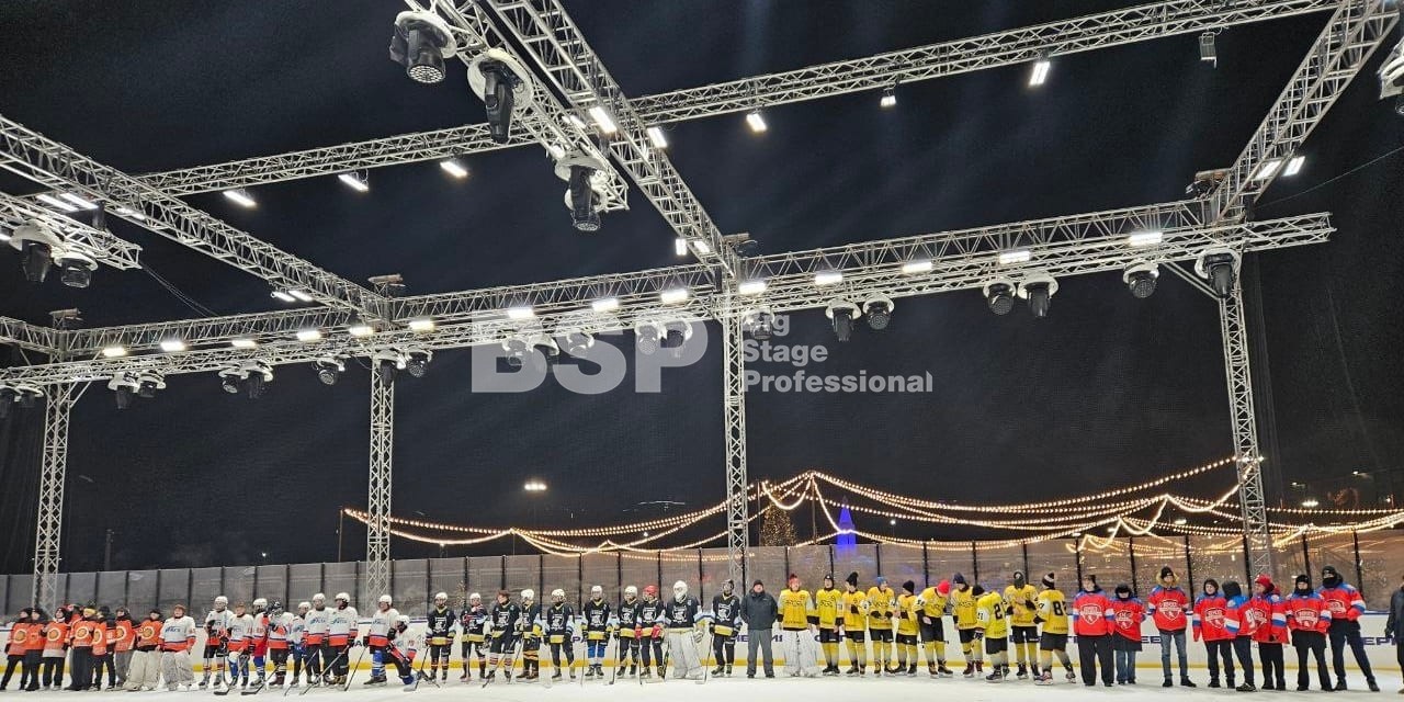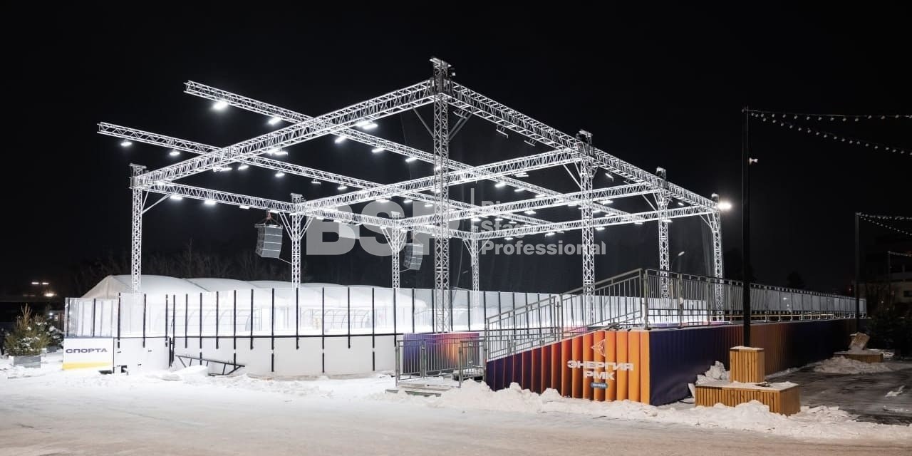 В спортивном квартале "Архангел Михаил" на хоккейном катке мы установили фермовые конструкции для размещения светового и звукового оборудования, зрительскую трибуну. Предоставили звуковое, световое и энергообеспечивающее оборудование.