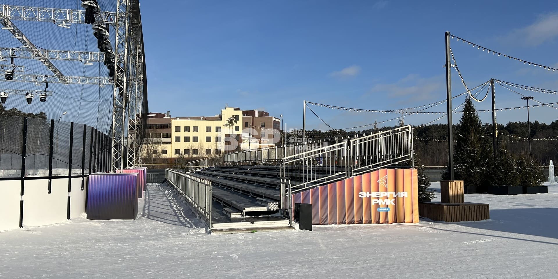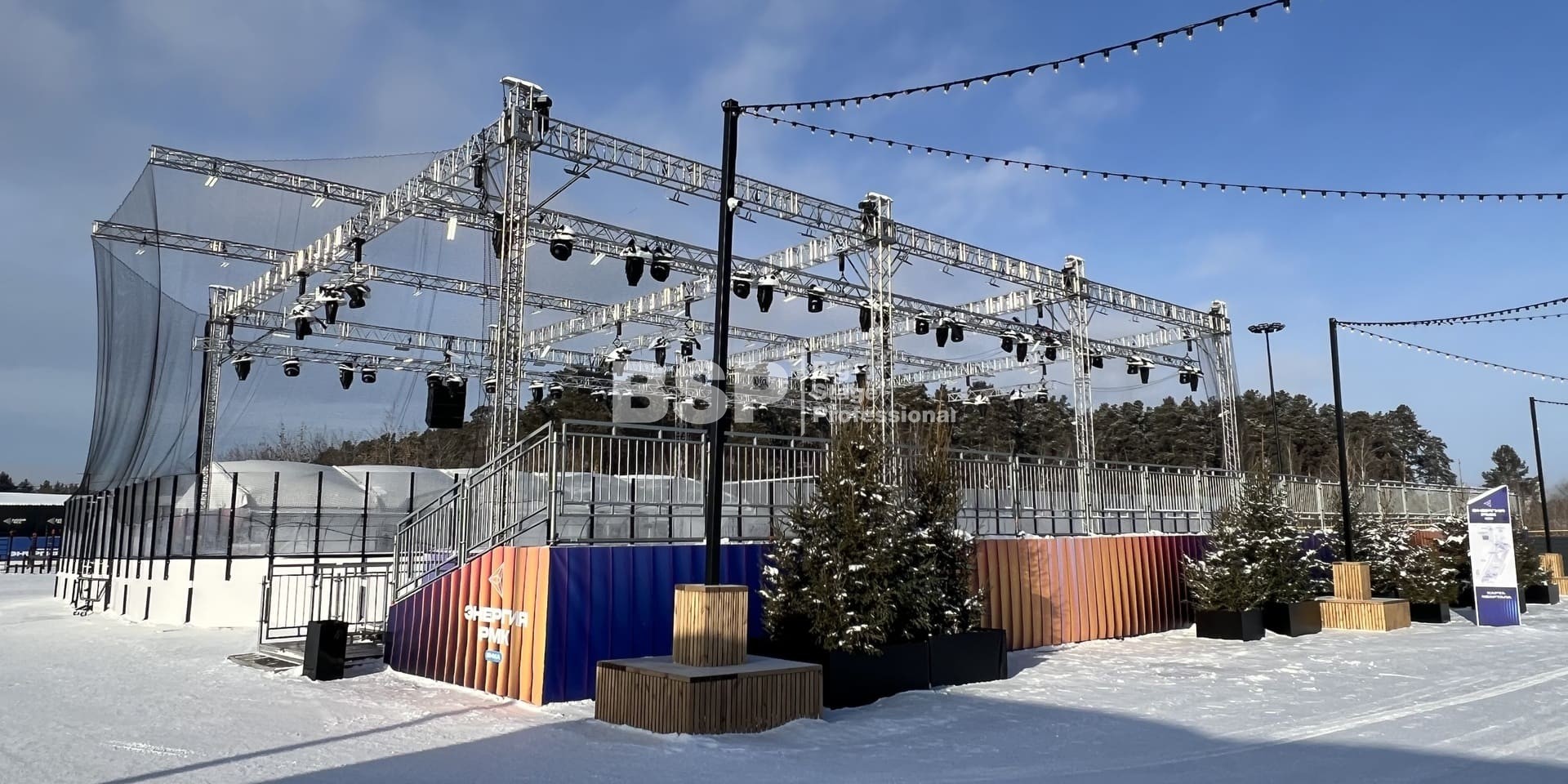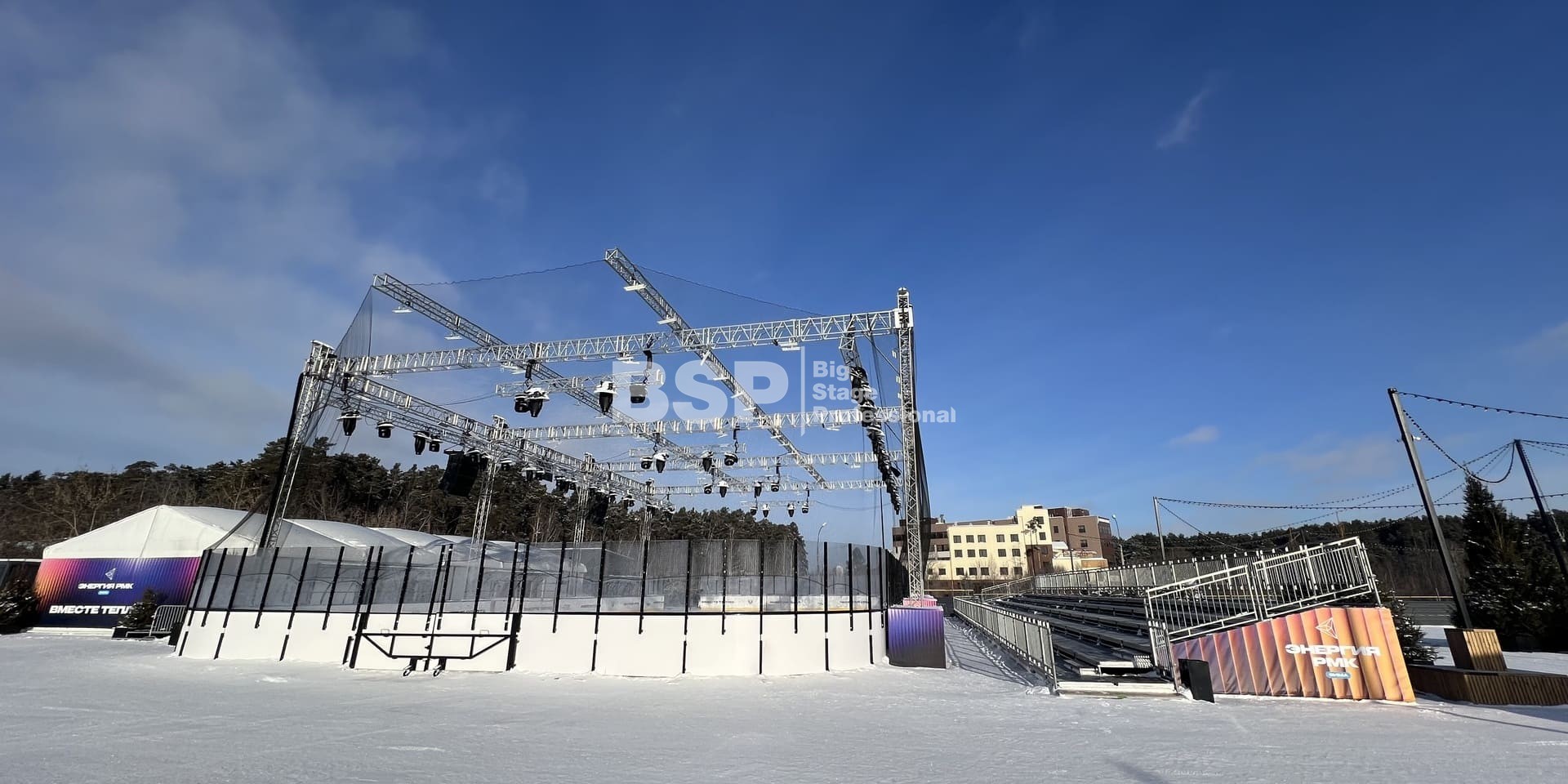 В спортивном квартале "Архангел Михаил" на хоккейном катке мы установили фермовые конструкции для размещения светового и звукового оборудования, зрительскую трибуну. Предоставили звуковое, световое и энергообеспечивающее оборудование.