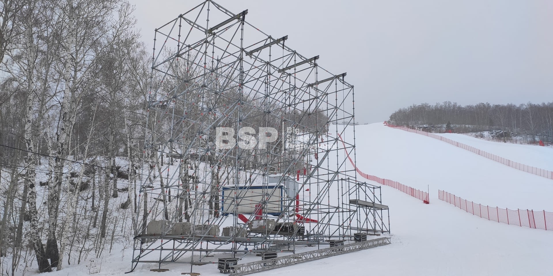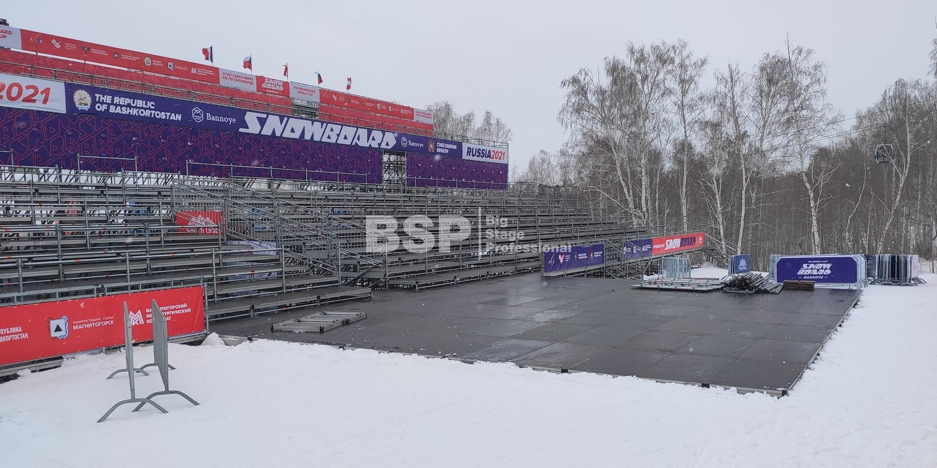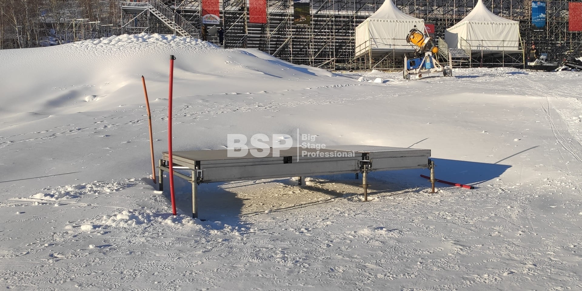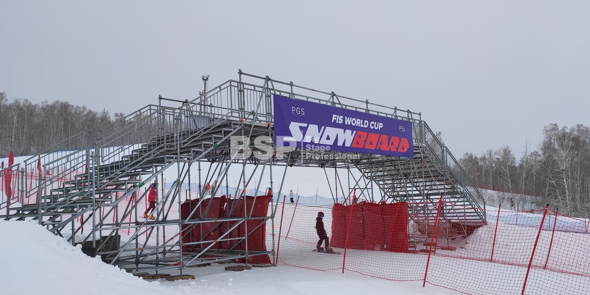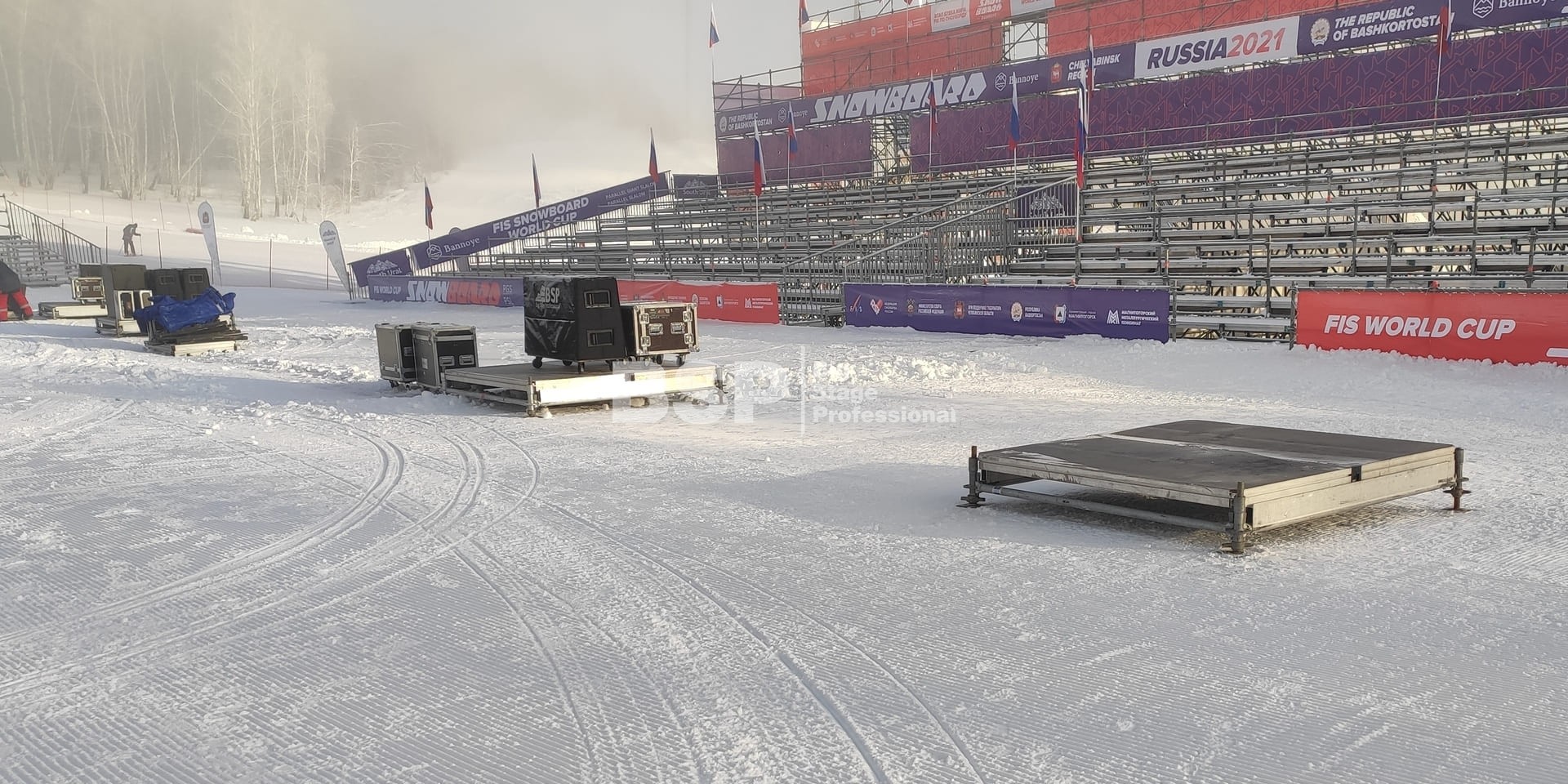 Мы установили трибунный комплекс с вип уровнем и площадкой для шатров, множество различных сценических планшетов и камерных платформ, конструкции для экранов, мост над сноубордической трассой, а также предоставили звуковое оборудование и ограждения.
