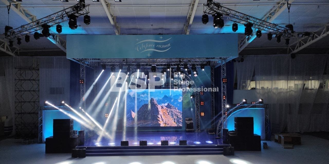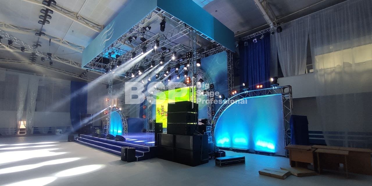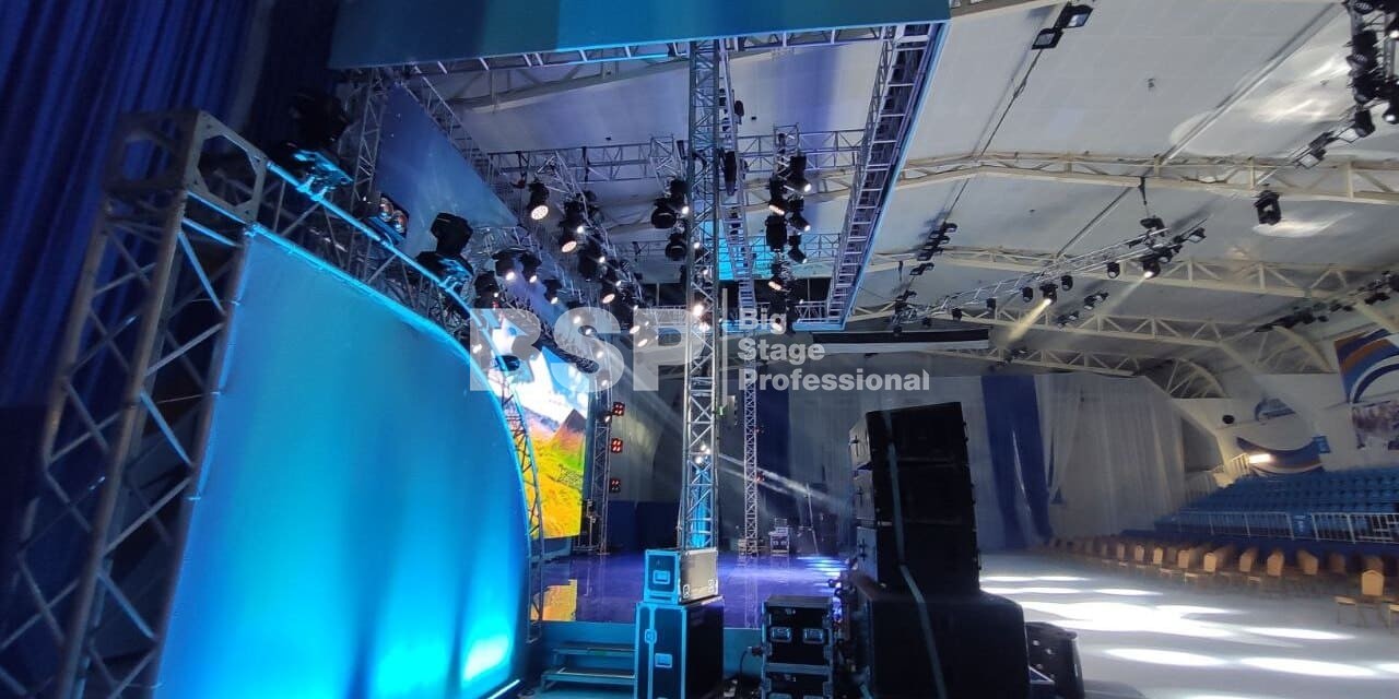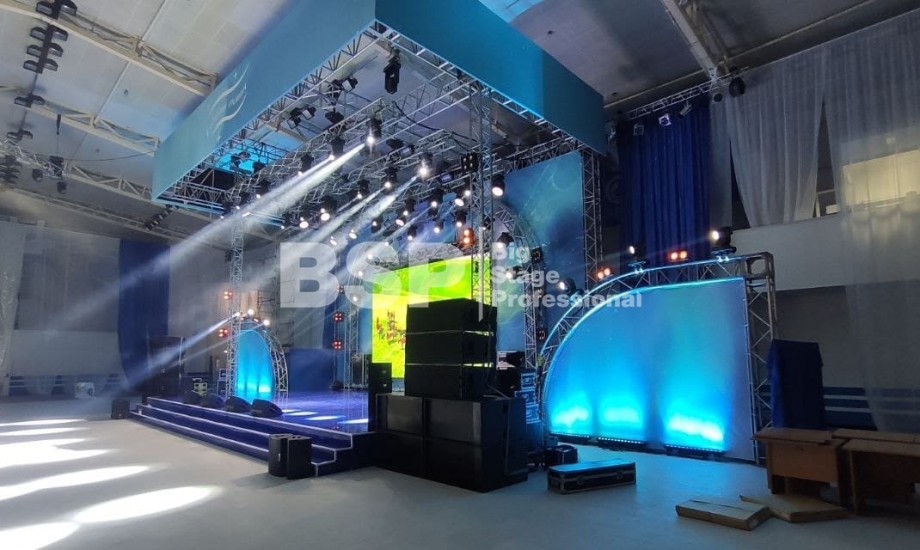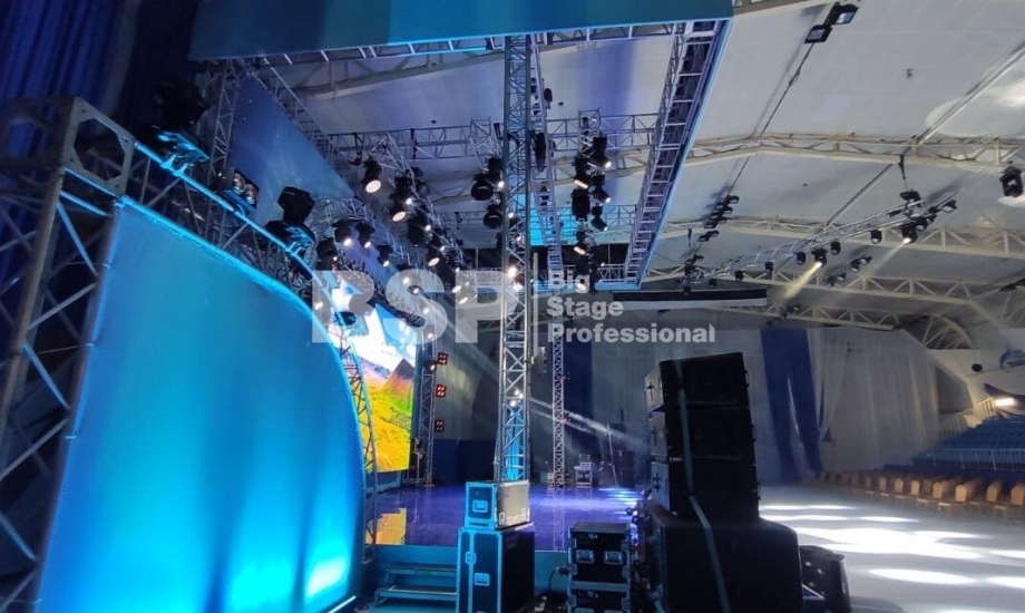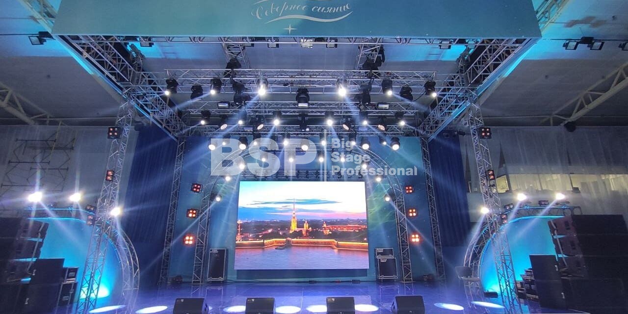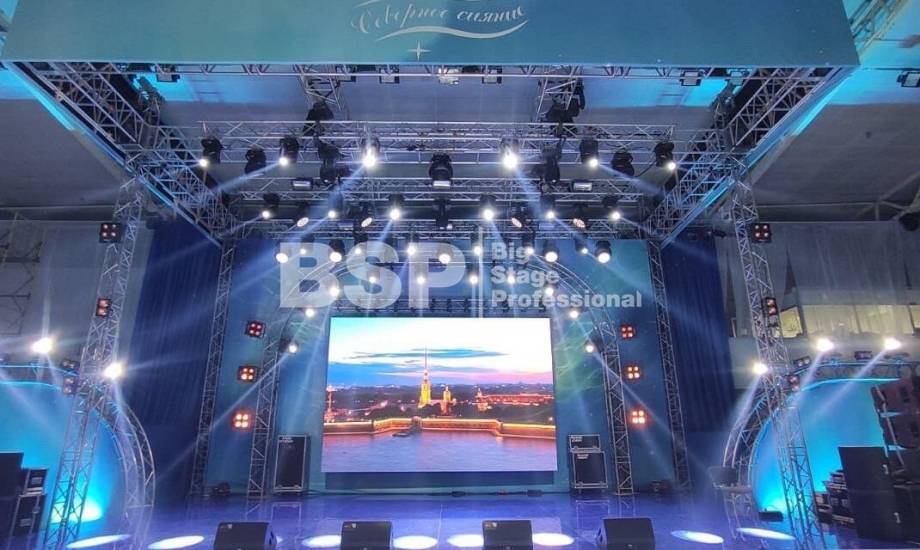 В Культурно-спортивном комплексе «НОРД» мы установили сценический комплекс с конструкцией для светодиодного экрана и предоставили световое и звуковое оборудование.