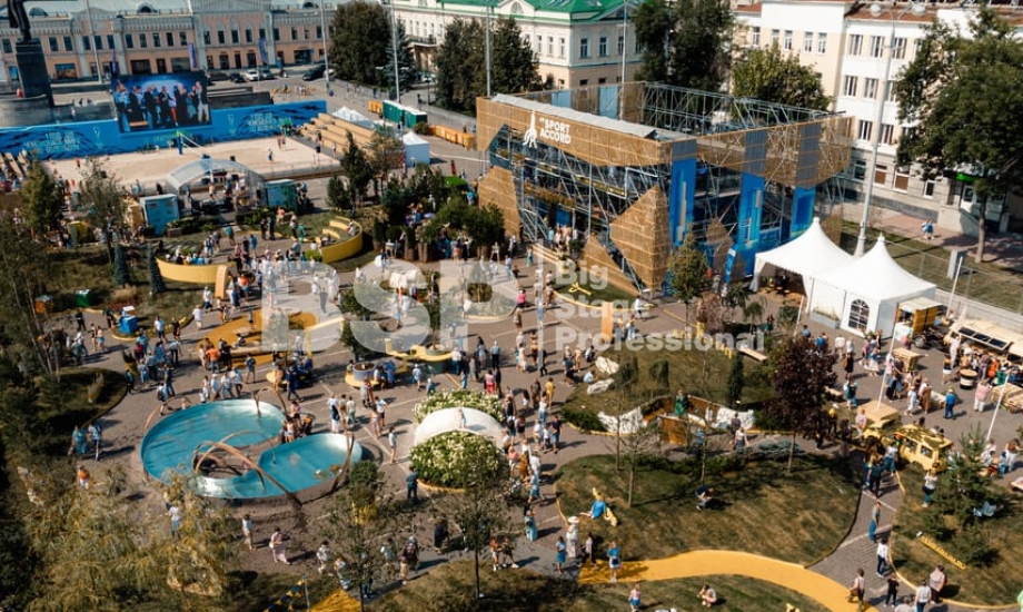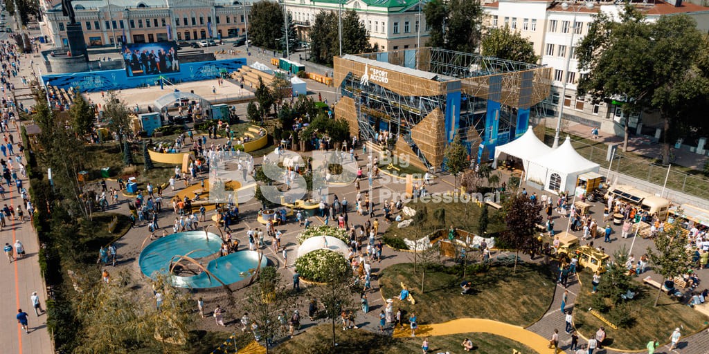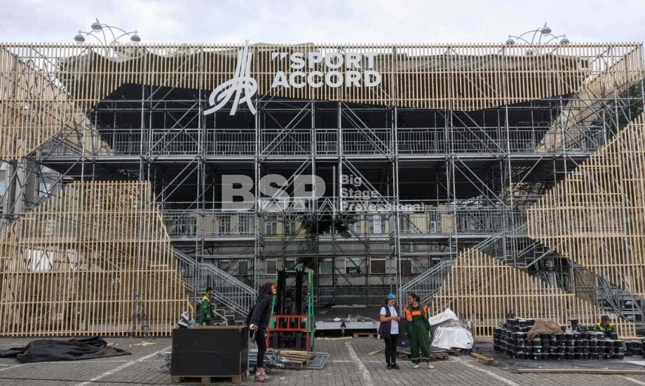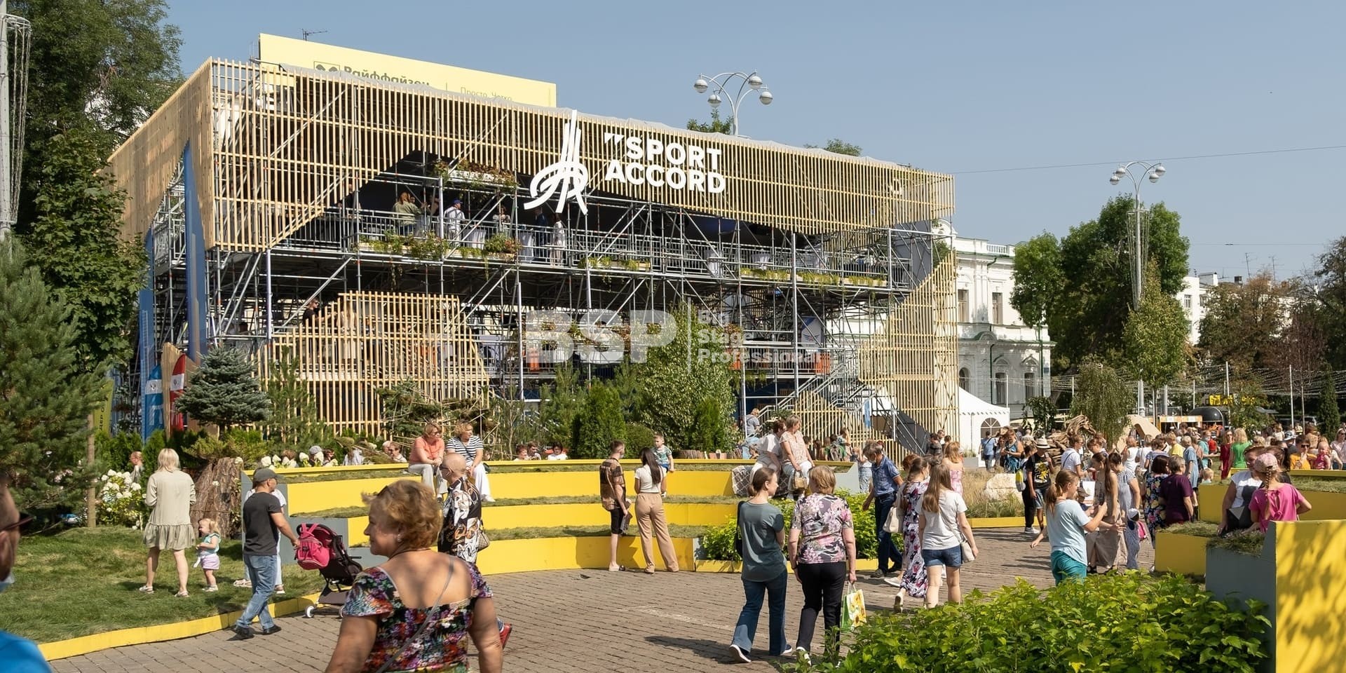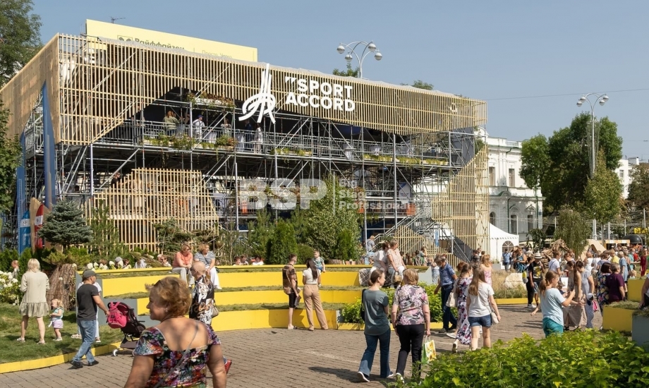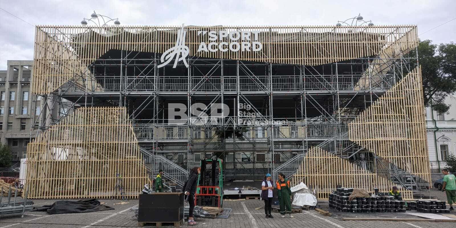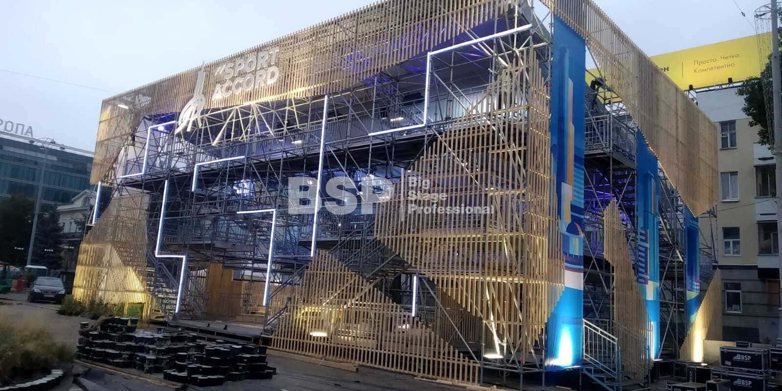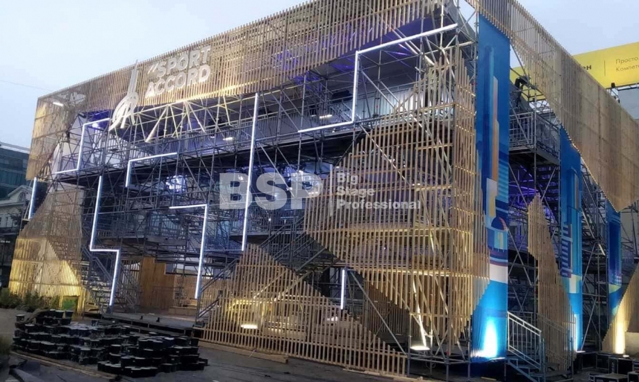 На площади 1905 года мы установили самый большй арт-объект на фестивале - спортивный павильон «Sport Accord». Эта трёхэтажная конструкция была возведена из строительных лесов Layher, декорирована деревянными брусками и украшена живыми цветами. В целом, внешний вид конструкции соответствовал концепции мероприятия «зелёные города для людей». Также мы предоставили световое и звуковое оборудование.