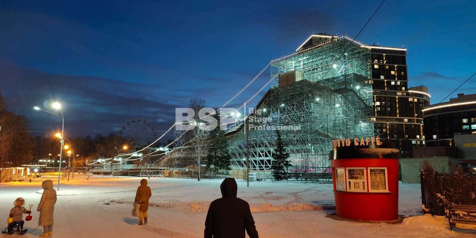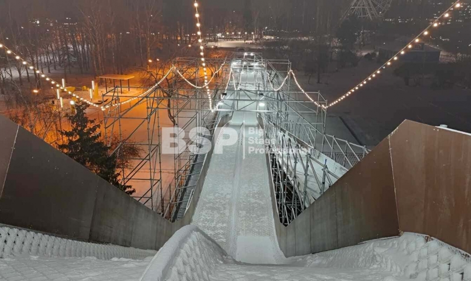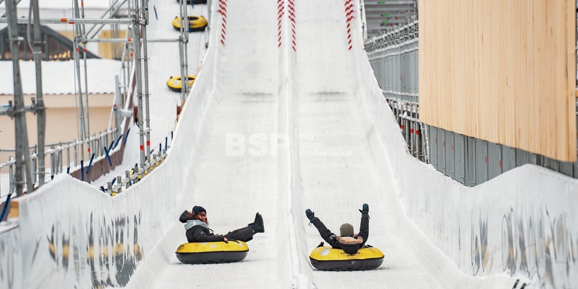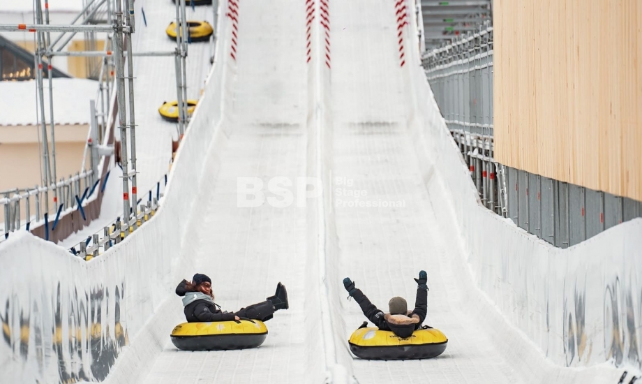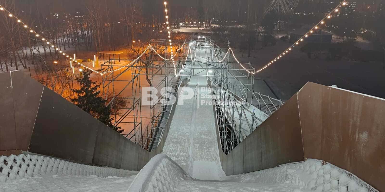 Зимний аттракцион сделан без использования льда. Вместо него специальное резиновое покрытие, по которому можно кататься даже при плюсовых температурах. На горке используются специальные тюбинги, подъемник доставляет их наверх — вам не нужно нести их с собой вверх по лестнице. Горка создана из строительных лесов немецкой фирмы Layher, поэтому она безоговорочно надёжна и безопасна.