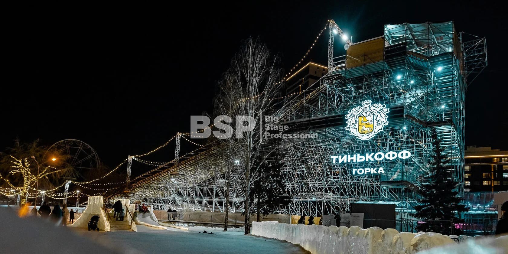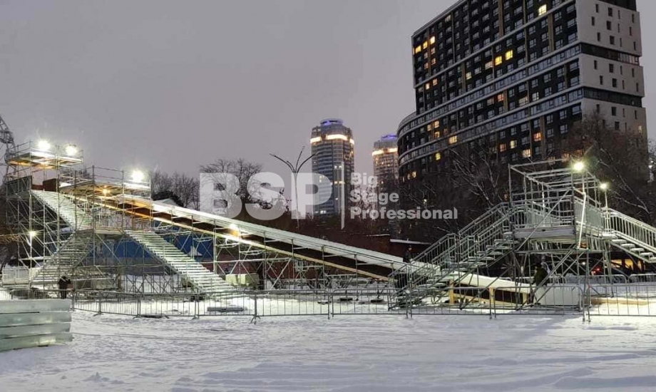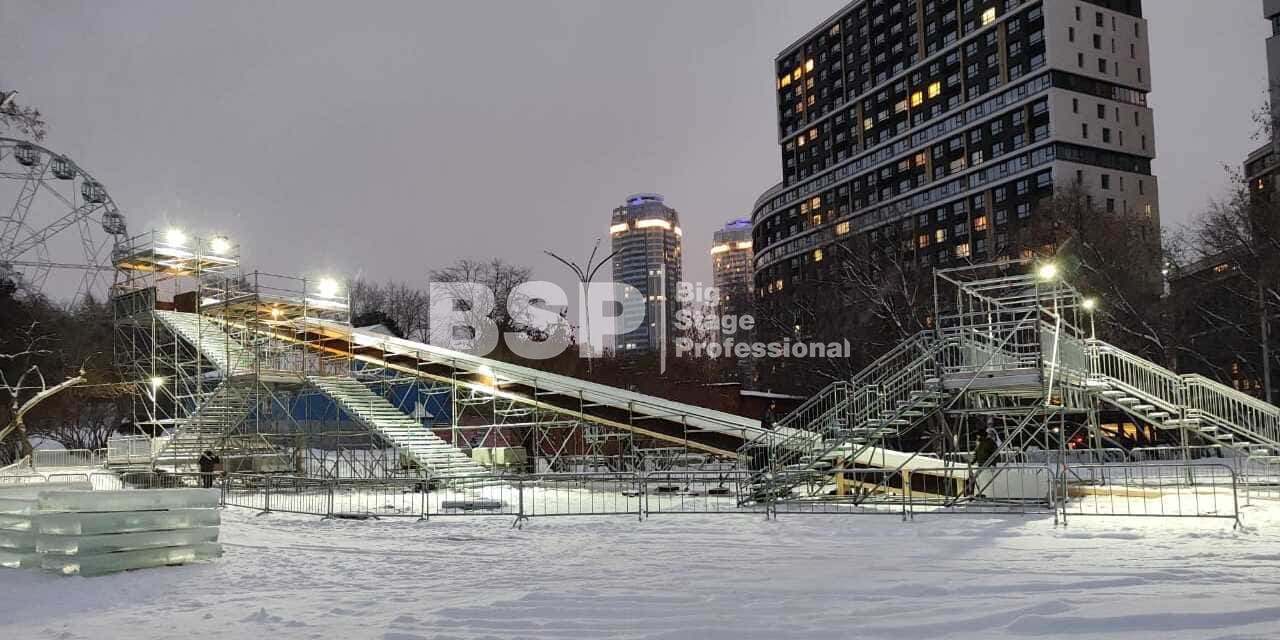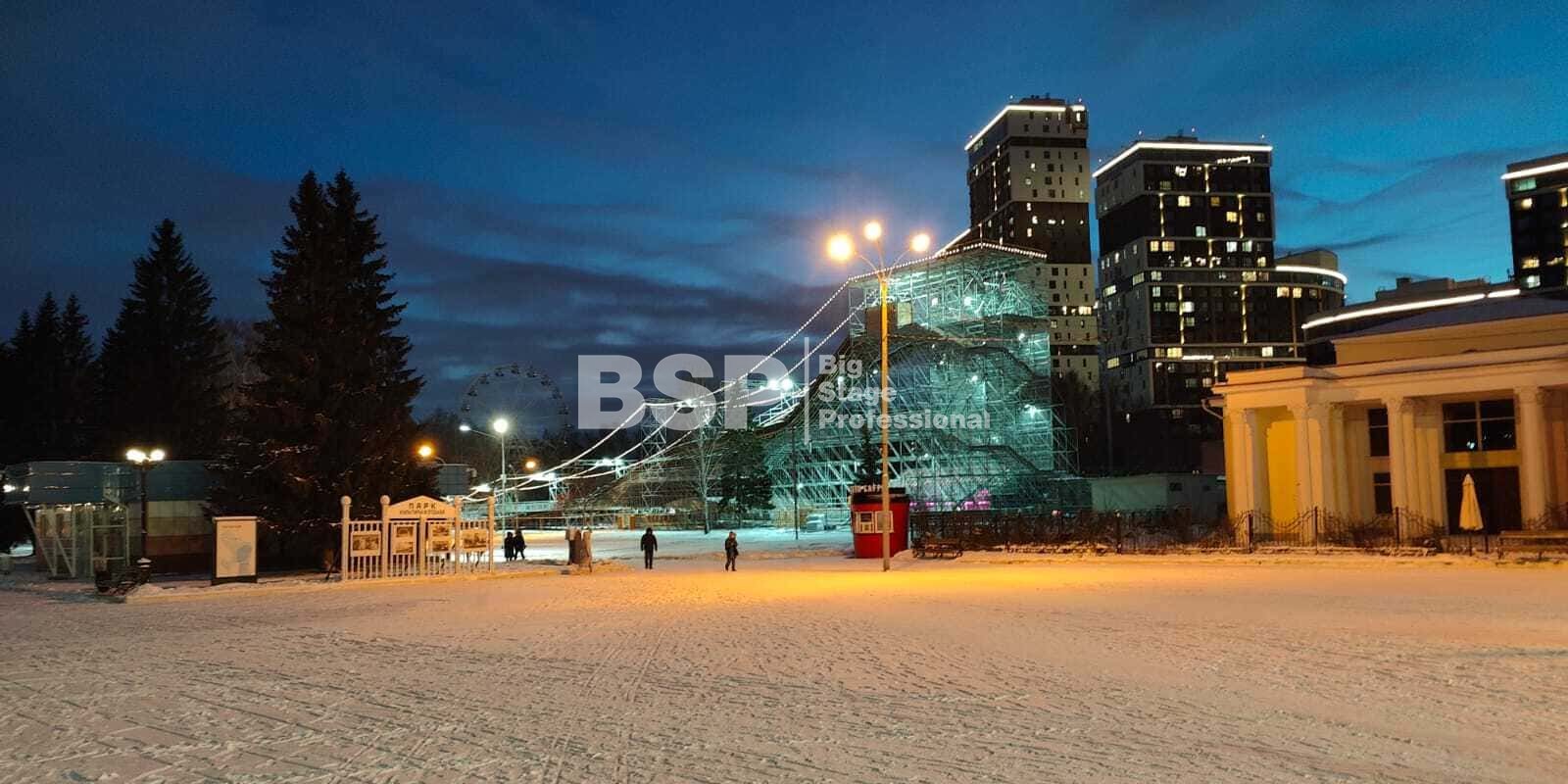 Зимний аттракцион сделан без использования льда. Вместо него специальное резиновое покрытие, по которому можно кататься даже при плюсовых температурах. На горке используются специальные тюбинги, подъемник доставляет их наверх — вам не нужно нести их с собой вверх по лестнице. Горка создана из строительных лесов немецкой фирмы Layher, поэтому она безоговорочно надёжна и безопасна.