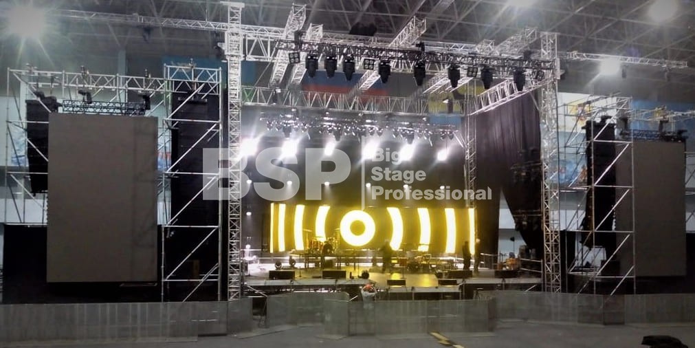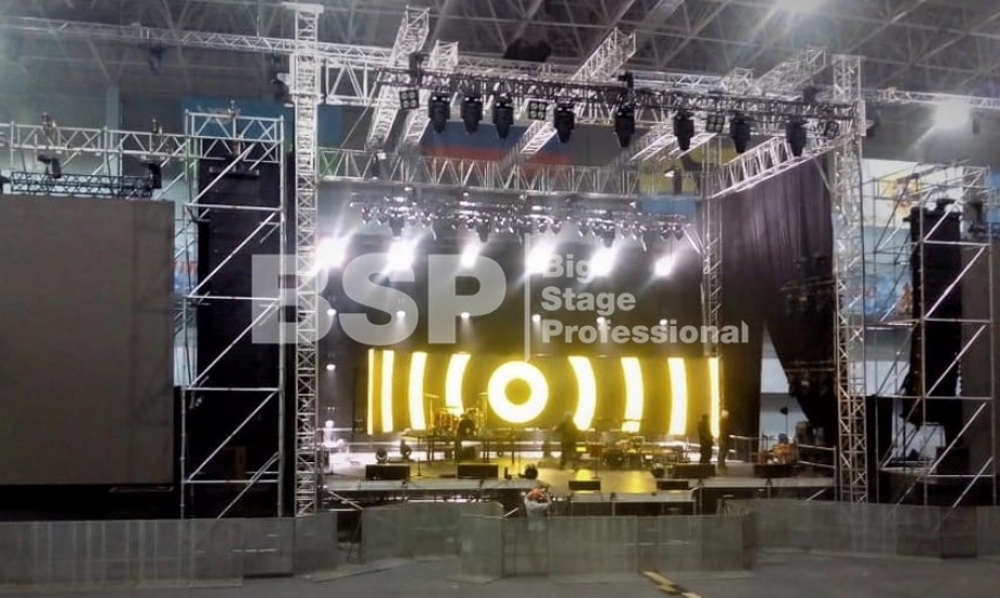 Мы установили сценический планшет с граундом, отдельно стоящие звуковые порталы, завесили чёрный кабинет сцены, поставили силовые барьеры безопасности.