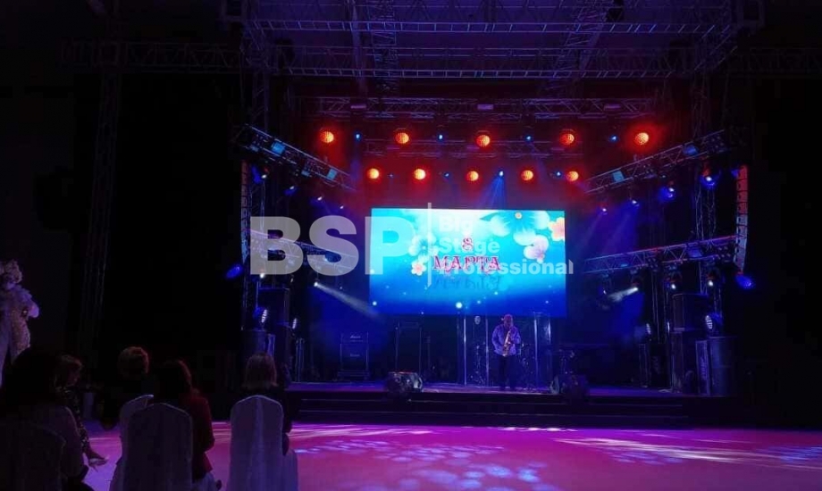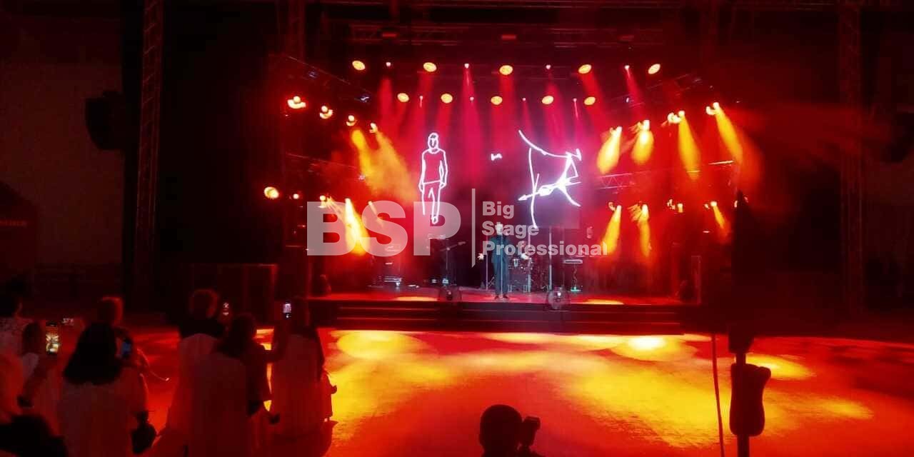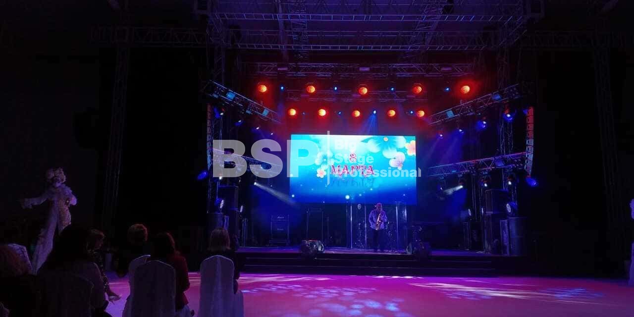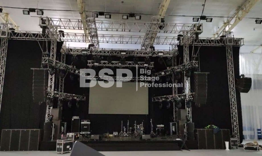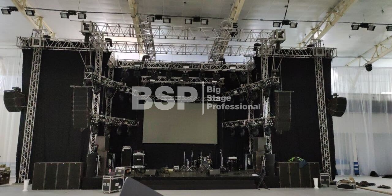 В СК «Юбилейный» мы возвели сценический подиум, фермовые конструкции для размещения оборудования и светодиодного экрана. Предоставили световое и звуковое оборудование.