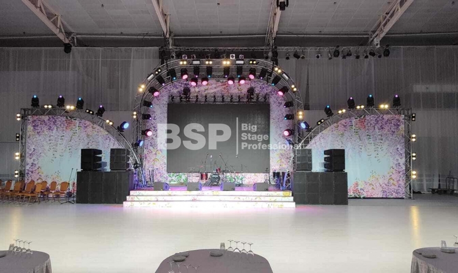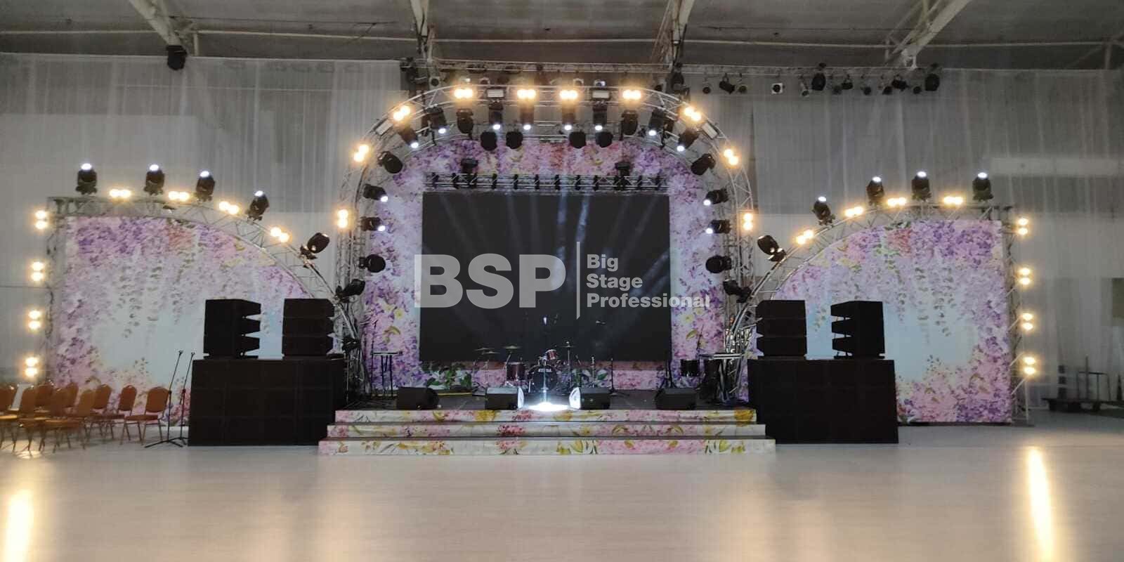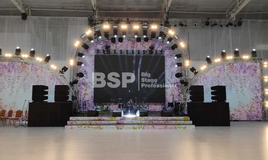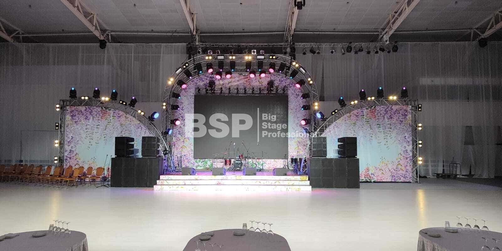 В СК «Юбилейный» мы возвели сценический подиум с декорациями из фермовых конструкций и возможностью размещения светодиодного экрана. Предоставили световое и звуковое оборудование