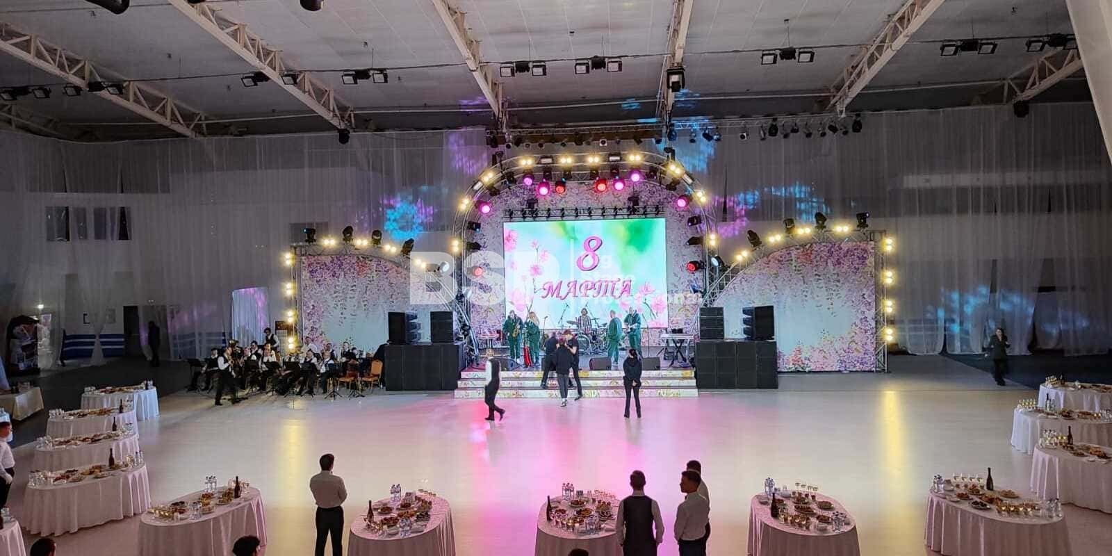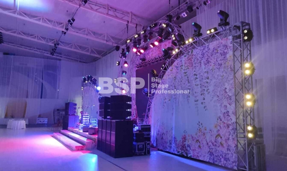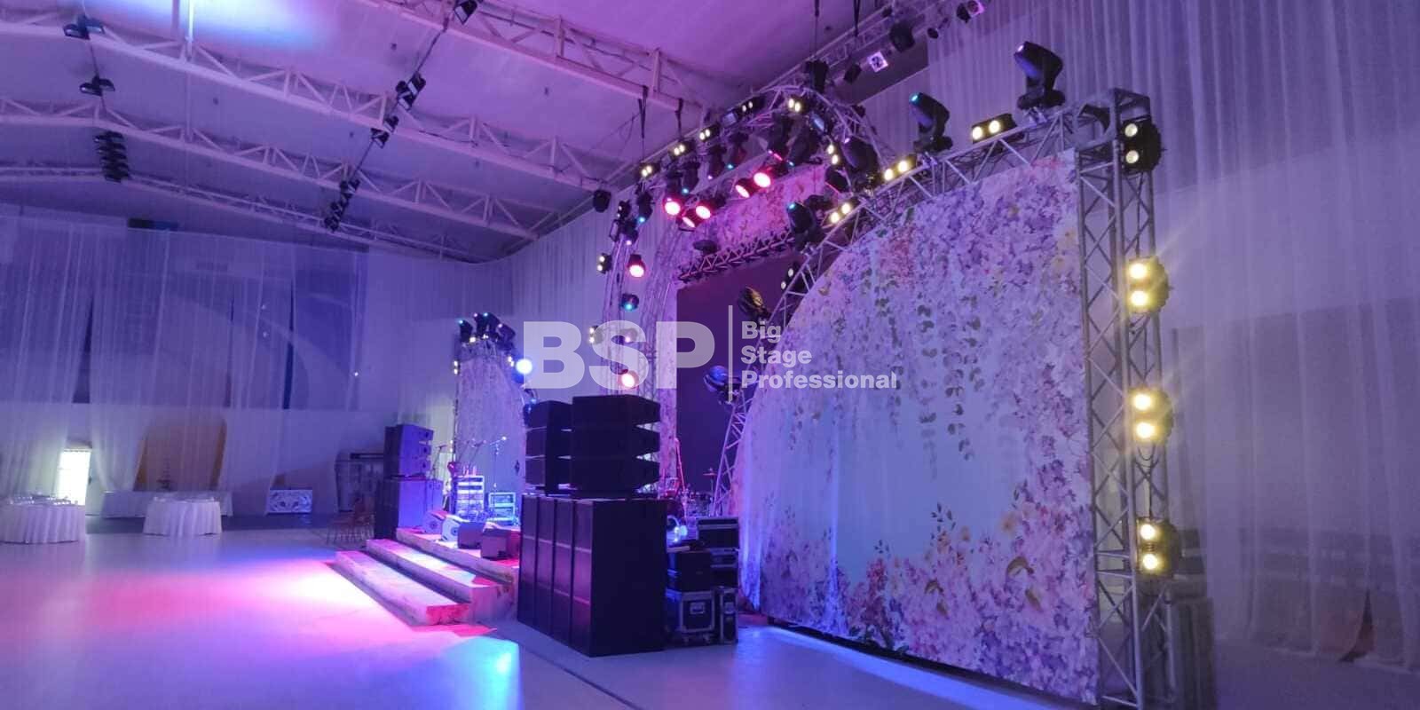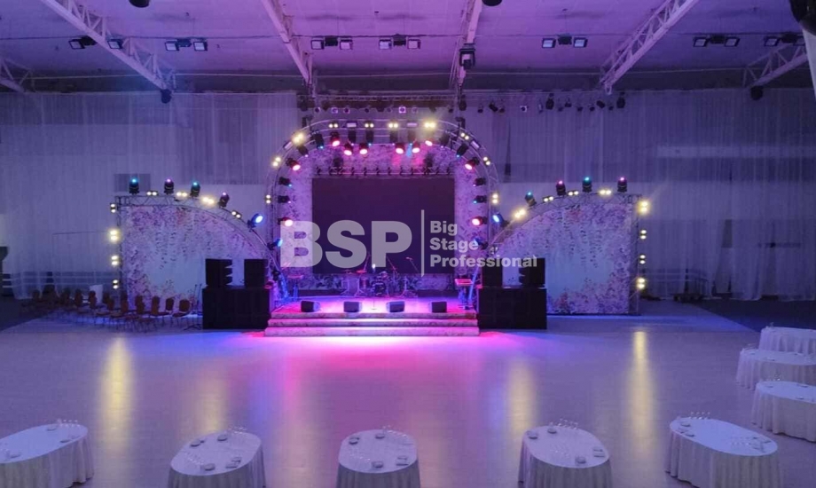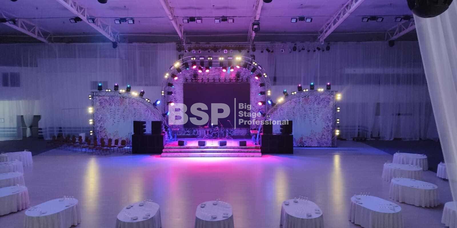 В СК «Юбилейный» мы возвели сценический подиум с декорациями из фермовых конструкций и возможностью размещения светодиодного экрана. Предоставили световое и звуковое оборудование