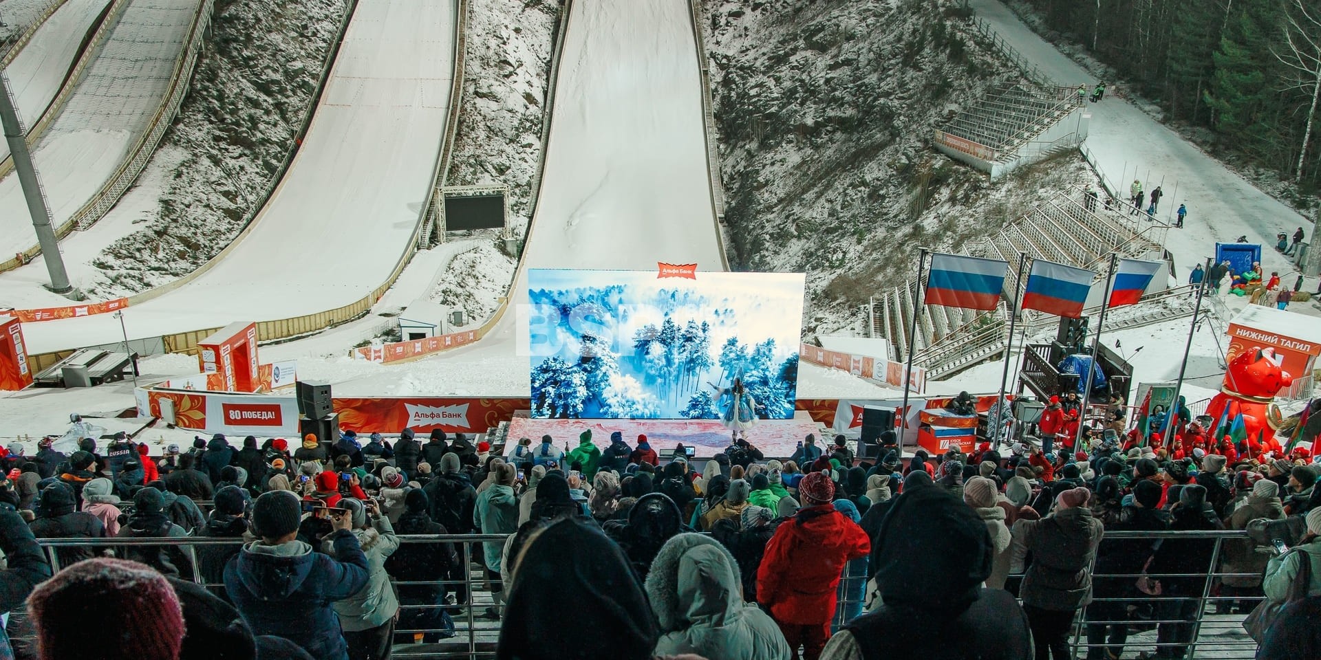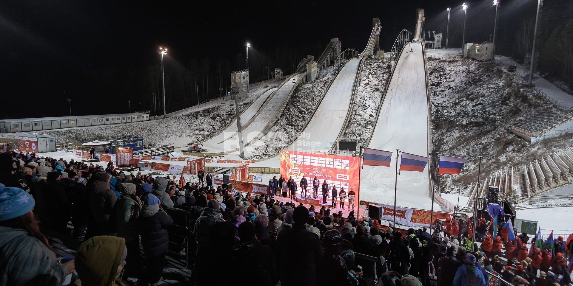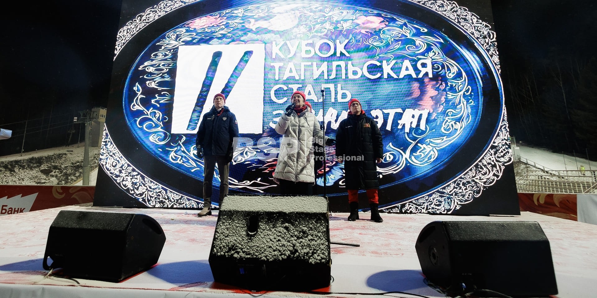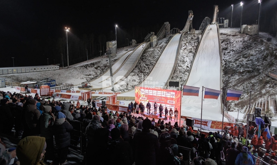 Международные соревнования по прыжкам на лыжах с трамплина и лыжному двоеборью состоялись на трамплинном комплексе «Аист». Ежегодно мы устанавливаем сценический планшет с конструкцией для экрана, несколько камерных платформ и звуковое оборудование.
