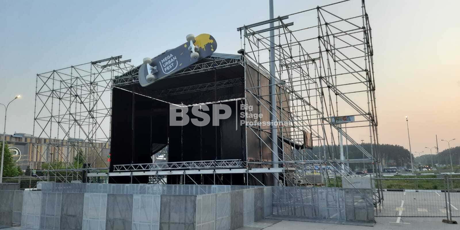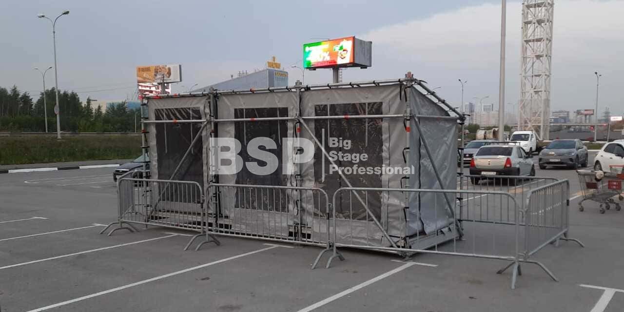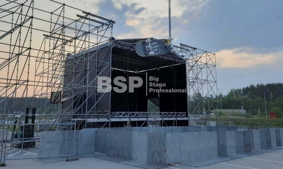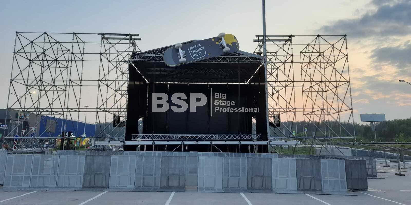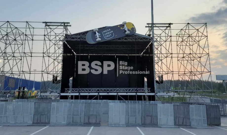 На площадке у ТРЦ "Мега" мы установили сценический комплекс, пультовую, трибуну без сидений и конструкцию в фотозоне. Предоставили различные ограждения