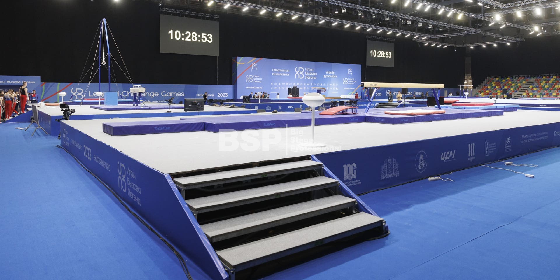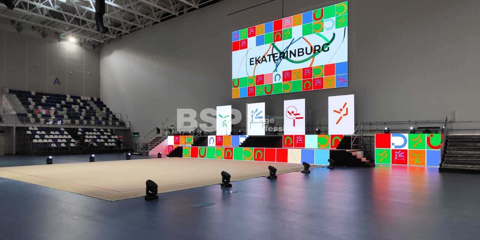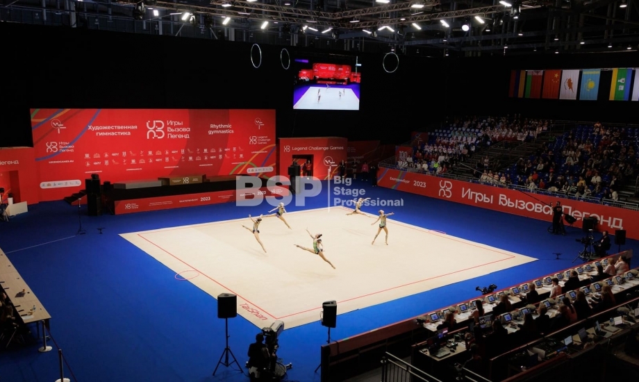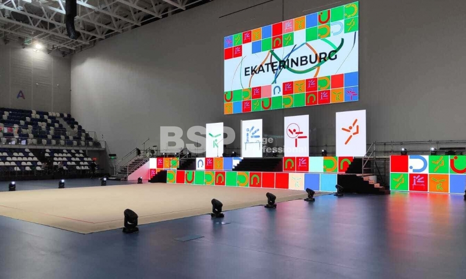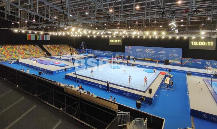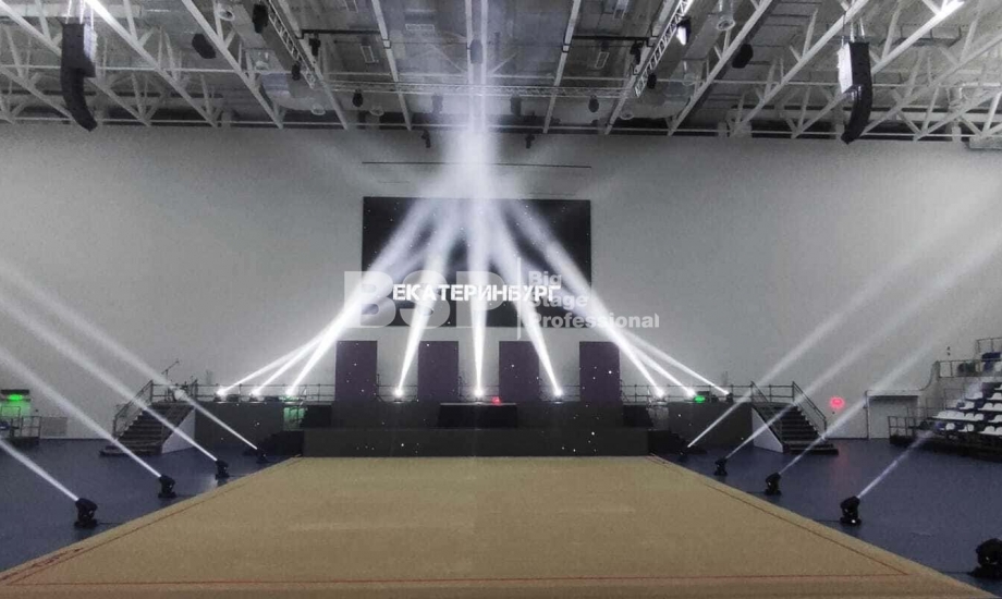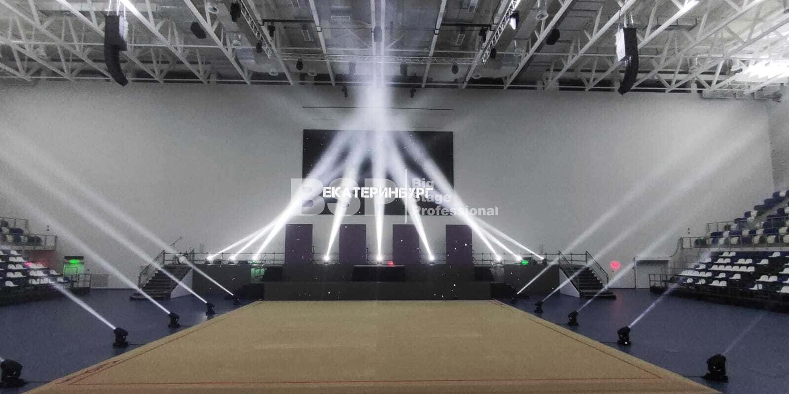 Мы оснастили все зоны соревнований световым оборудованием, включая самую сложную в плане проектирования и установки техники площадку для спортивной гимнастики, где необходимо было продумать, как расположить и выставить световое оборудование на все восемь снарядов. Также, мы предоставили в аренду железобетонные блоки для фиксации спортивных снарядов.