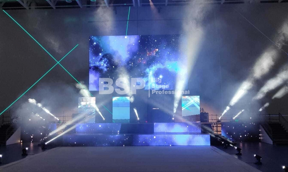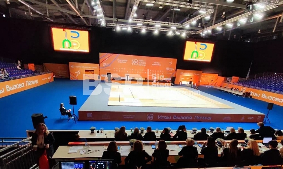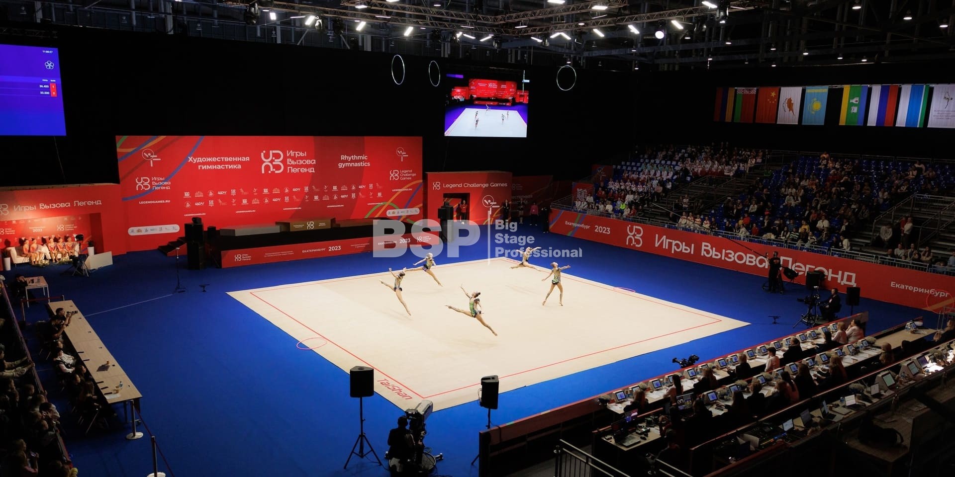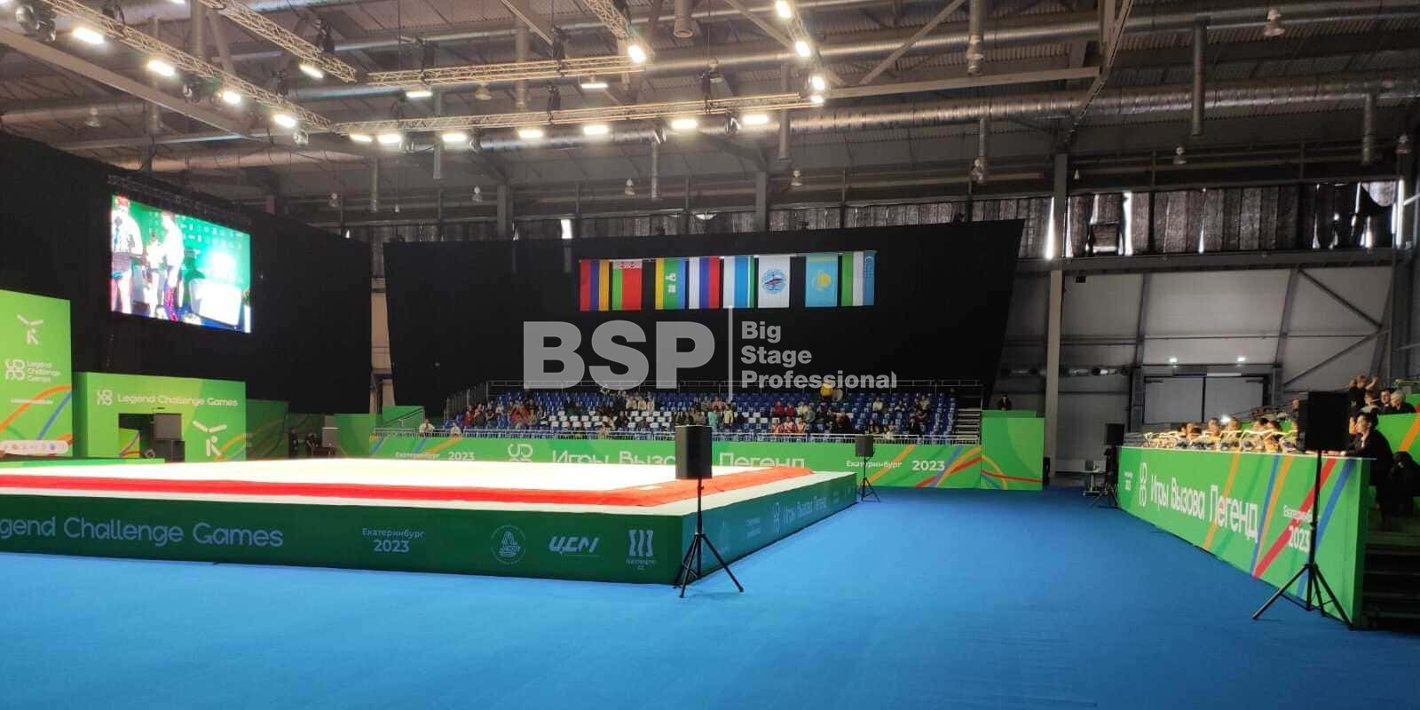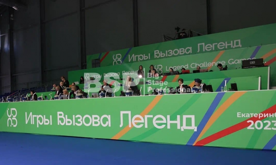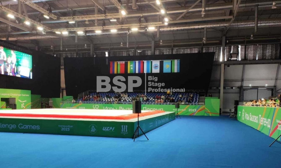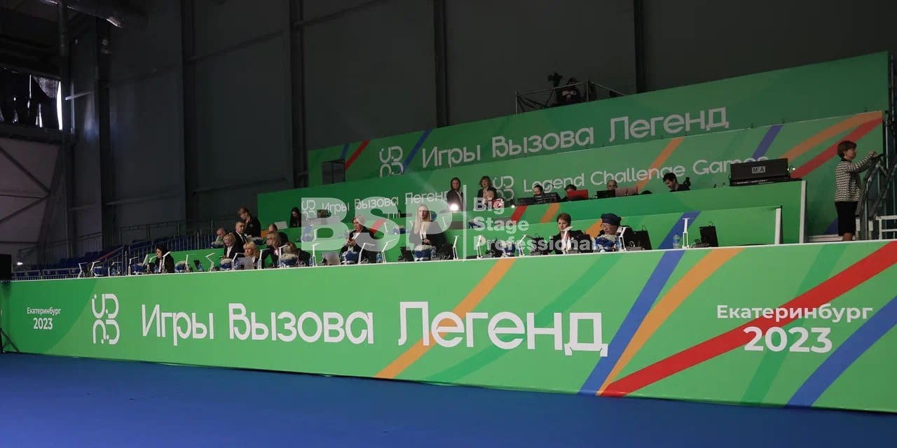 Торжественное закрытие игр состоялось в Центре художественной и эстетической гимнастики. Мы оснастили закрытие нестандартным двухуровневым сценическим планшетом с конструкциями под экраны и световым оборудованием.