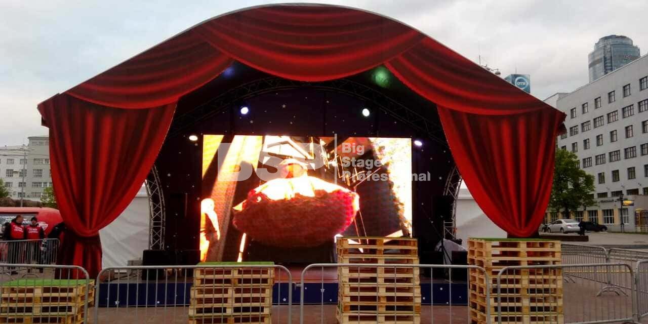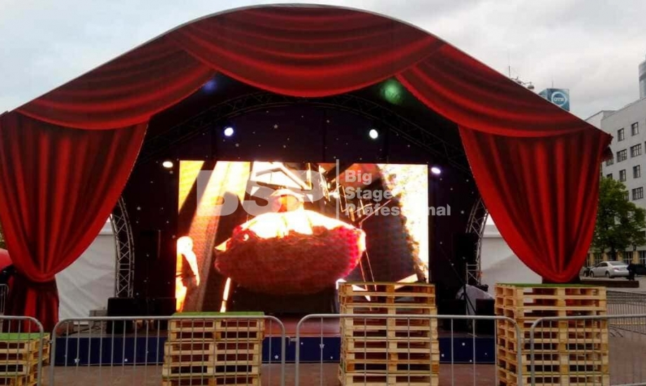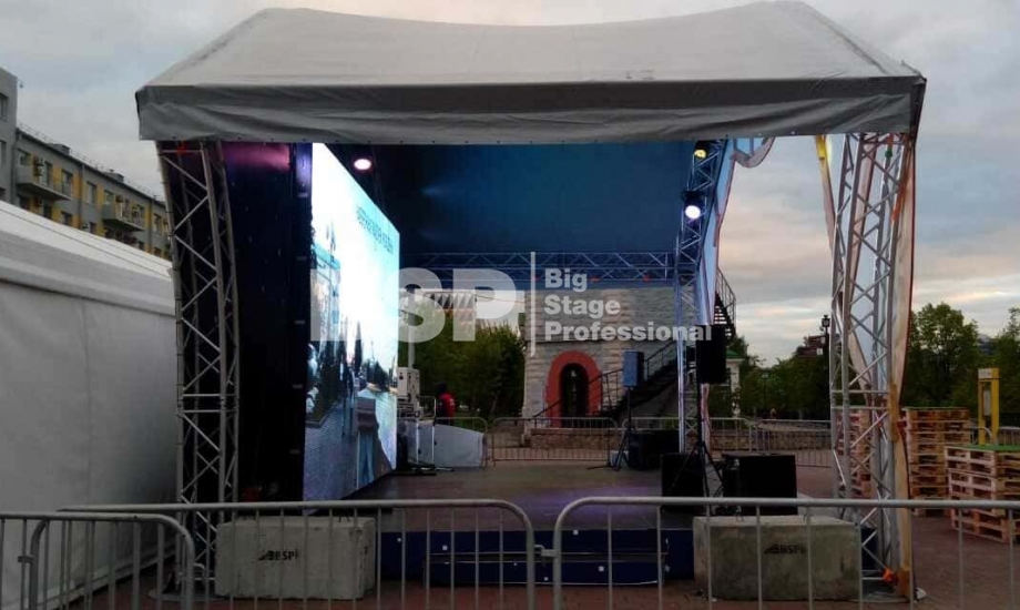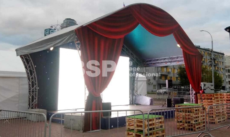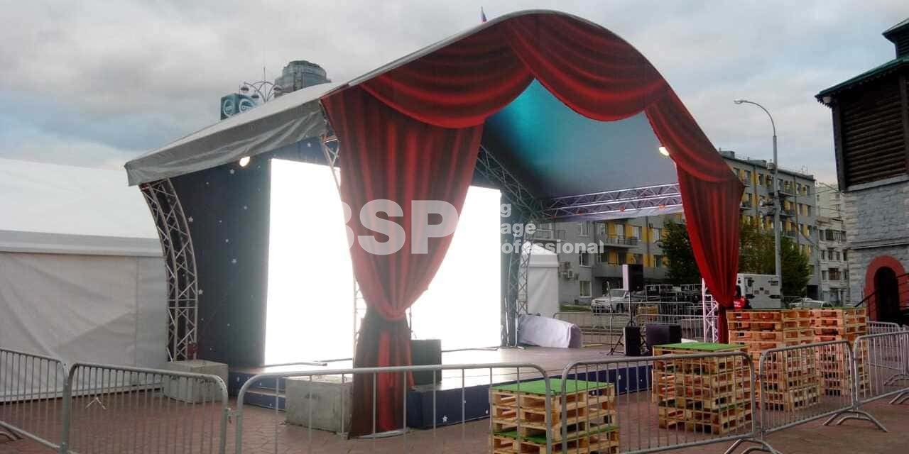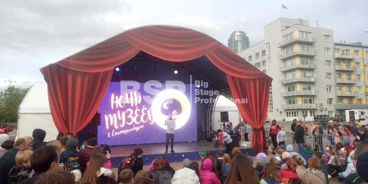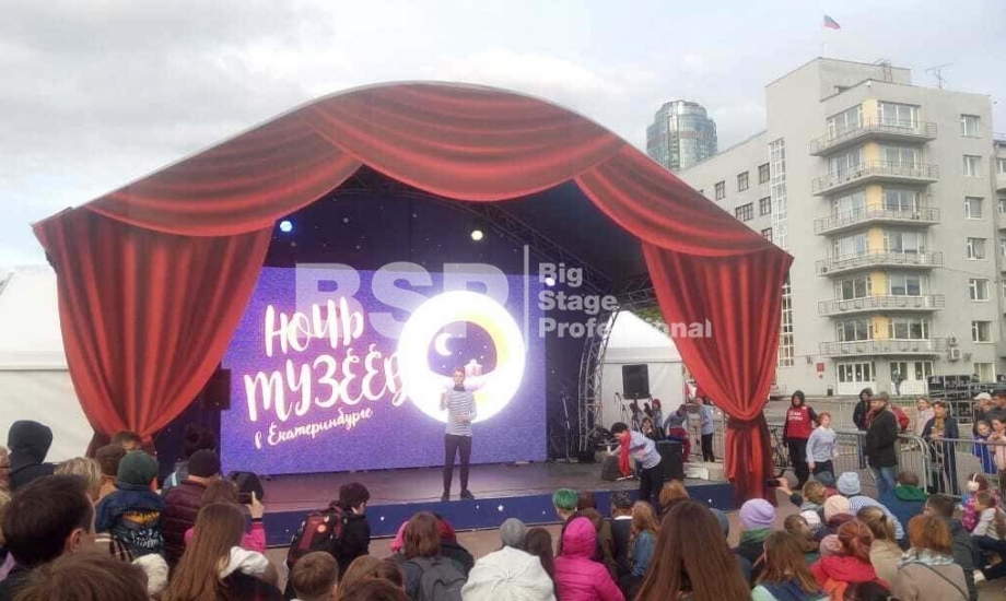 В историческом сквере Екатеринбурга, рядом с водонапорной башней мы установили сценический комплекс с арочной крышей, декорированный под театральную сцену, предоставили световое и энергообеспечивающее оборудование, и ограждения.
