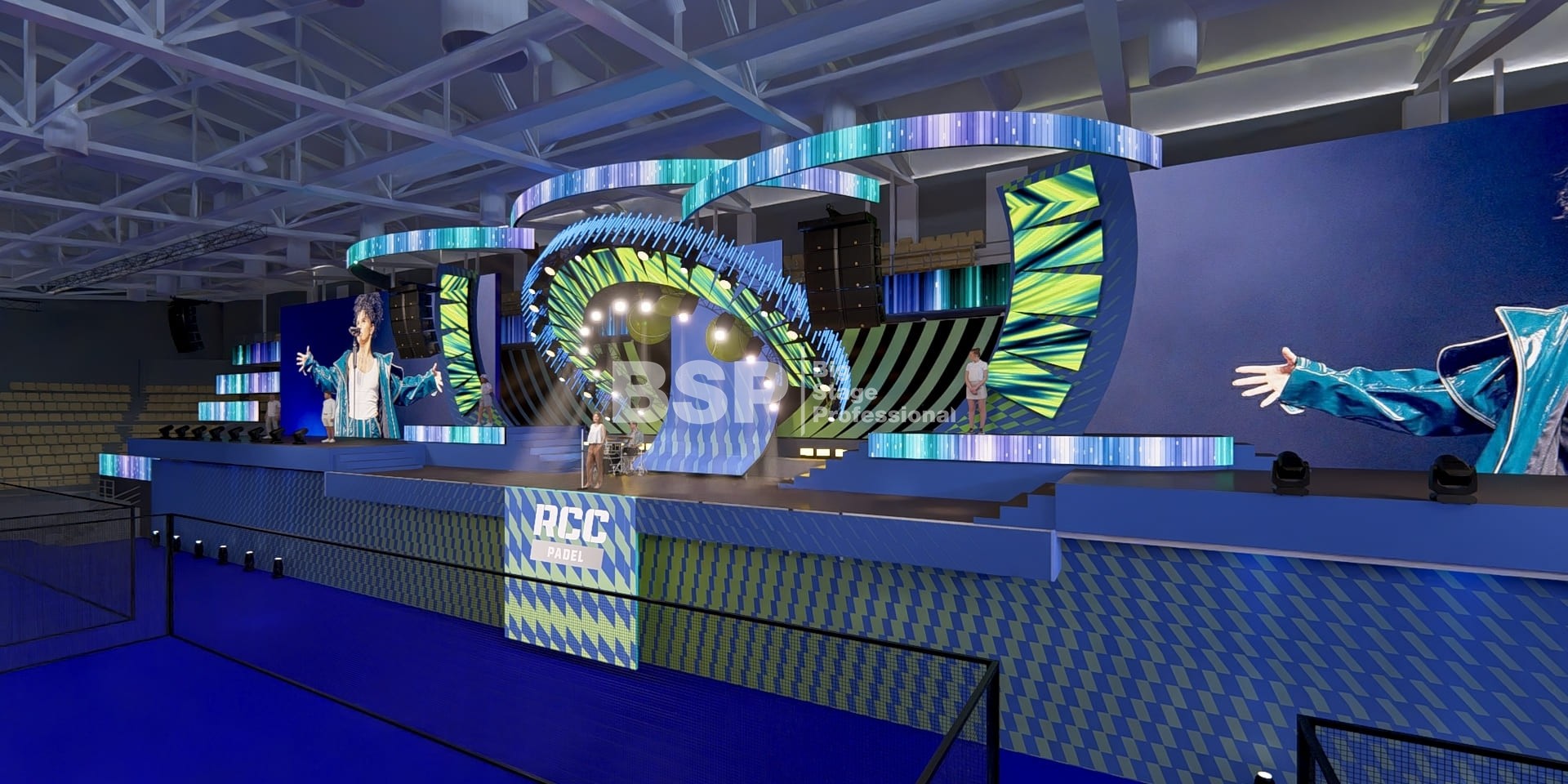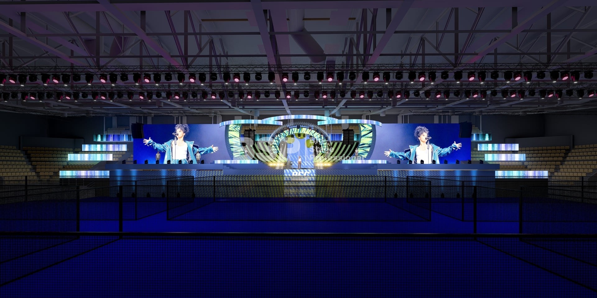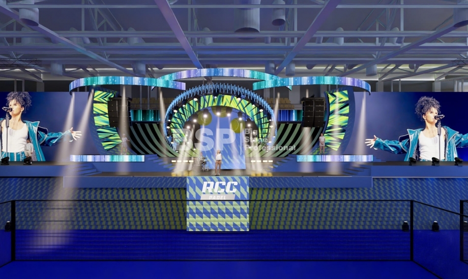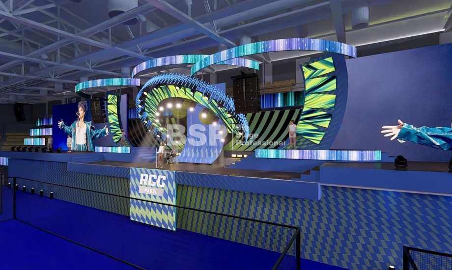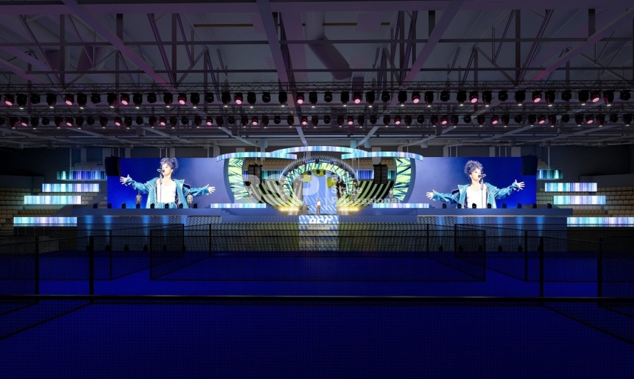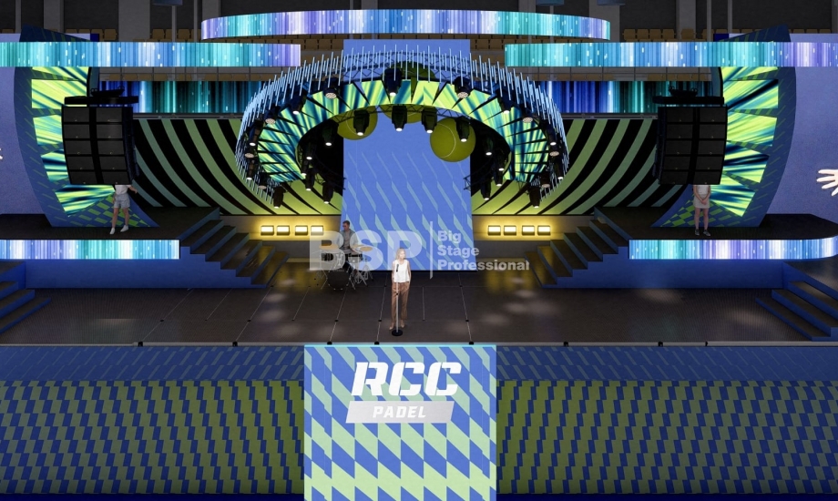 На площадке Падел-арены РМК нами был установлен необычный сценический комплекс, декорированный радиальными фермами. Особенность данного зала в том, что специального места для установки сцены в нём нет и сценический комплекс располагался прямо на зрительских трибунах. Высота сценического планшета от земли почти 4,5 метра и его общая ширина 51 метр. Также мы установили электрообеспечение, световое, звуковое и грузоподъёмное оборудование.