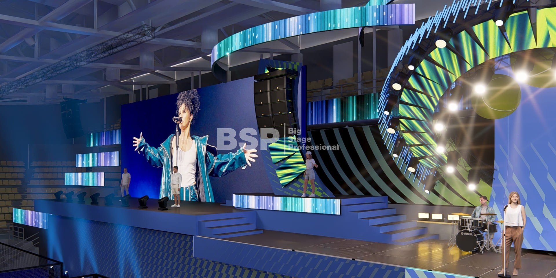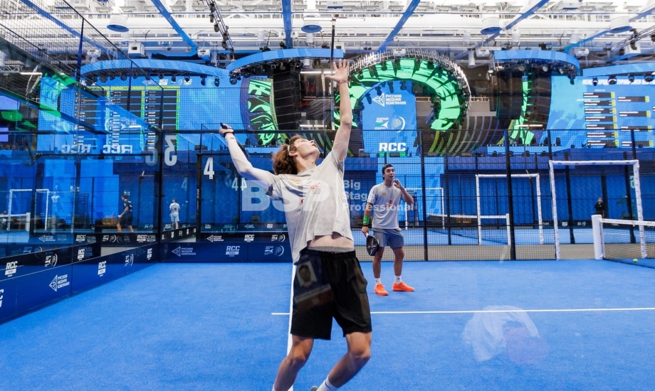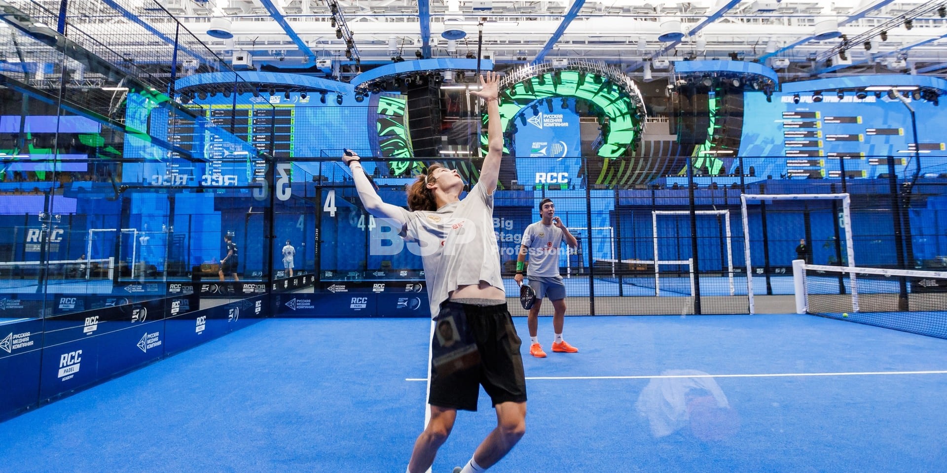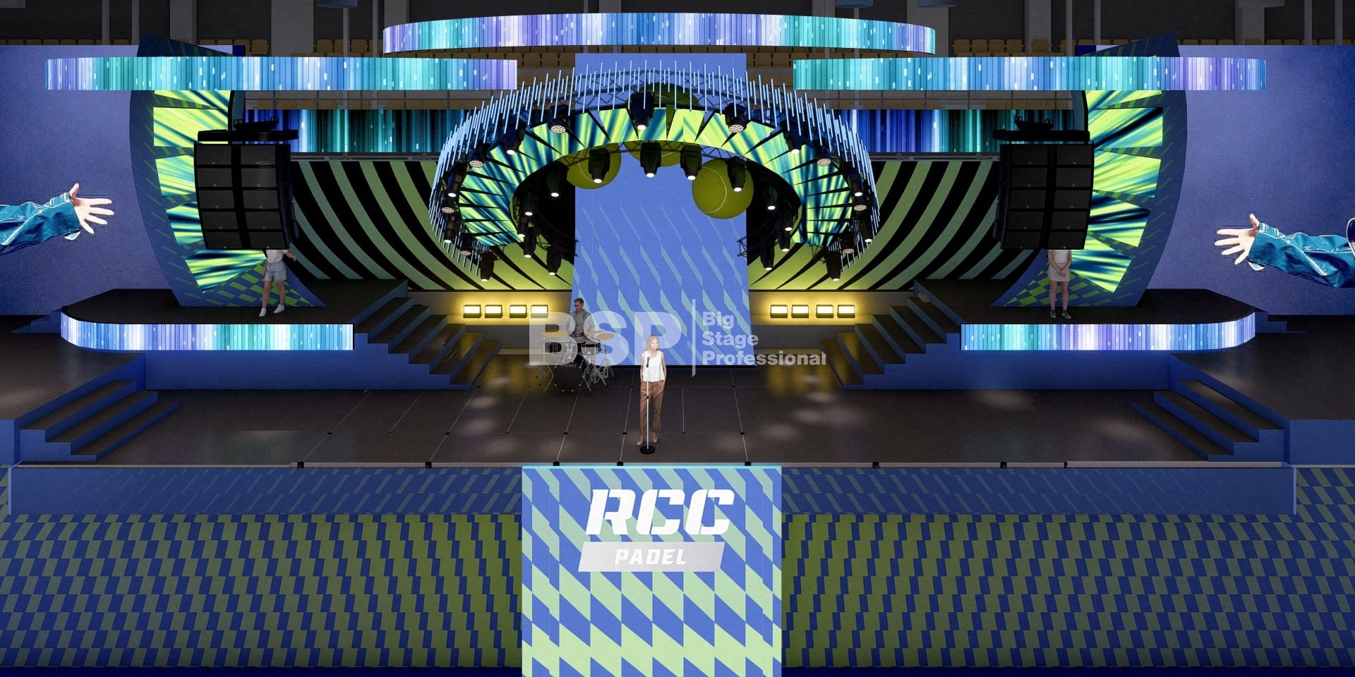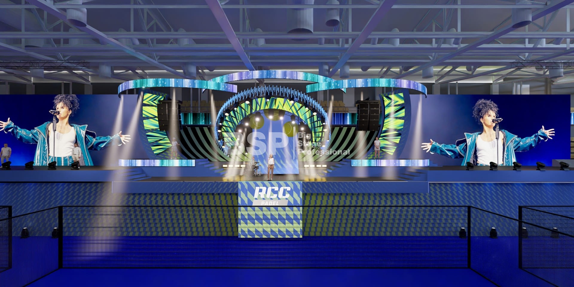 На площадке Падел-арены РМК нами был установлен необычный сценический комплекс, декорированный радиальными фермами. Особенность данного зала в том, что специального места для установки сцены в нём нет и сценический комплекс располагался прямо на зрительских трибунах. Высота сценического планшета от земли почти 4,5 метра и его общая ширина 51 метр. Также мы установили электрообеспечение, световое, звуковое и грузоподъёмное оборудование.