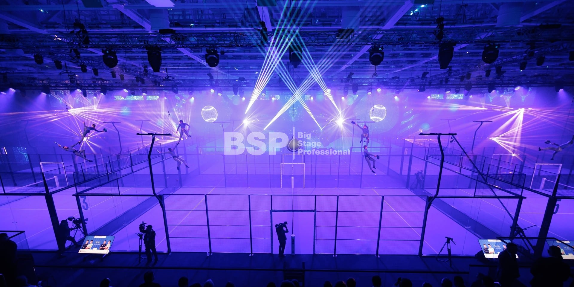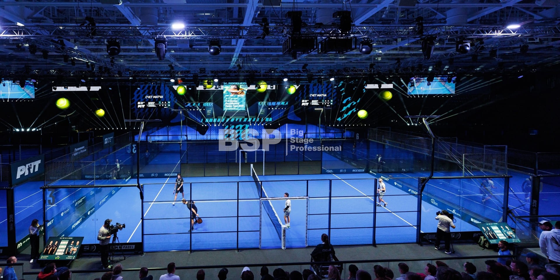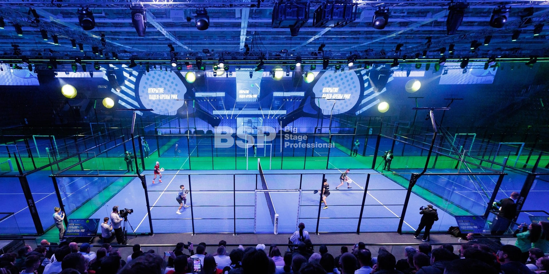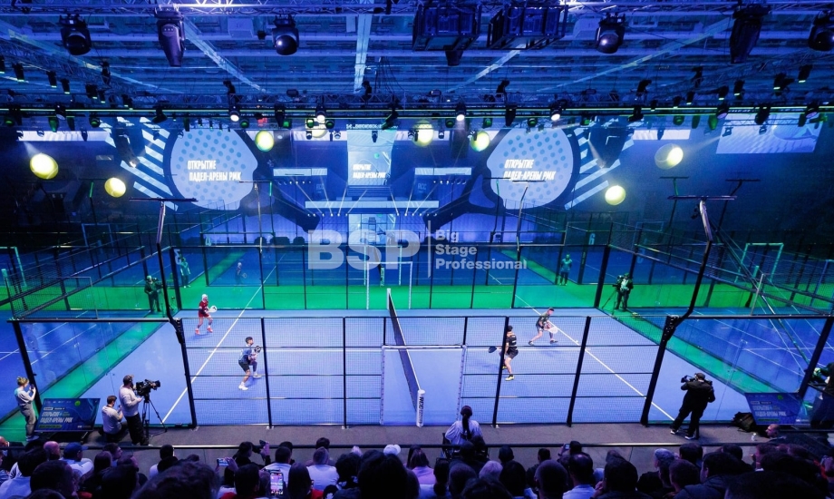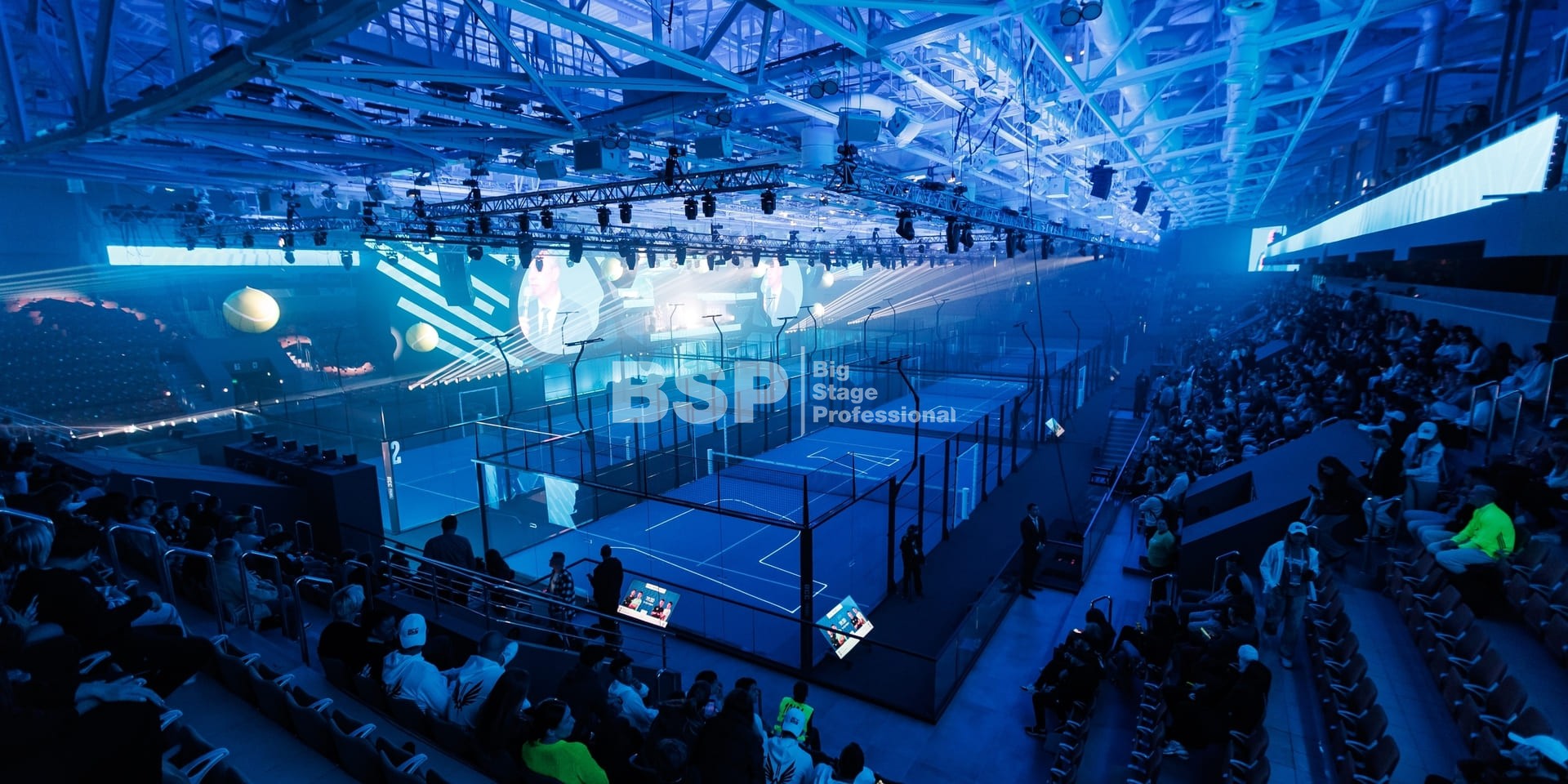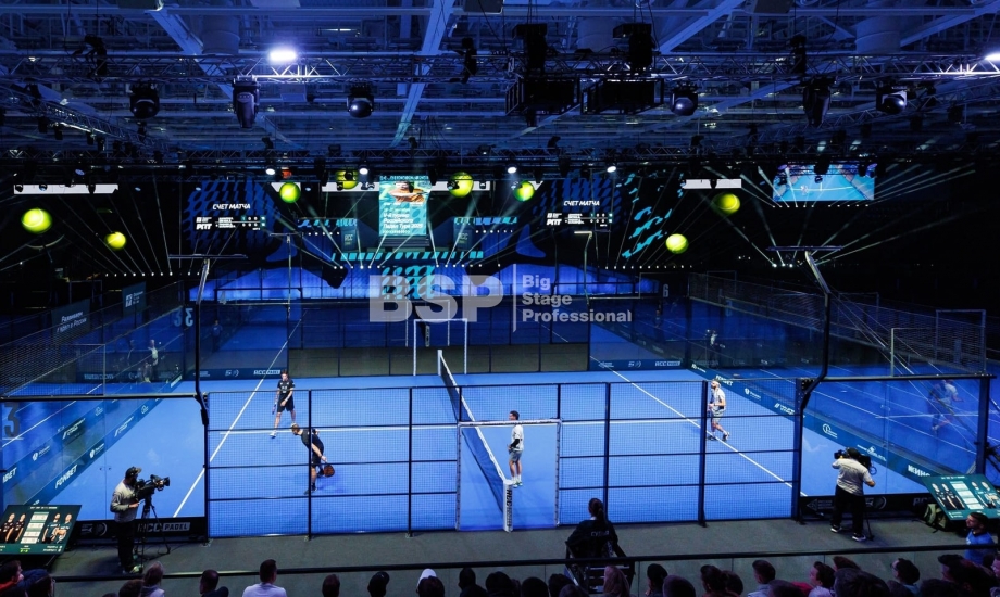 Нас пригласили установить уникальную сцену, которая располагалась прямо на зрительских трибунах. Сценический планшет находился на высоте почти 4 м, выше ограждения кортов для падела, чтобы происходящее было видно каждому зрителю. Сцена имела многоуровневую структуру и множество экранов, два самых больших в виде ракеток для падела. Также мы установили фермовые конструкции, декорации в виде огромных теннисных мячей, световое, звуковое и грузоподъемное оборудование.