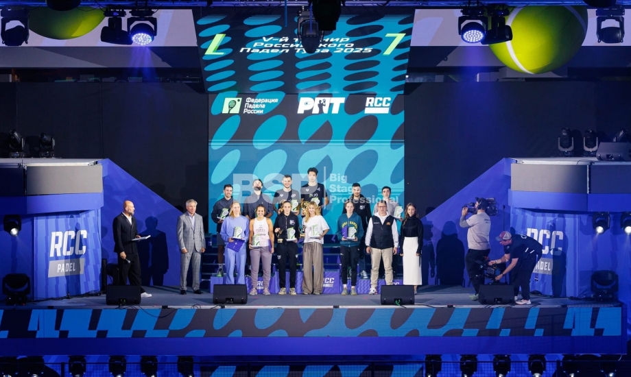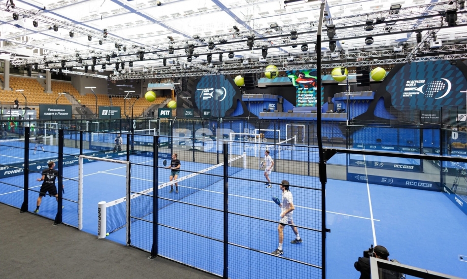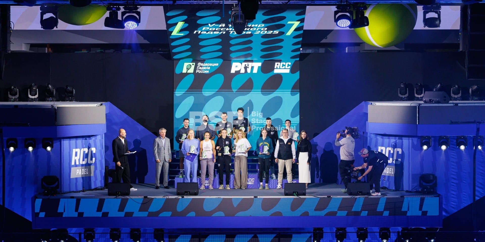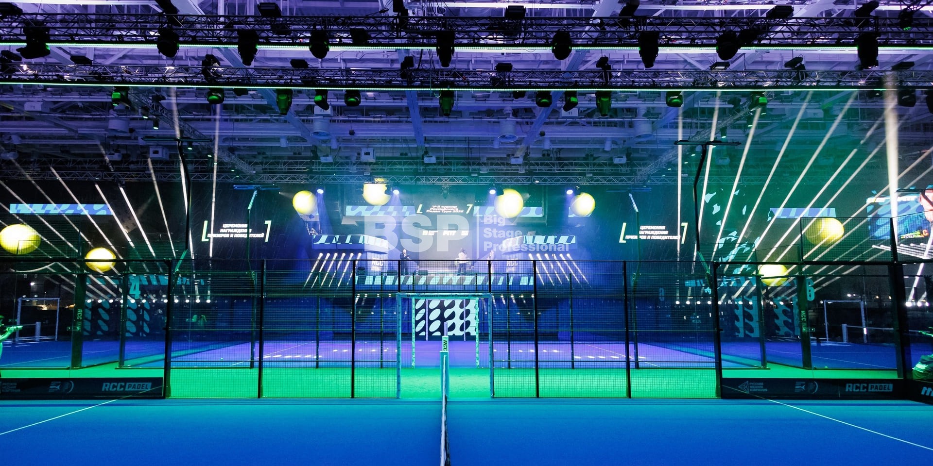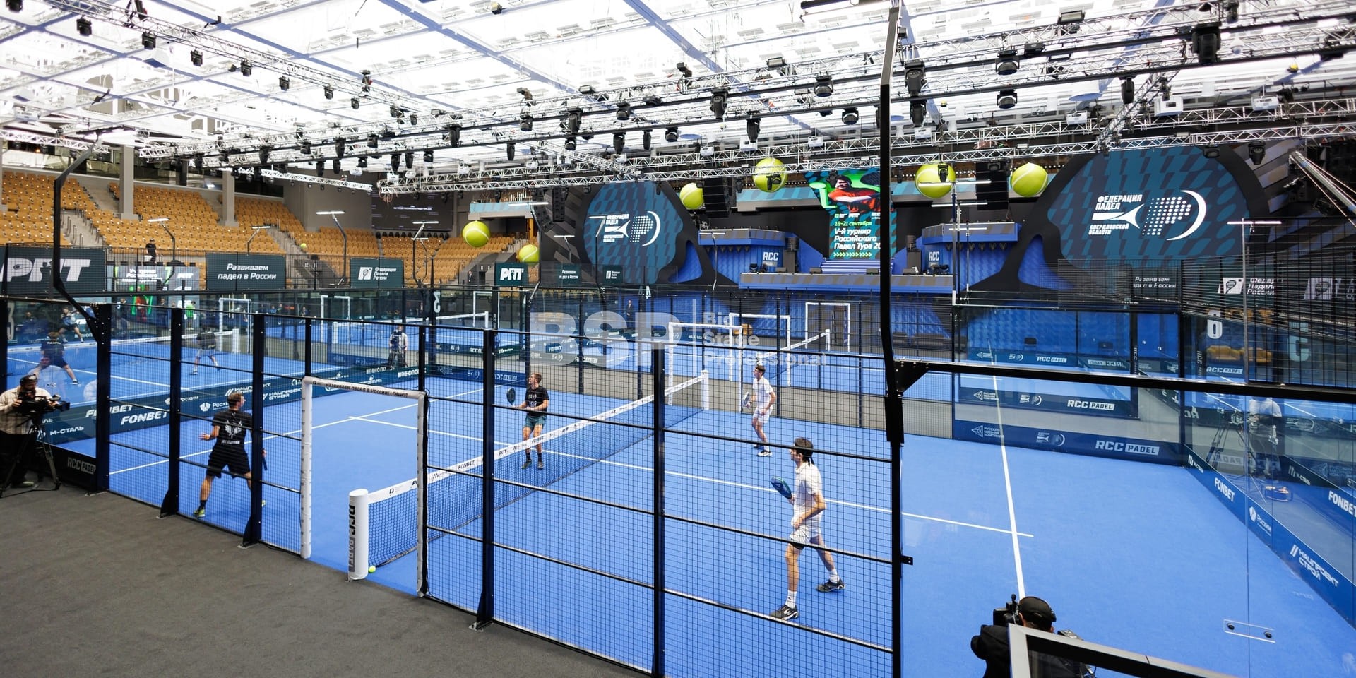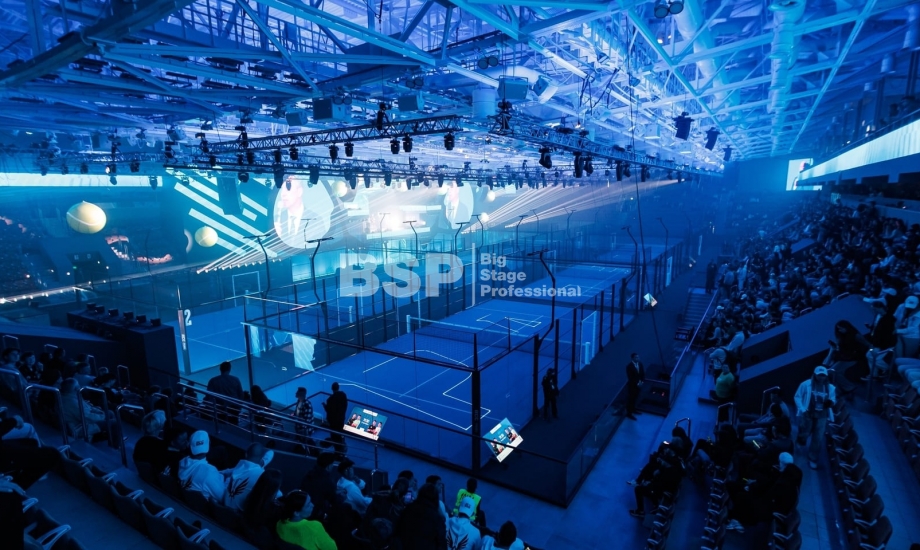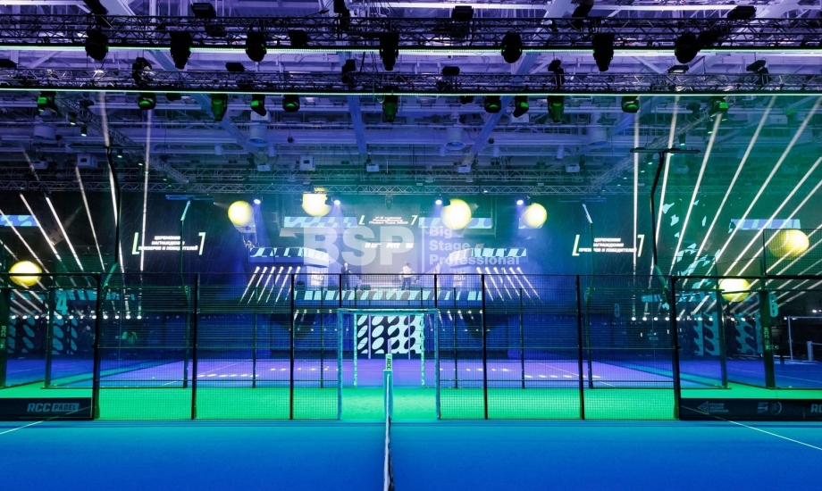 Нас пригласили установить уникальную сцену, которая располагалась прямо на зрительских трибунах. Сценический планшет находился на высоте почти 4 м, выше ограждения кортов для падела, чтобы происходящее было видно каждому зрителю. Сцена имела многоуровневую структуру и множество экранов, два самых больших в виде ракеток для падела. Также мы установили фермовые конструкции, декорации в виде огромных теннисных мячей, световое, звуковое и грузоподъемное оборудование.