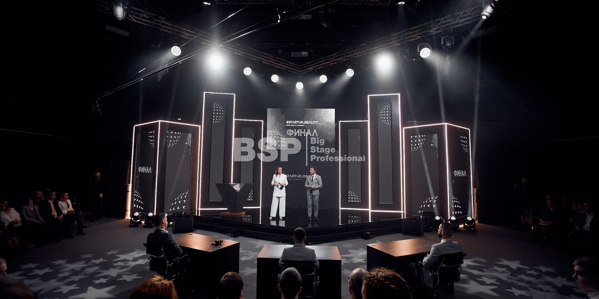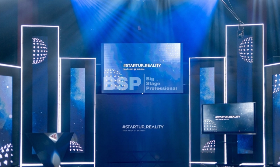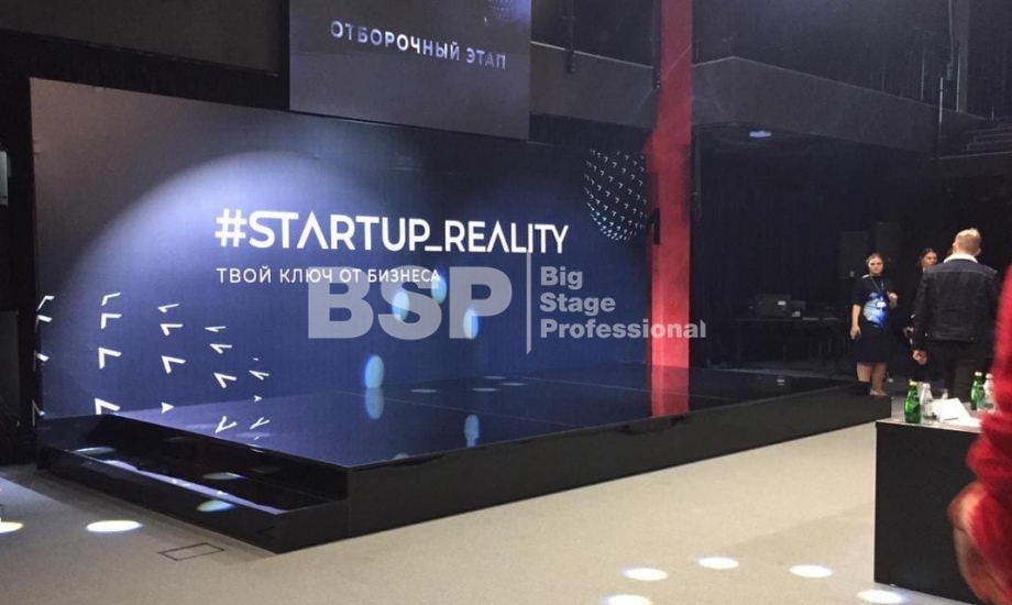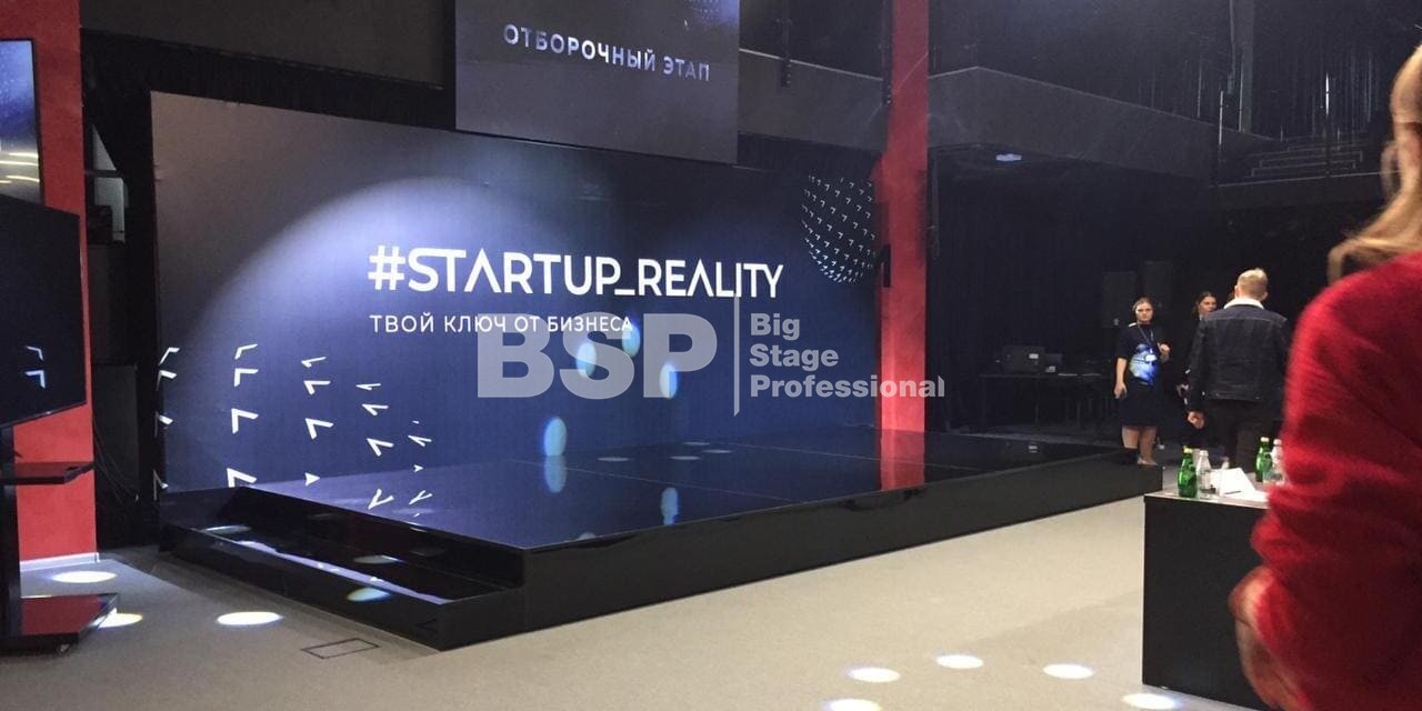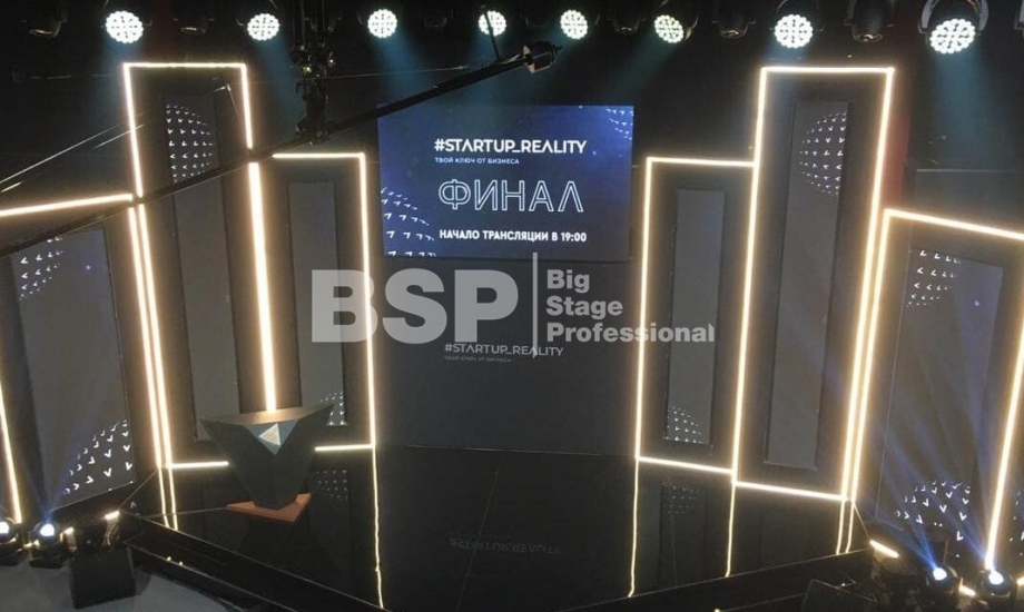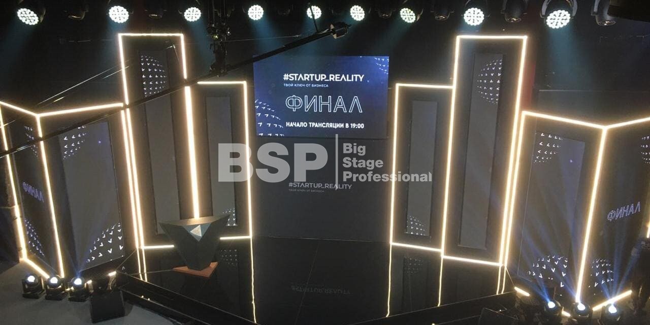 В Академии Единоборств РМК мы установили простой сценичекий планшет с задником для отборочного тура шоу и треугольный сценический планшет с необычным разноуовневым задником и конструкцией для экрана по центру сцены для финала шоу.