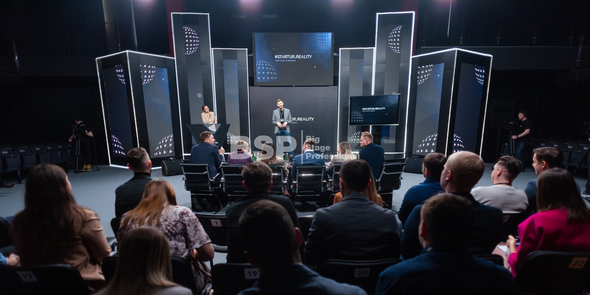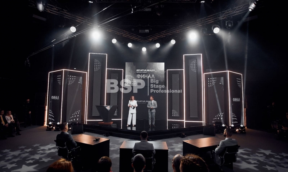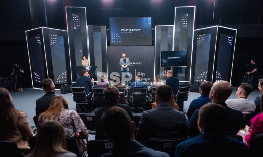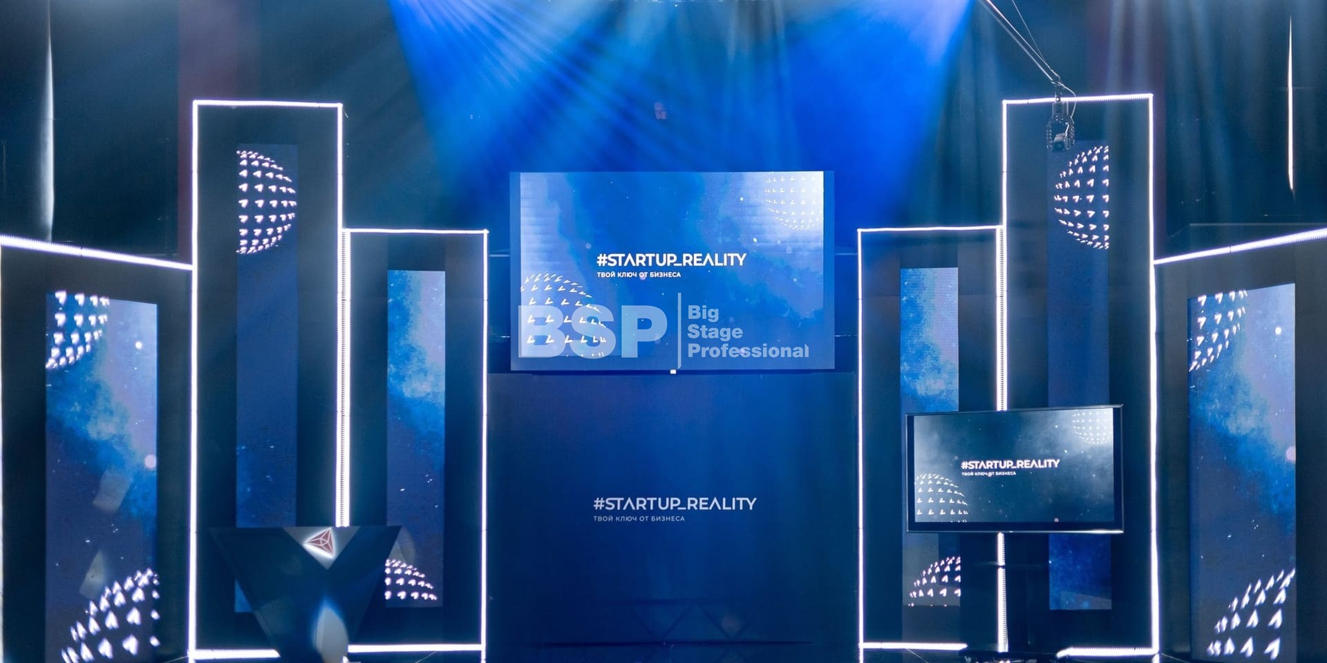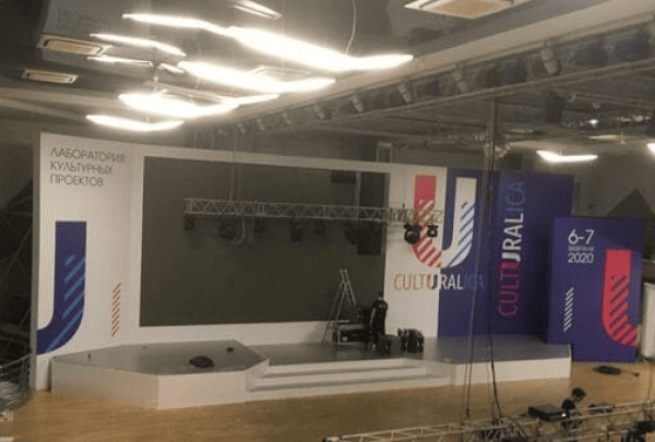 В Академии Единоборств РМК мы установили простой сценичекий планшет с задником для отборочного тура шоу и треугольный сценический планшет с необычным разноуовневым задником и конструкцией для экрана по центру сцены для финала шоу.