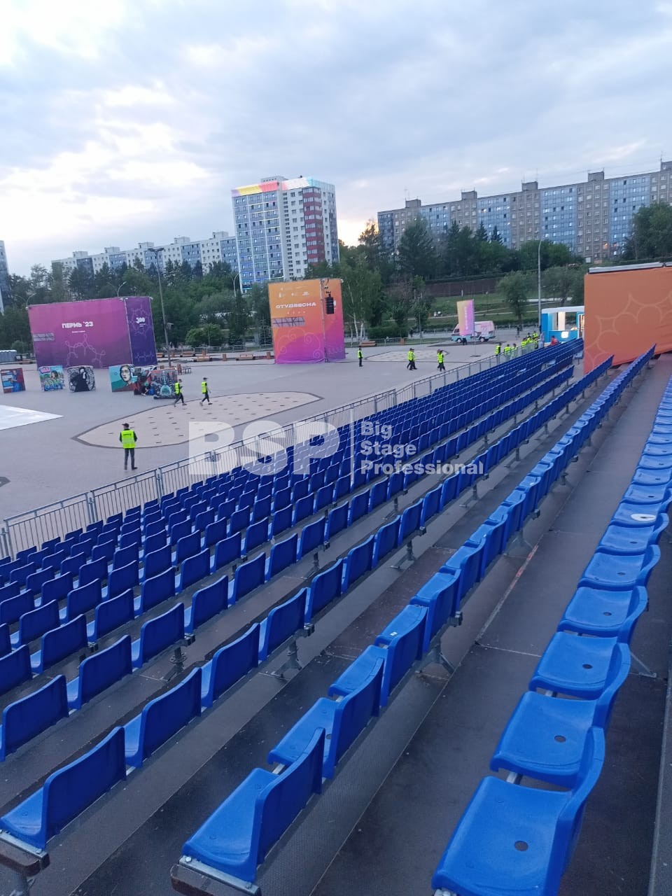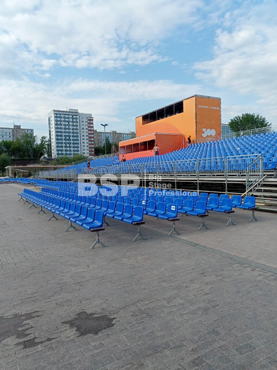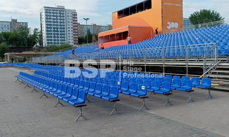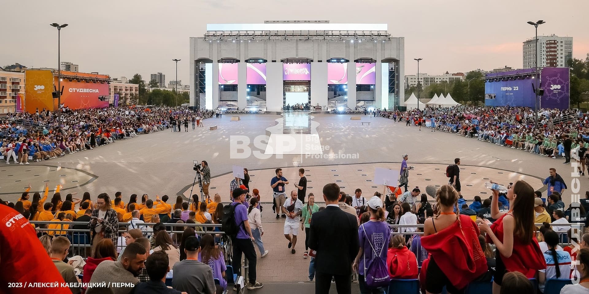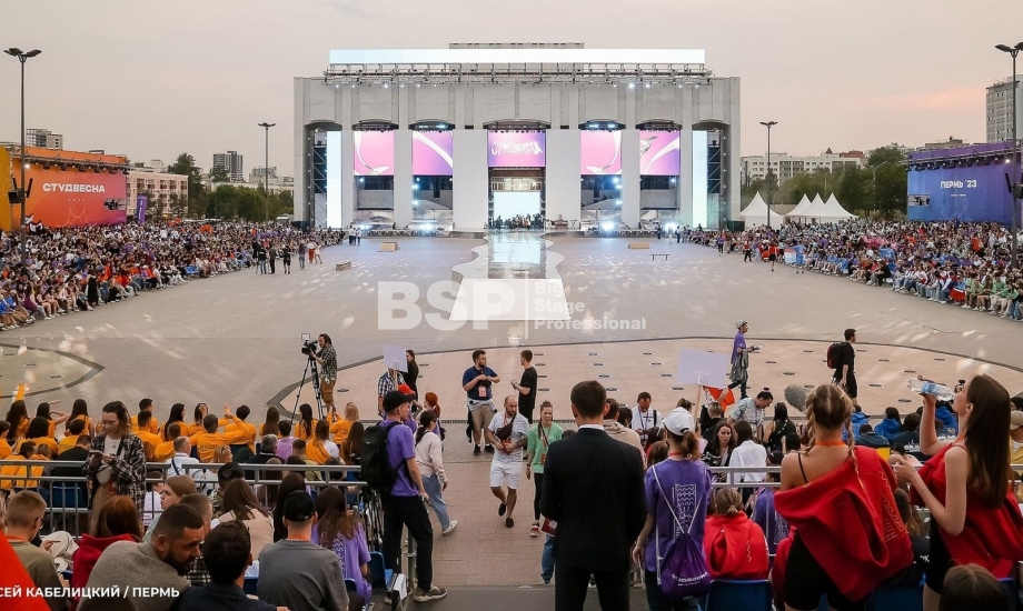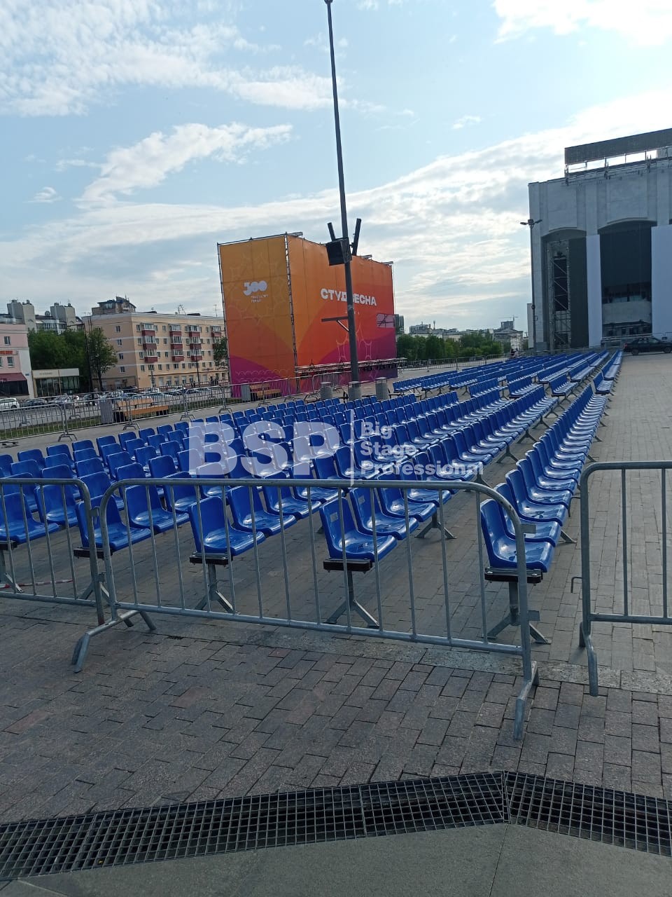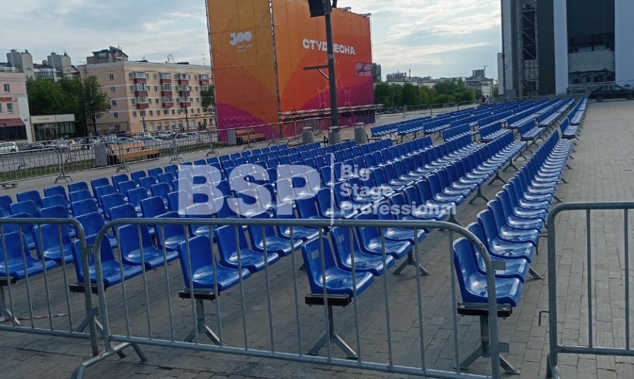 Открытие «Студвесны» состоялось 26 мая перед Театром-Театром, где нами были установлены зрительские трибуны и партер более чем на 3000 мест вместе взятые. Самая большая трибуна имела встроенную пультовую, также возведенную нами.