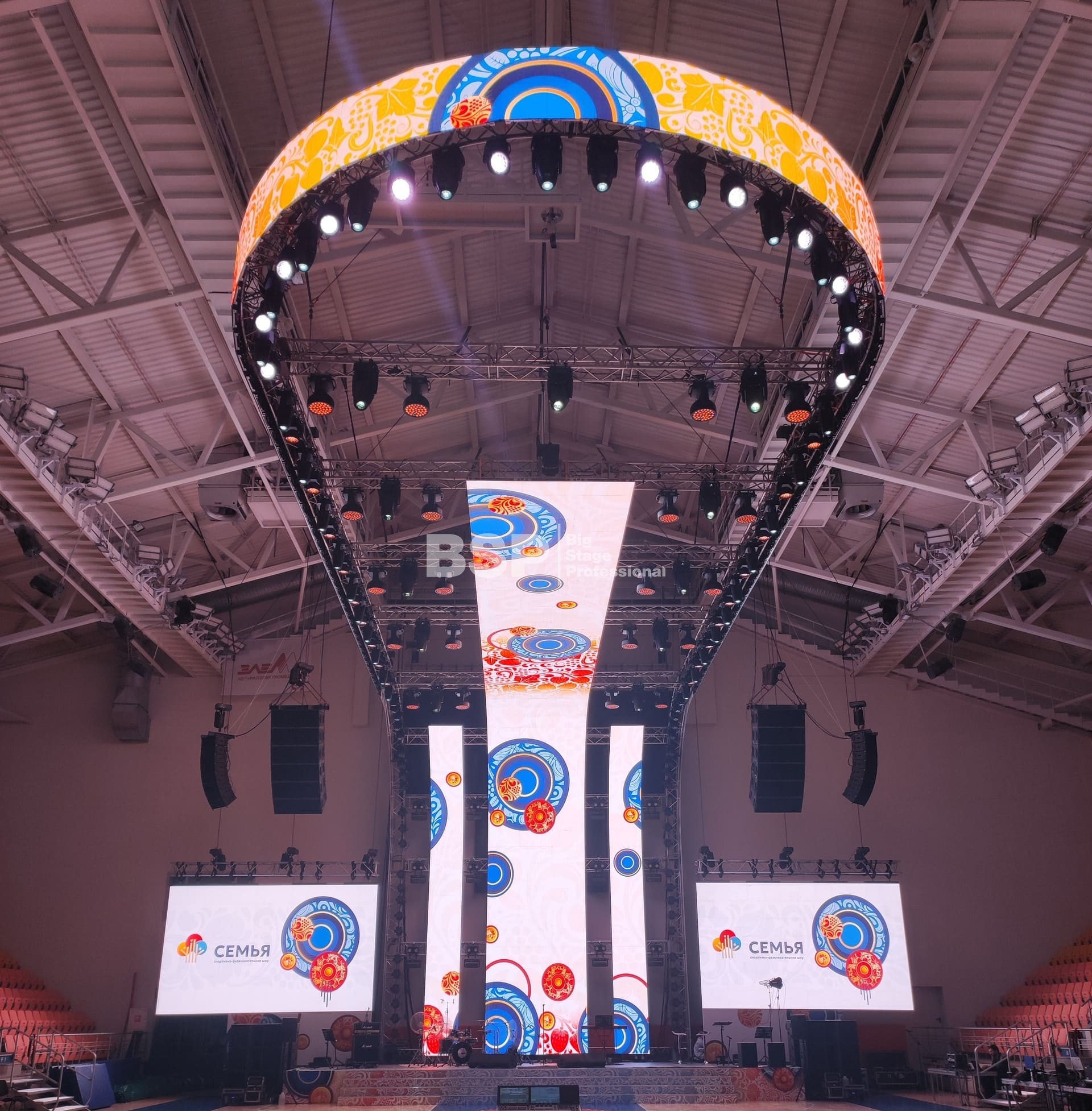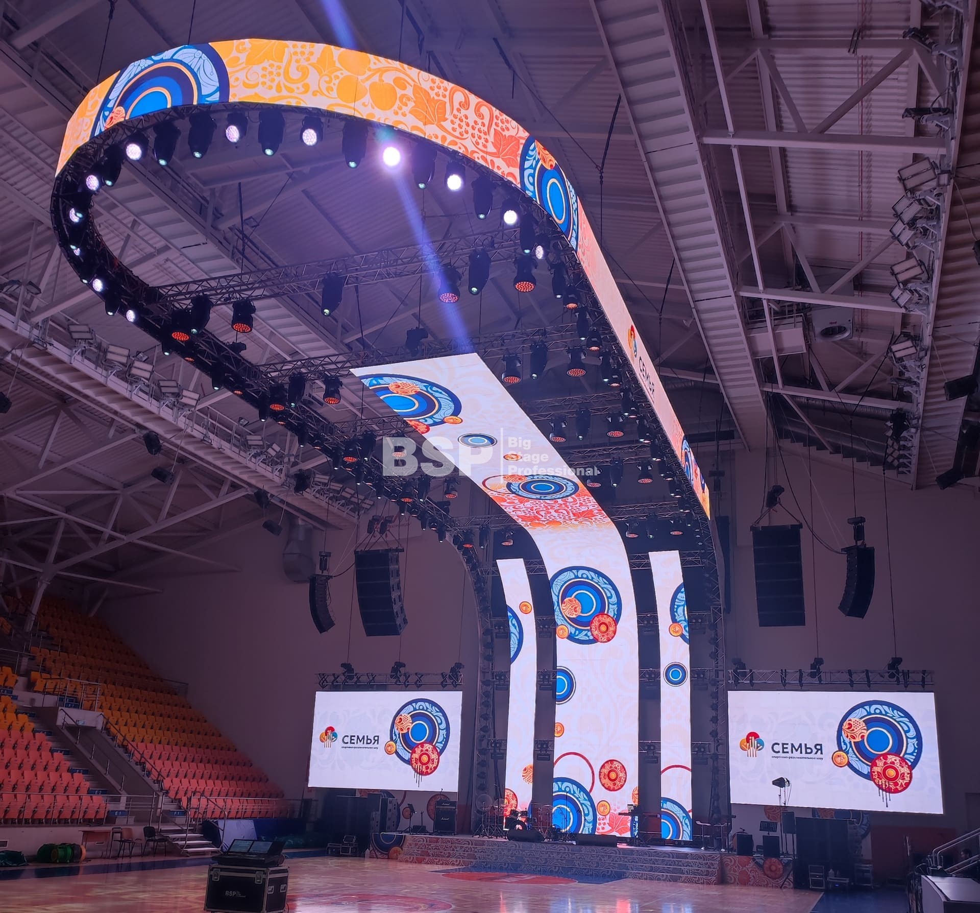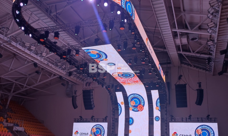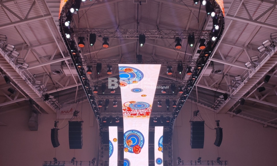 Во Дворце спорта УГМК мы установили сценический планшет и необычную конструкцию из радиусных ферм, на которой мы разместили световое и звуковое оборудование, а наши партнёры смонтировали экраны.