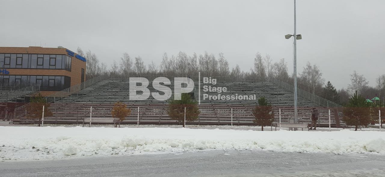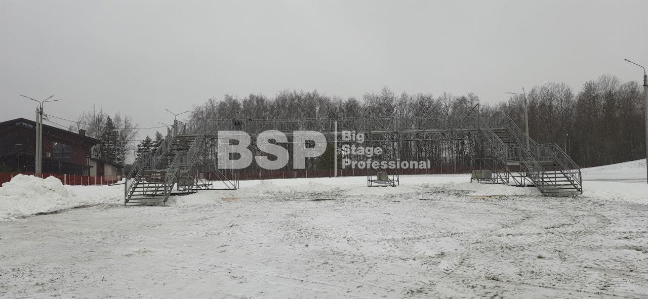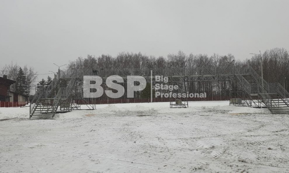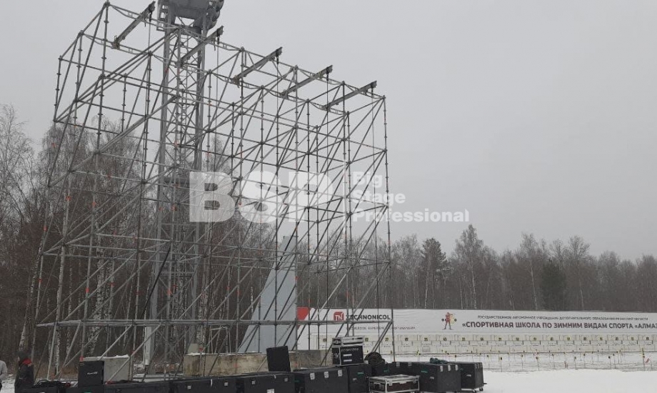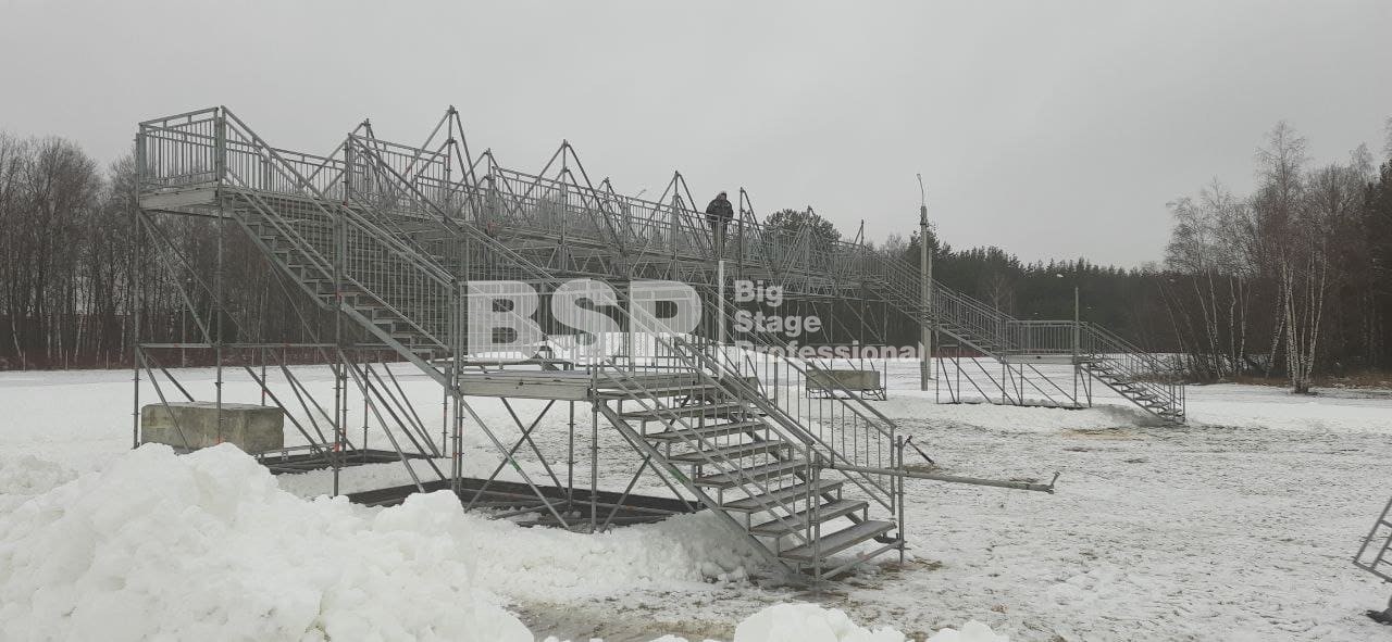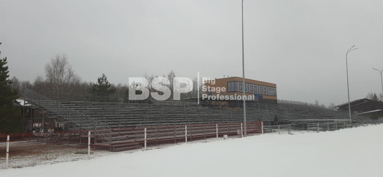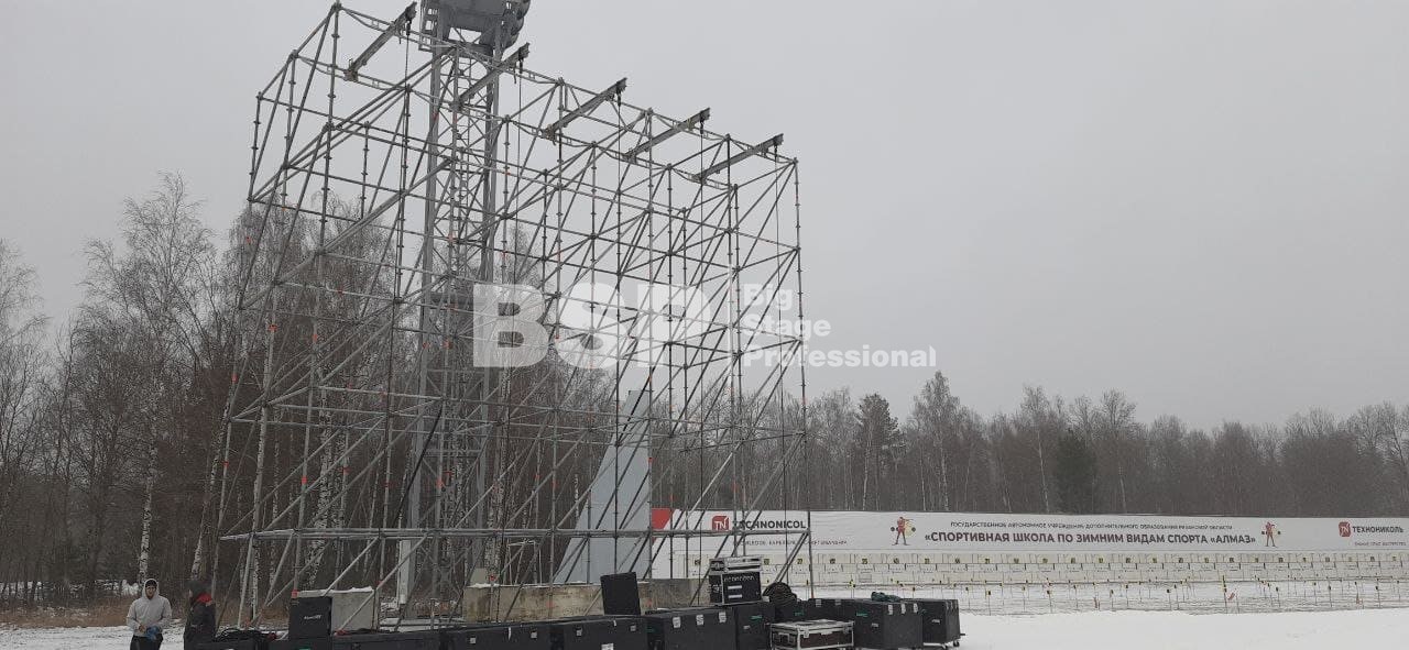 На биатлонном комплексе "Алмаз" нами был установлен трибунный комплекс c планшетом, конструкция для экрана, камерные платформы и мост над лыжной трассой.