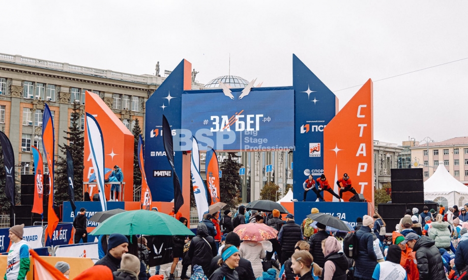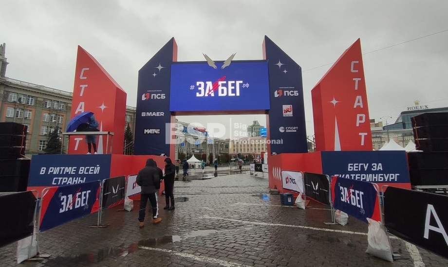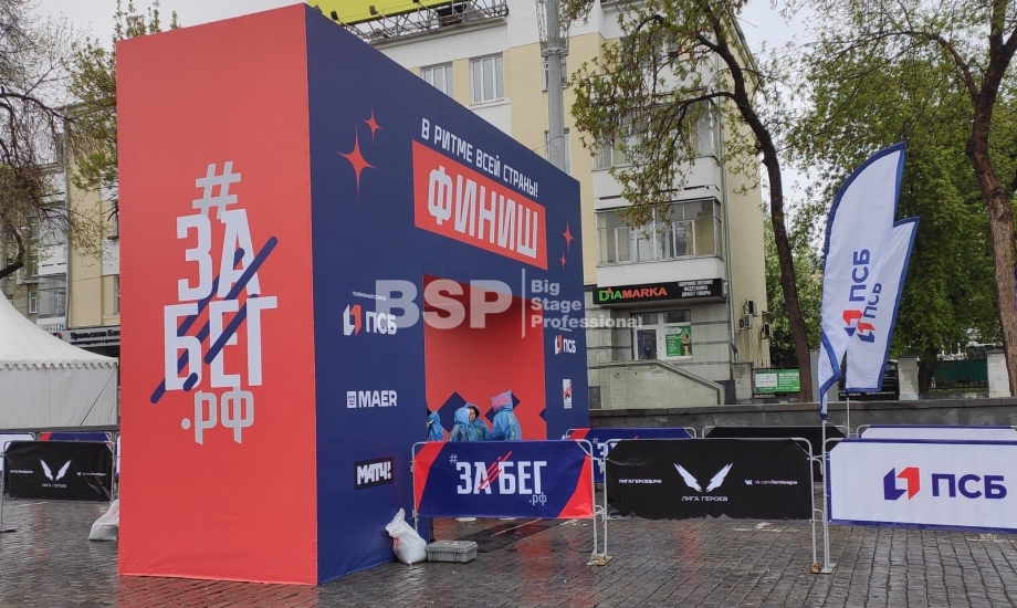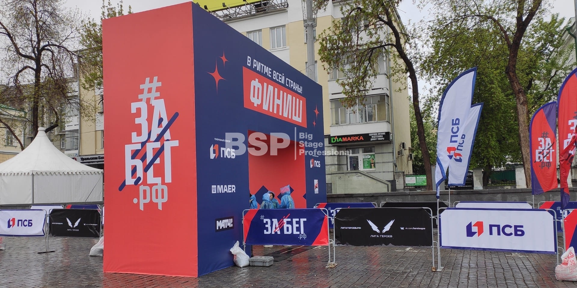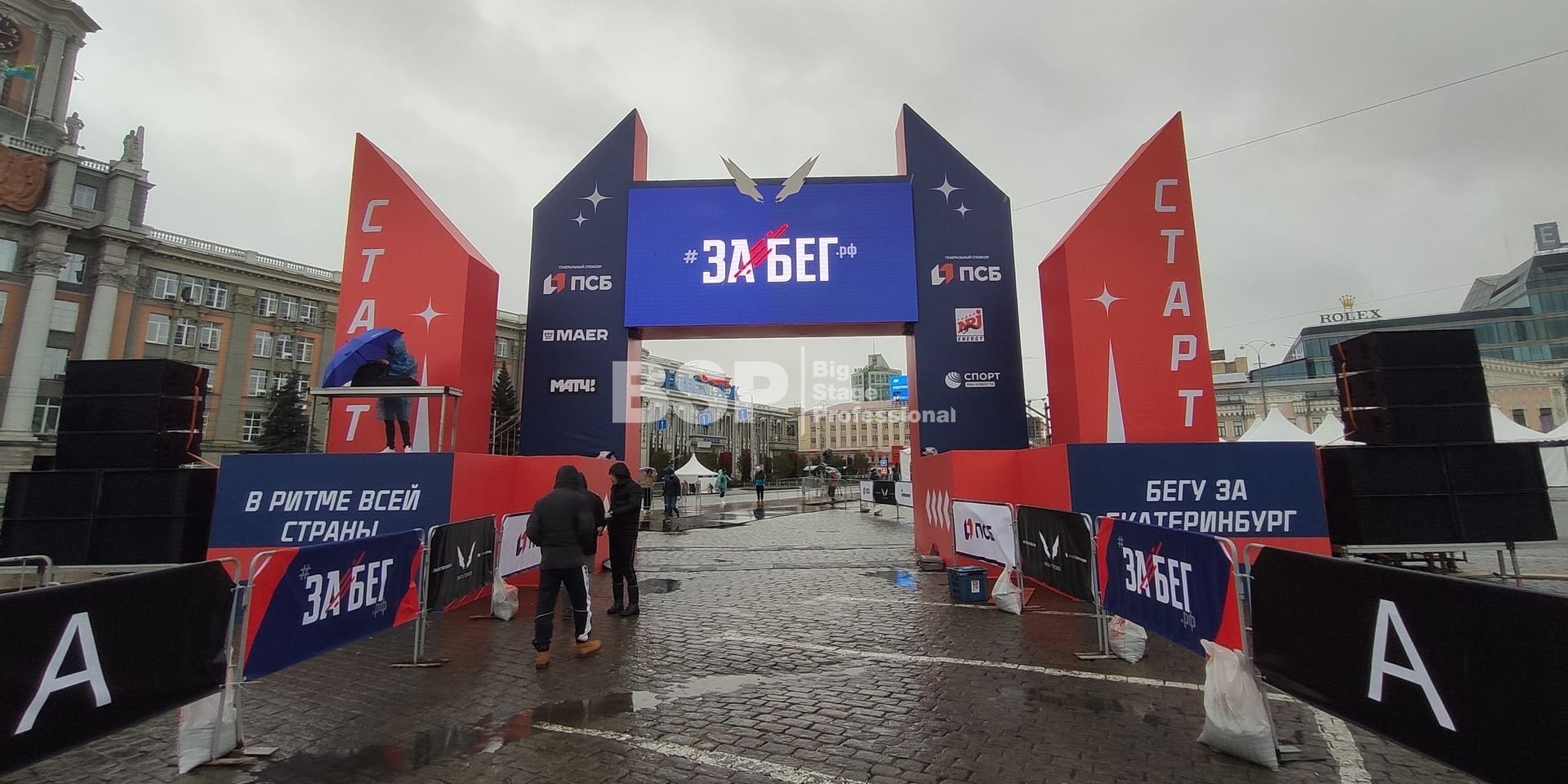 На Площади 1905 года мы установили стартовую арку совмещенную с двумя небольшими сценическими планшетами, финишную арку, двухстороннюю конструкцию для фото-видео зоны, гардероб, а также оснастили полумарафон звуковым оборудованием.