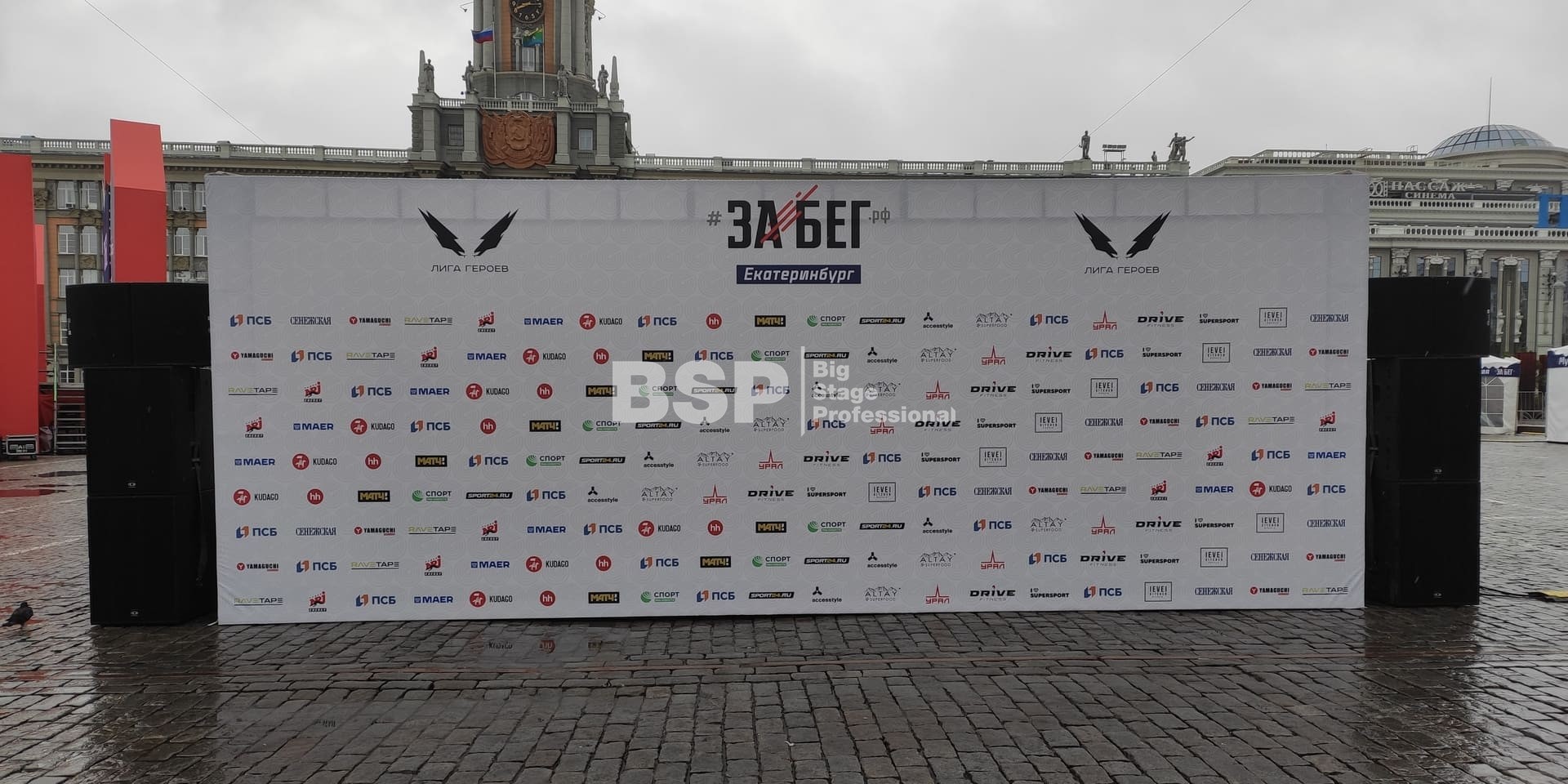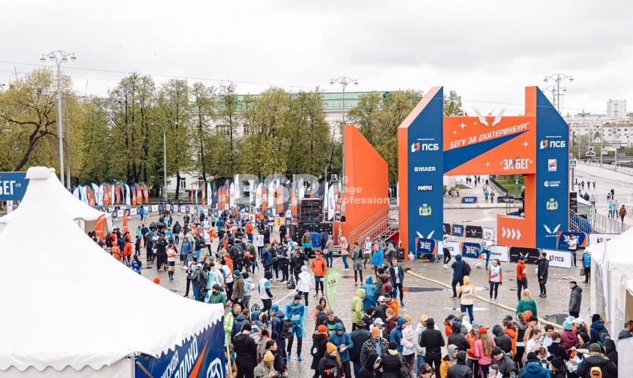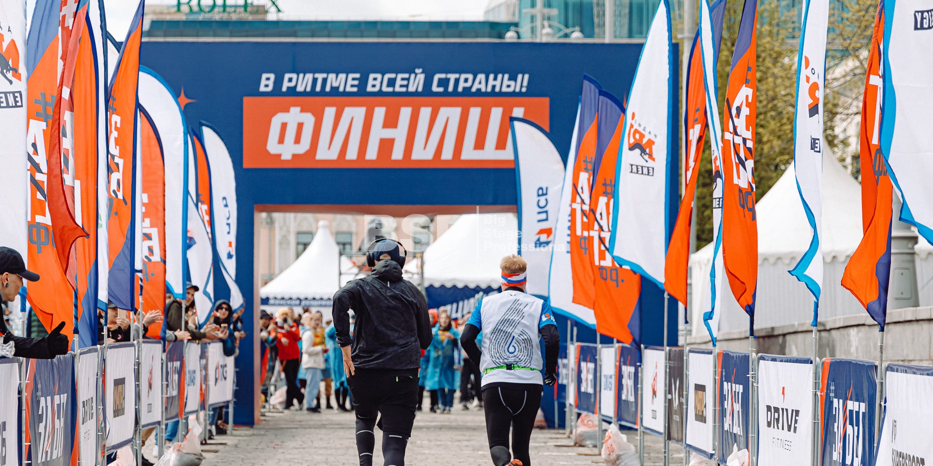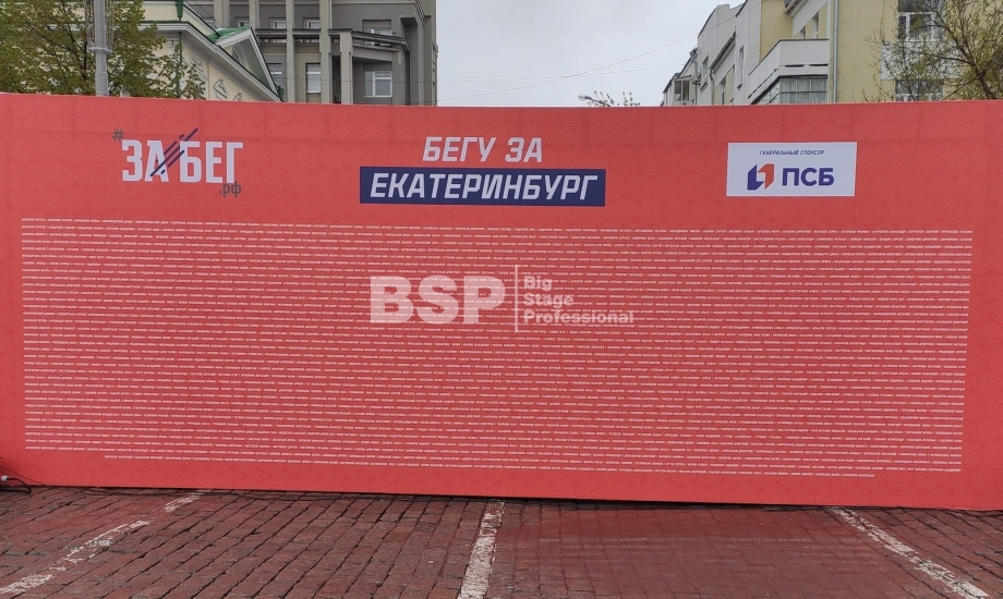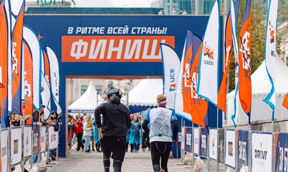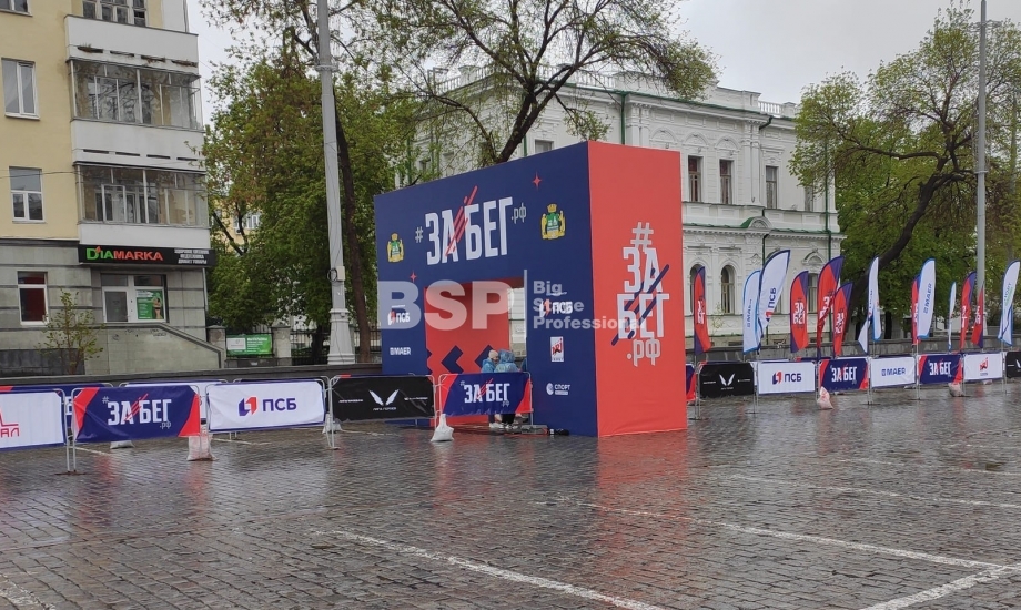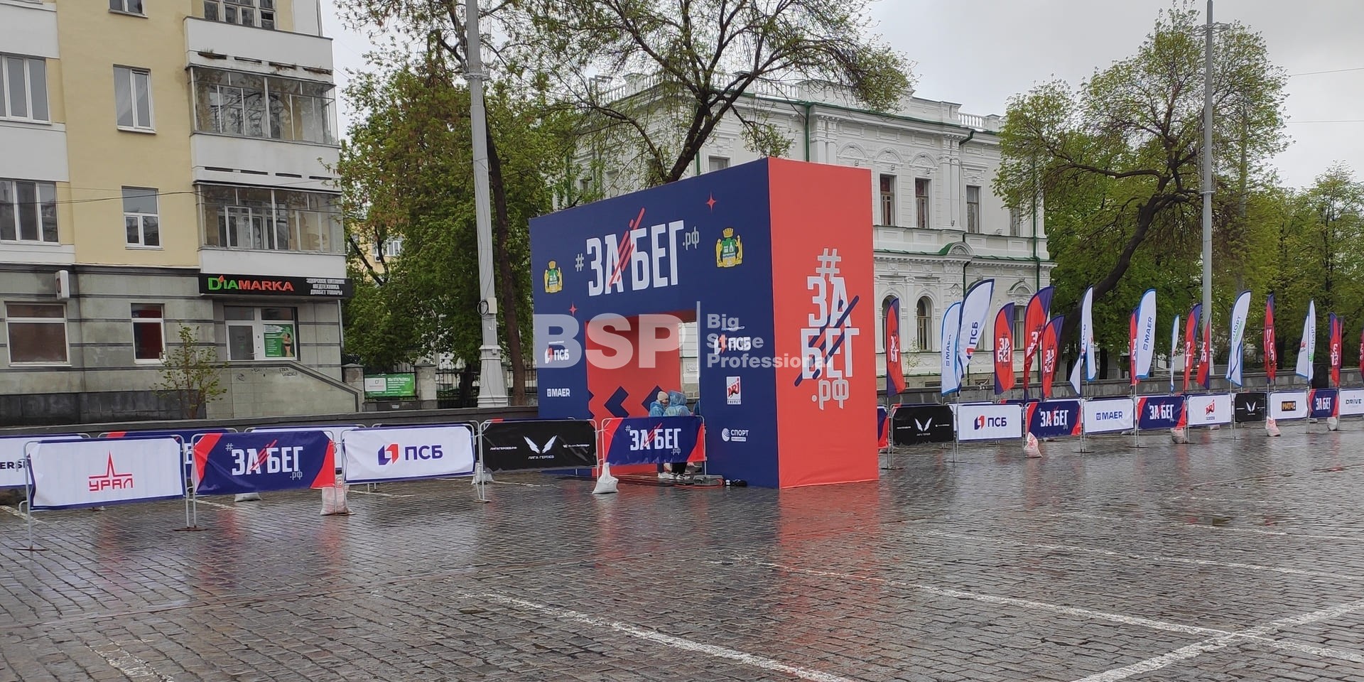 На Площади 1905 года мы установили стартовую арку совмещенную с двумя небольшими сценическими планшетами, финишную арку, двухстороннюю конструкцию для фото-видео зоны, гардероб, а также оснастили полумарафон звуковым оборудованием.
