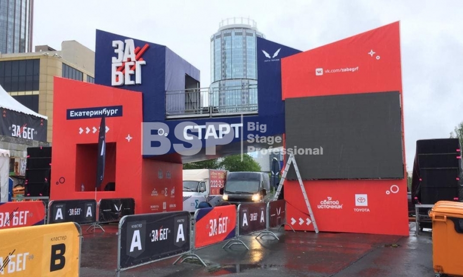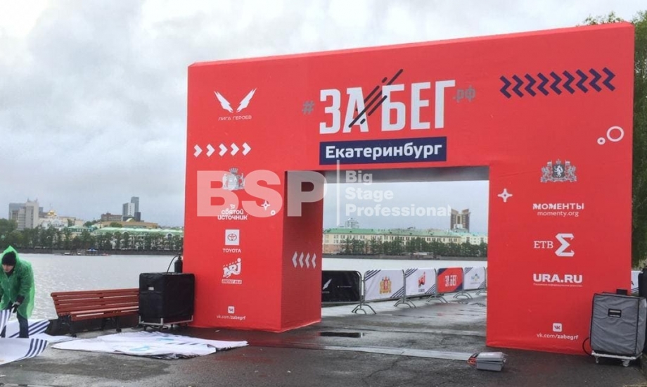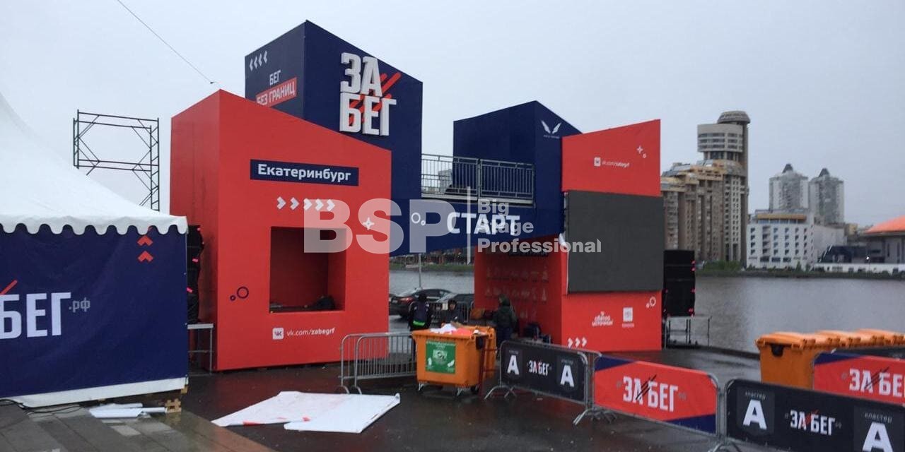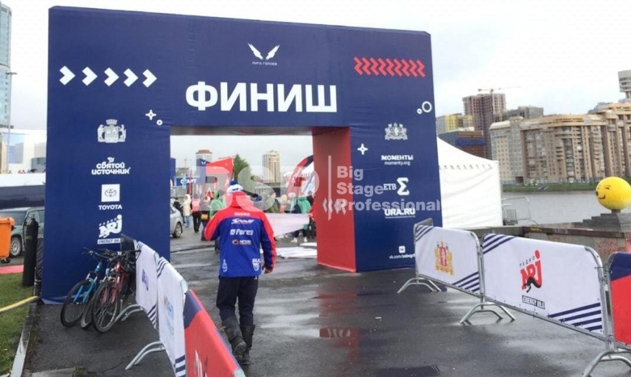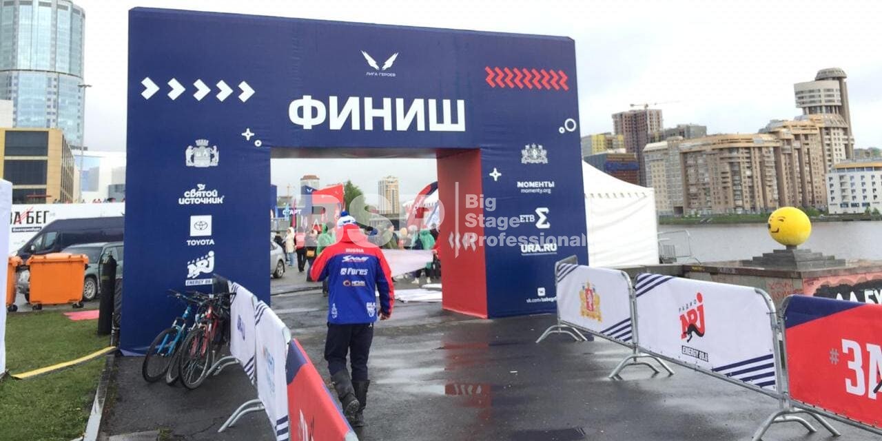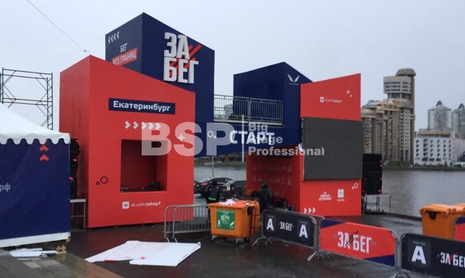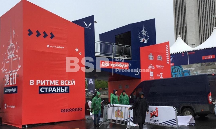 На Октябрьской площади мы установили стартовую арку с балконом и конструкцией для экрана, финишную арку, пультовую, два пресс-волла, один из которых был двусторонний, подиумы для звука, гаунд с крышей для спонсора мероприятия, мобильный гардероб, звуковое, энергообеспечивающее и климат-оборудование.