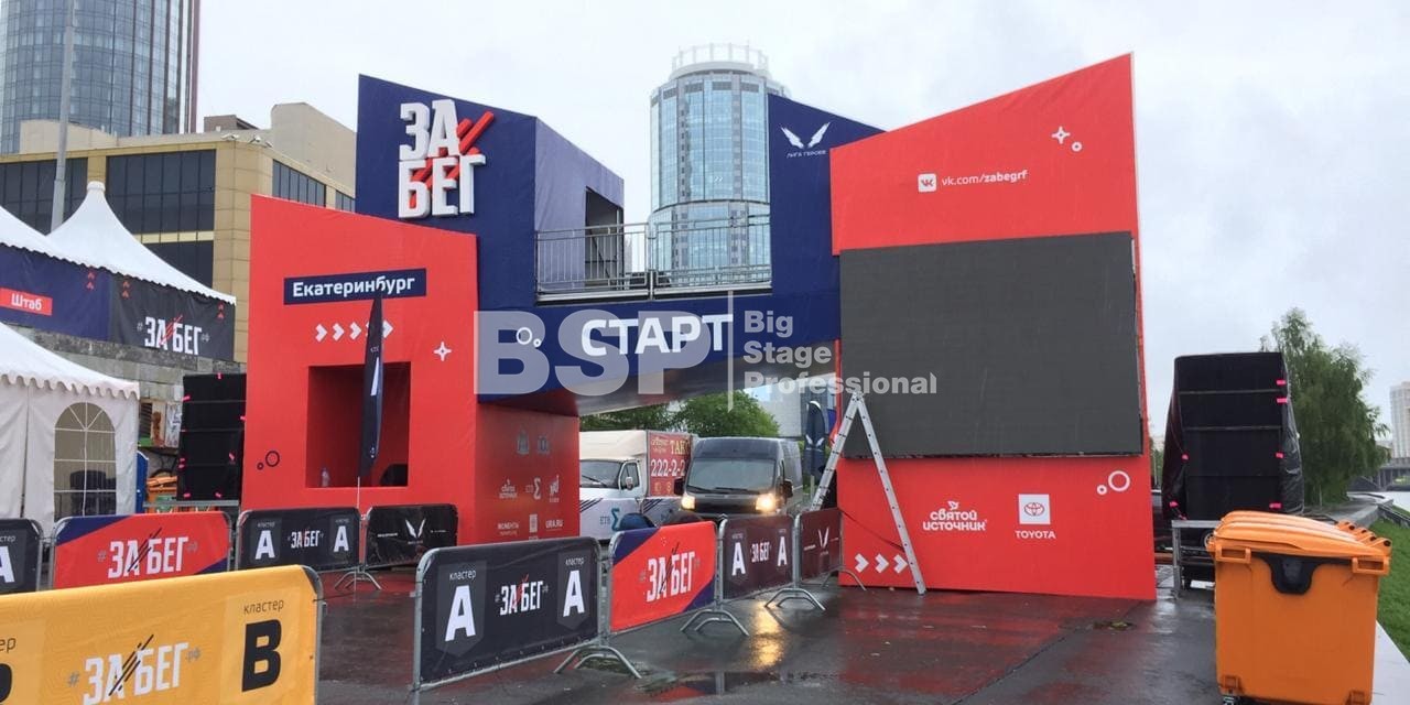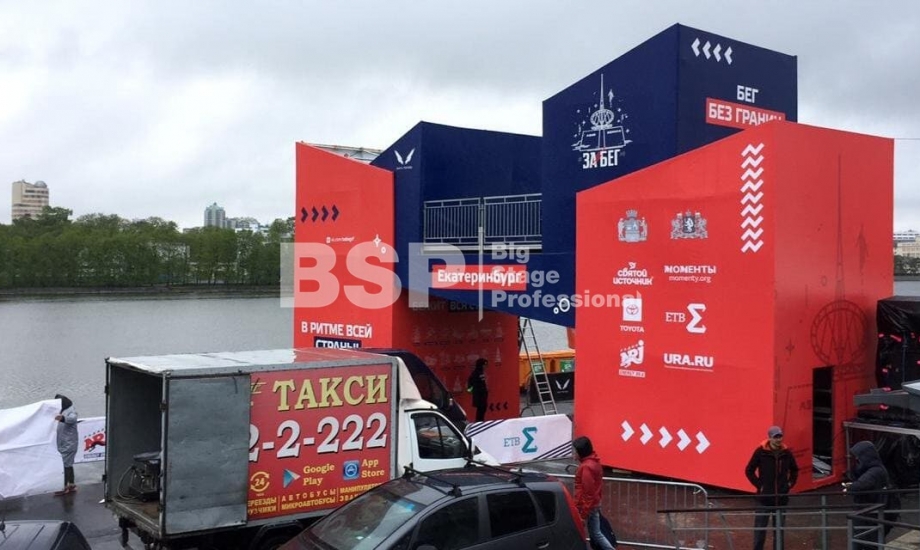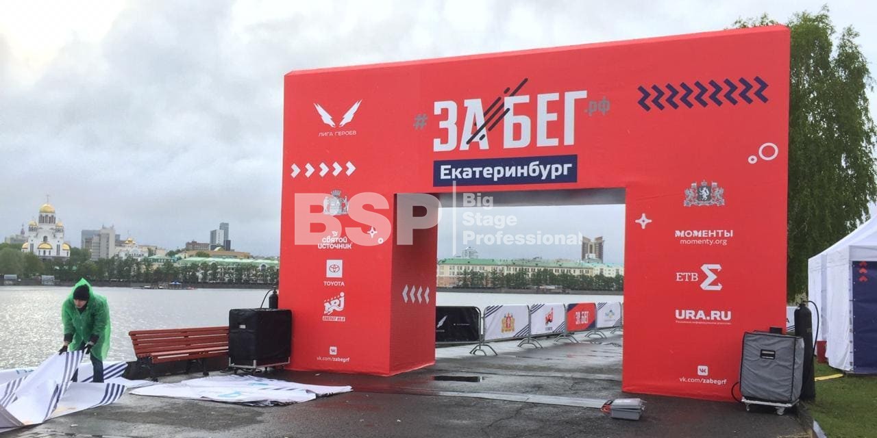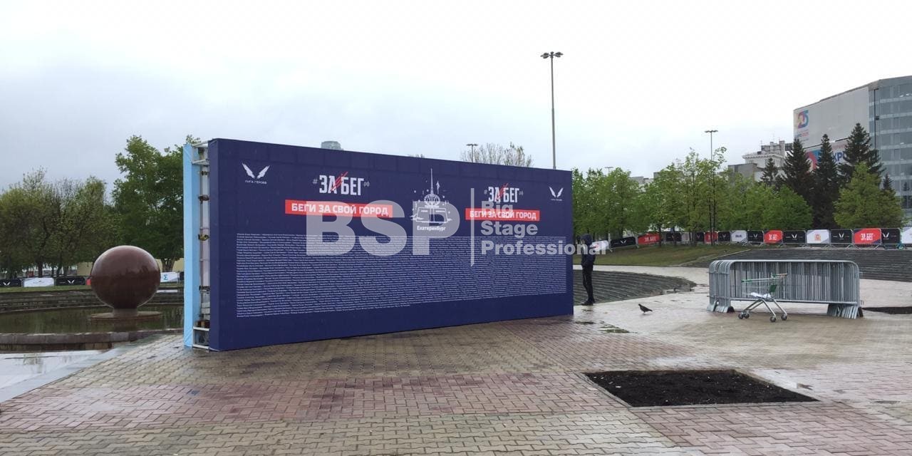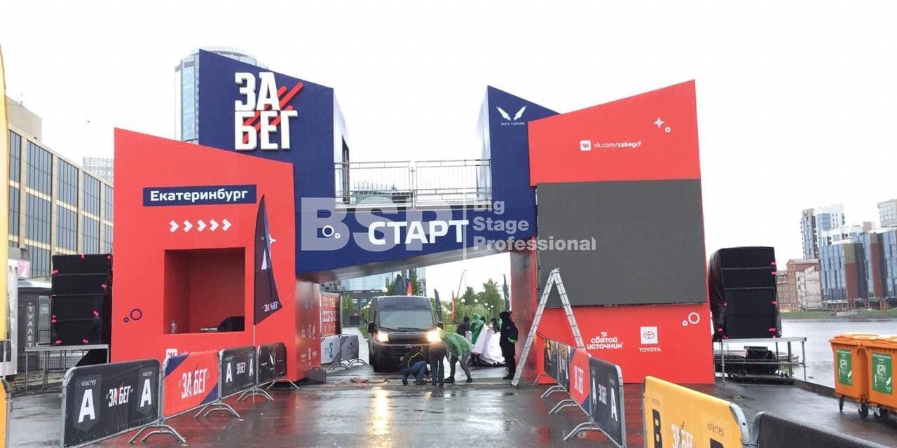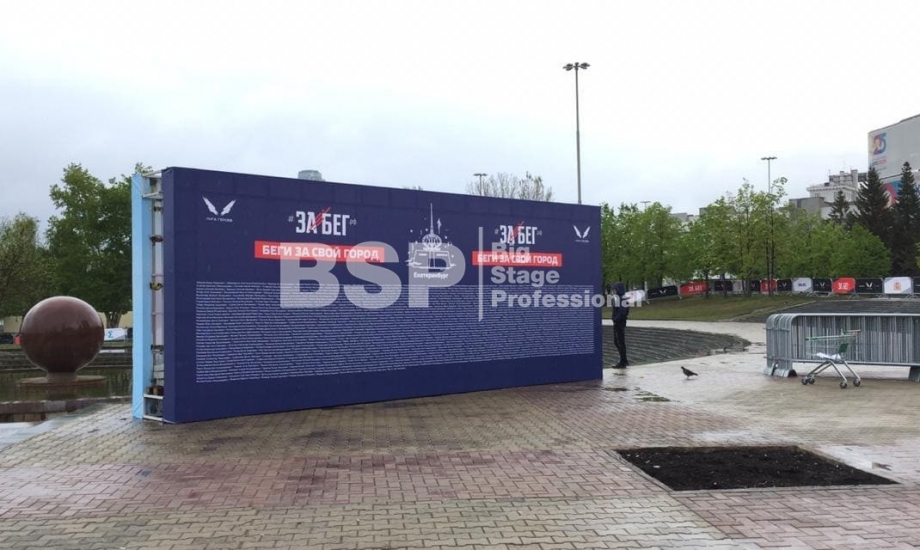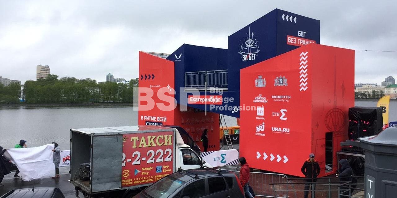 На Октябрьской площади мы установили стартовую арку с балконом и конструкцией для экрана, финишную арку, пультовую, два пресс-волла, один из которых был двусторонний, подиумы для звука, гаунд с крышей для спонсора мероприятия, мобильный гардероб, звуковое, энергообеспечивающее и климат-оборудование.