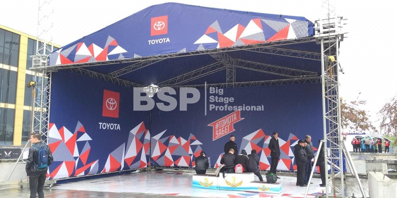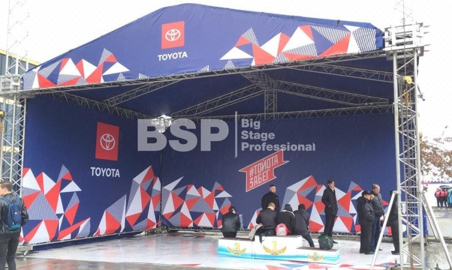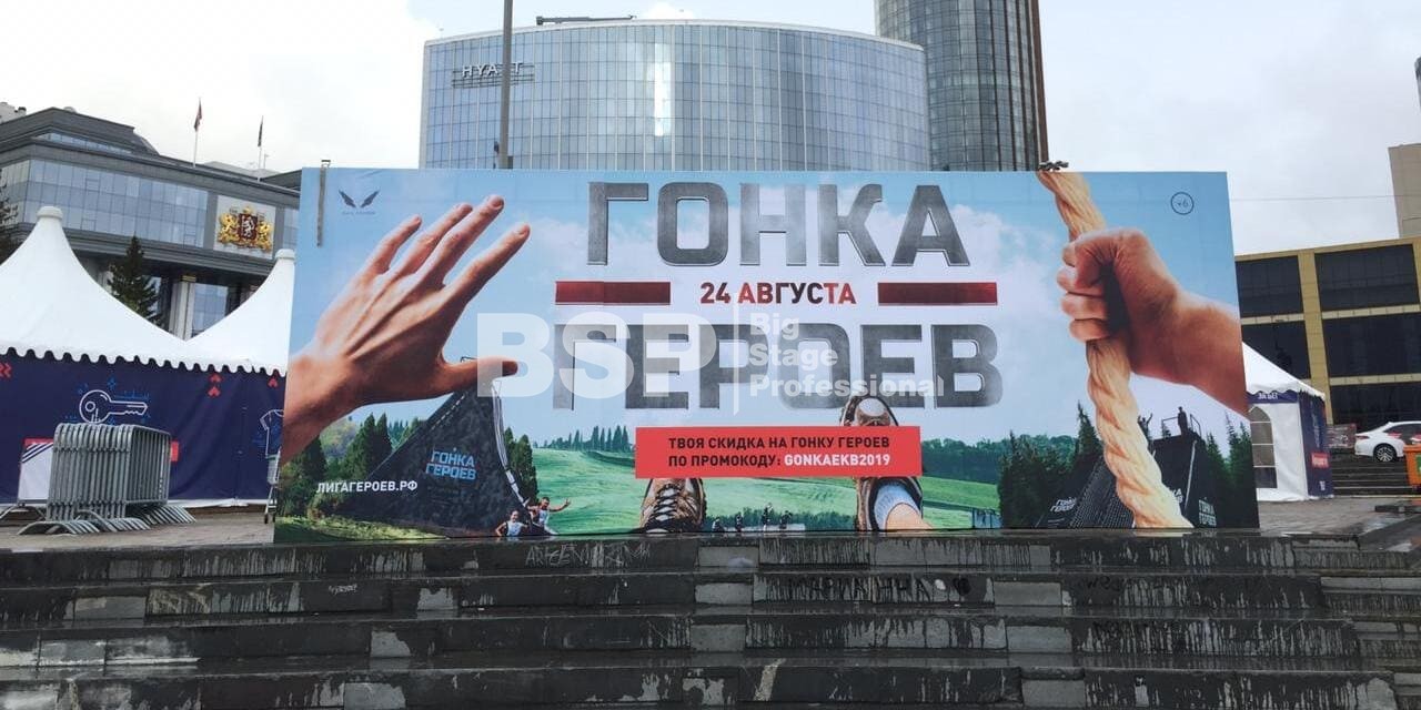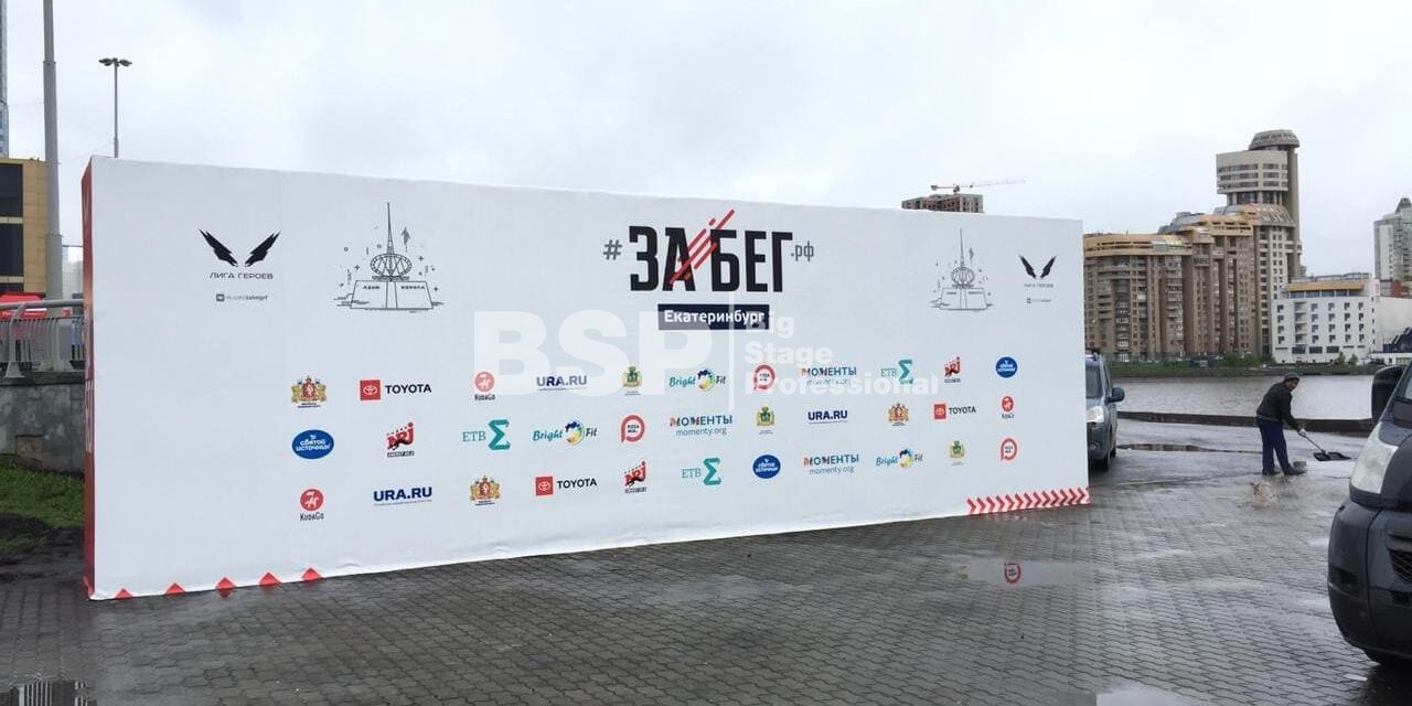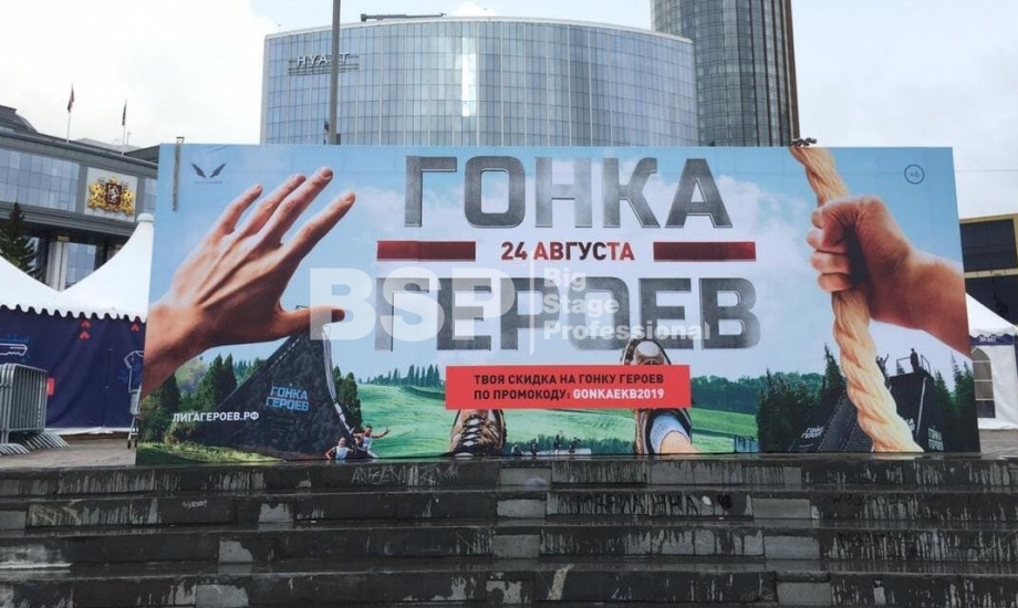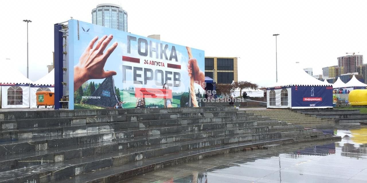 На Октябрьской площади мы установили стартовую арку с балконом и конструкцией для экрана, финишную арку, пультовую, два пресс-волла, один из которых был двусторонний, подиумы для звука, гаунд с крышей для спонсора мероприятия, мобильный гардероб, звуковое, энергообеспечивающее и климат-оборудование.